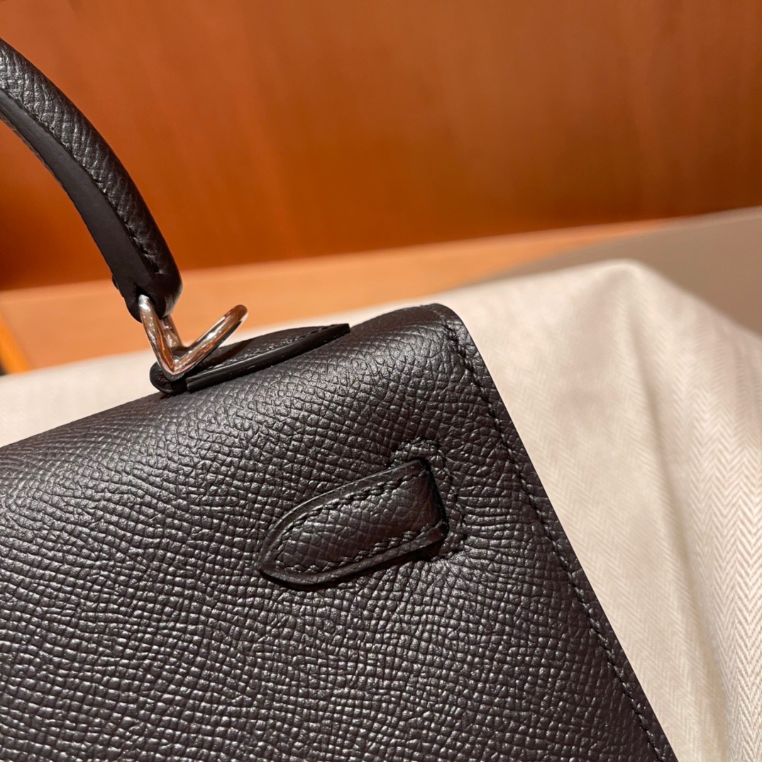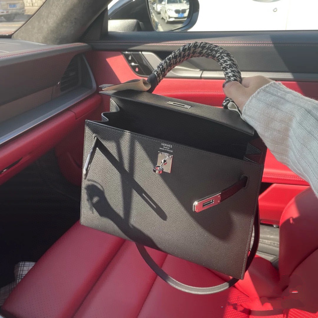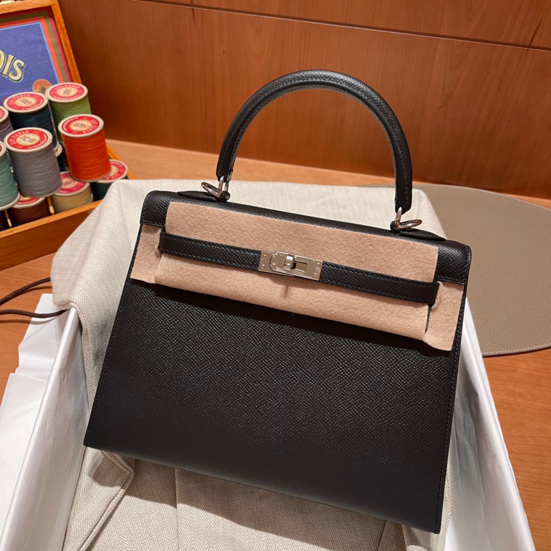 Kelly 25cm Epsom 89 Black (Noir). Silver Buckle