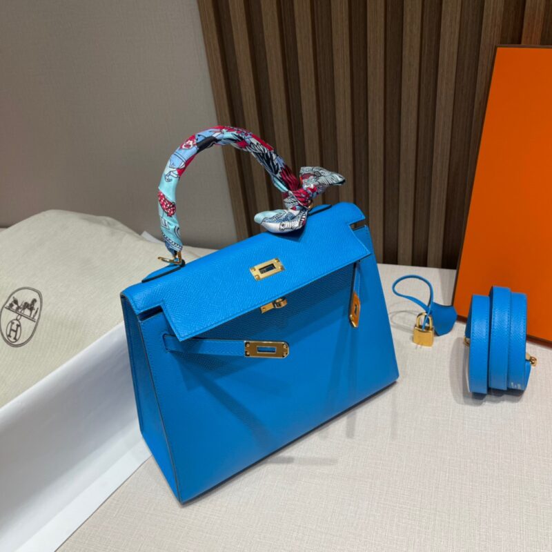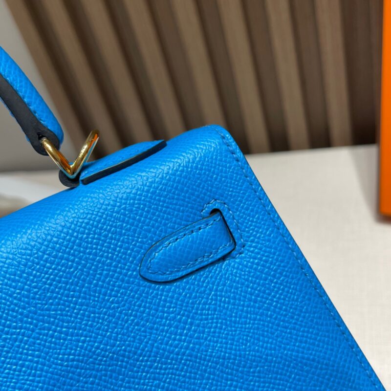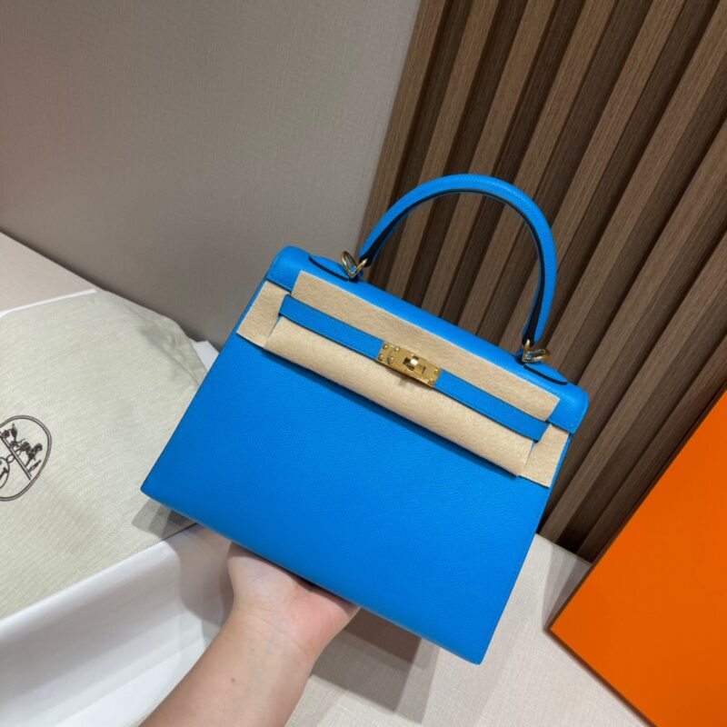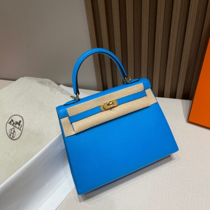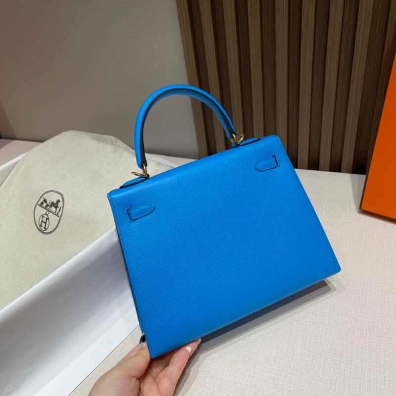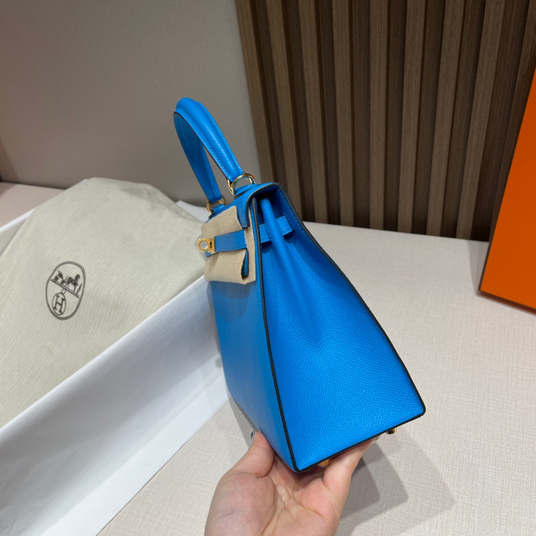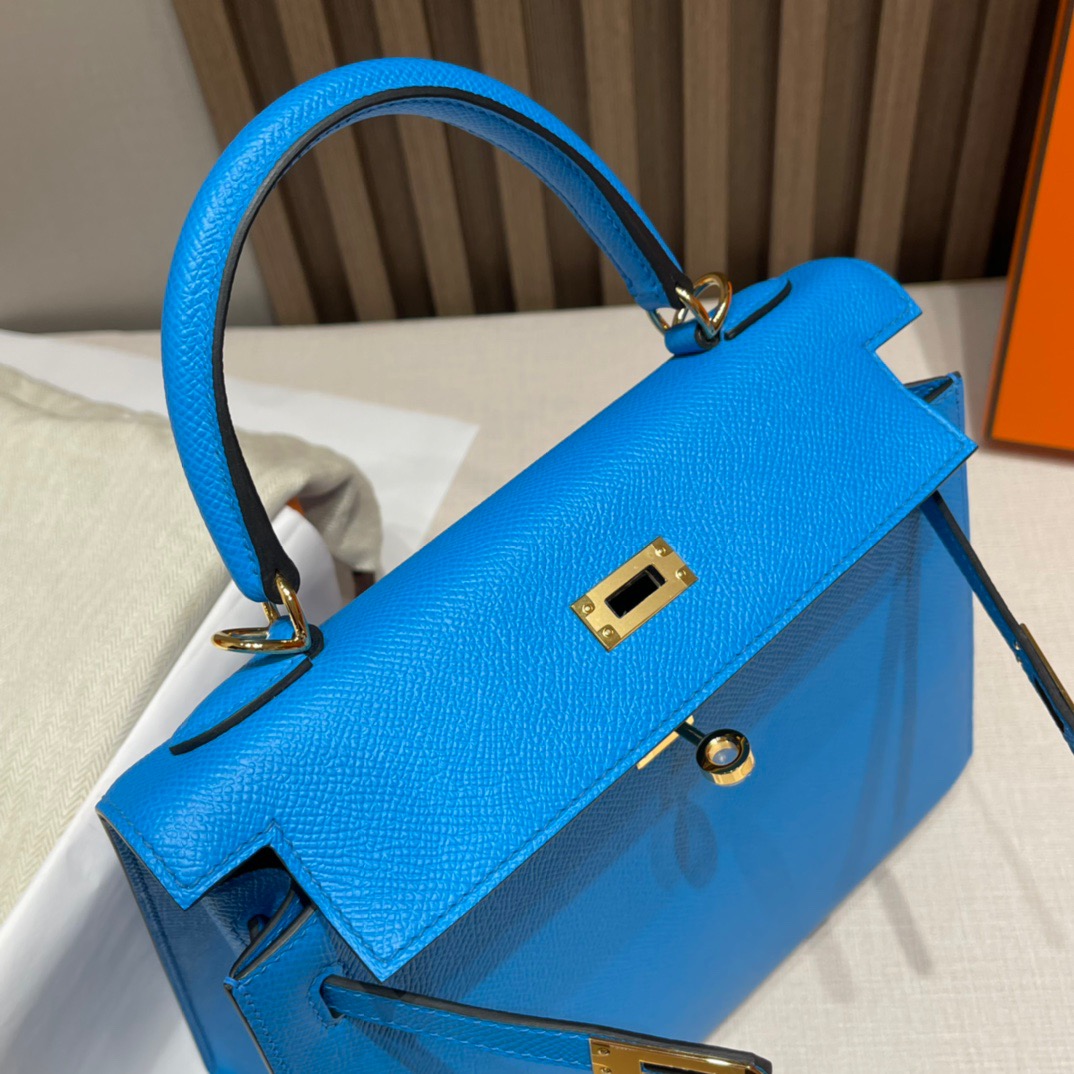 Kelly 25cm Epsom Leather. 0F Frida Blue (Blue Frida). Gold Buckle