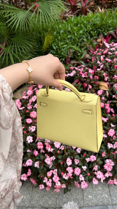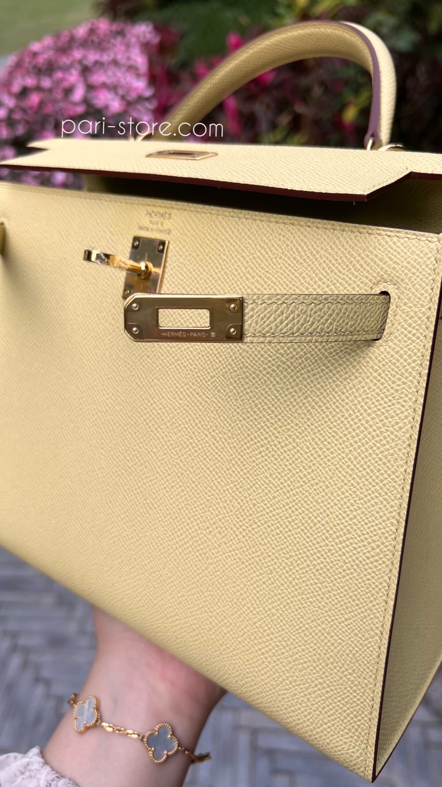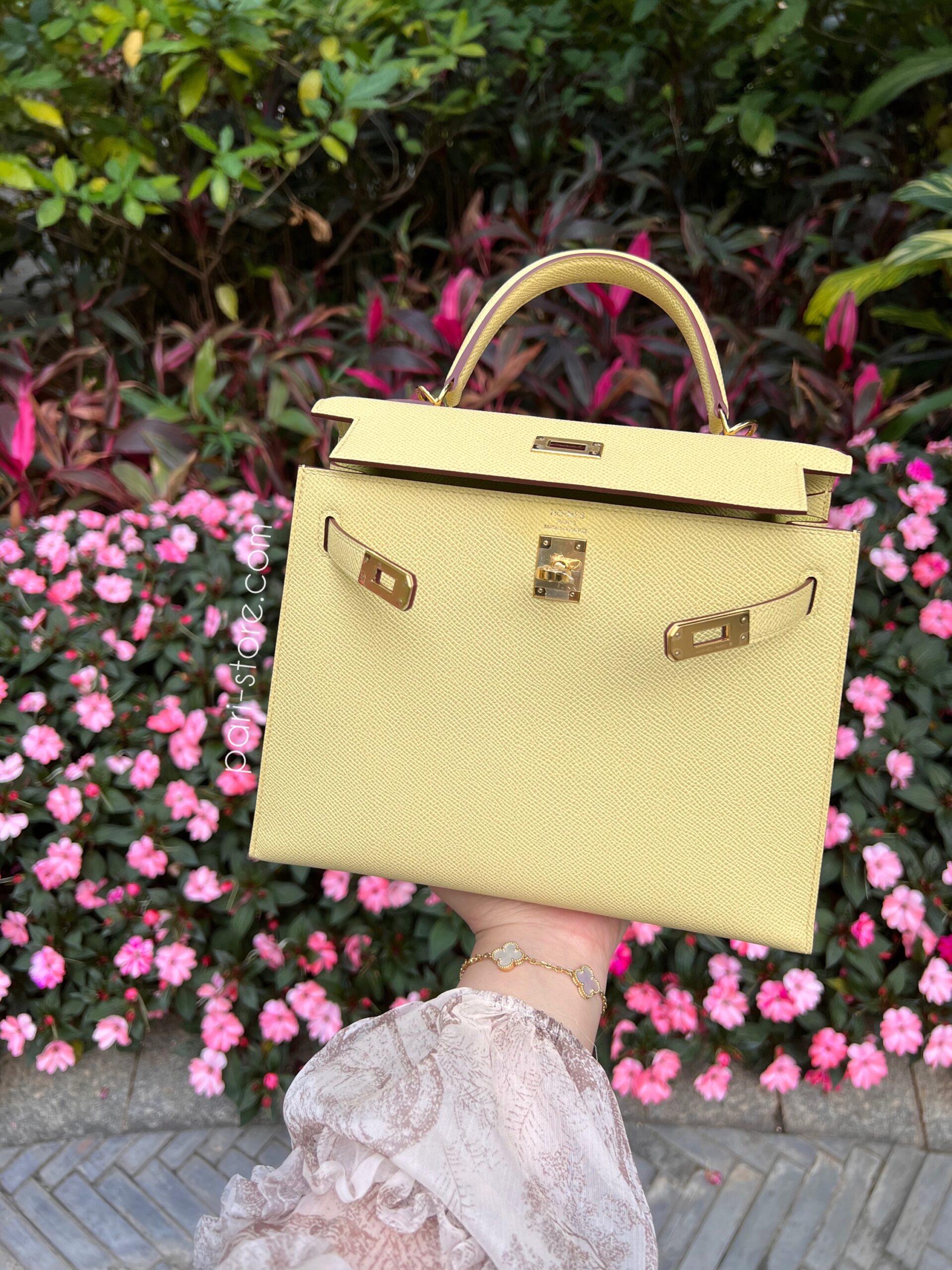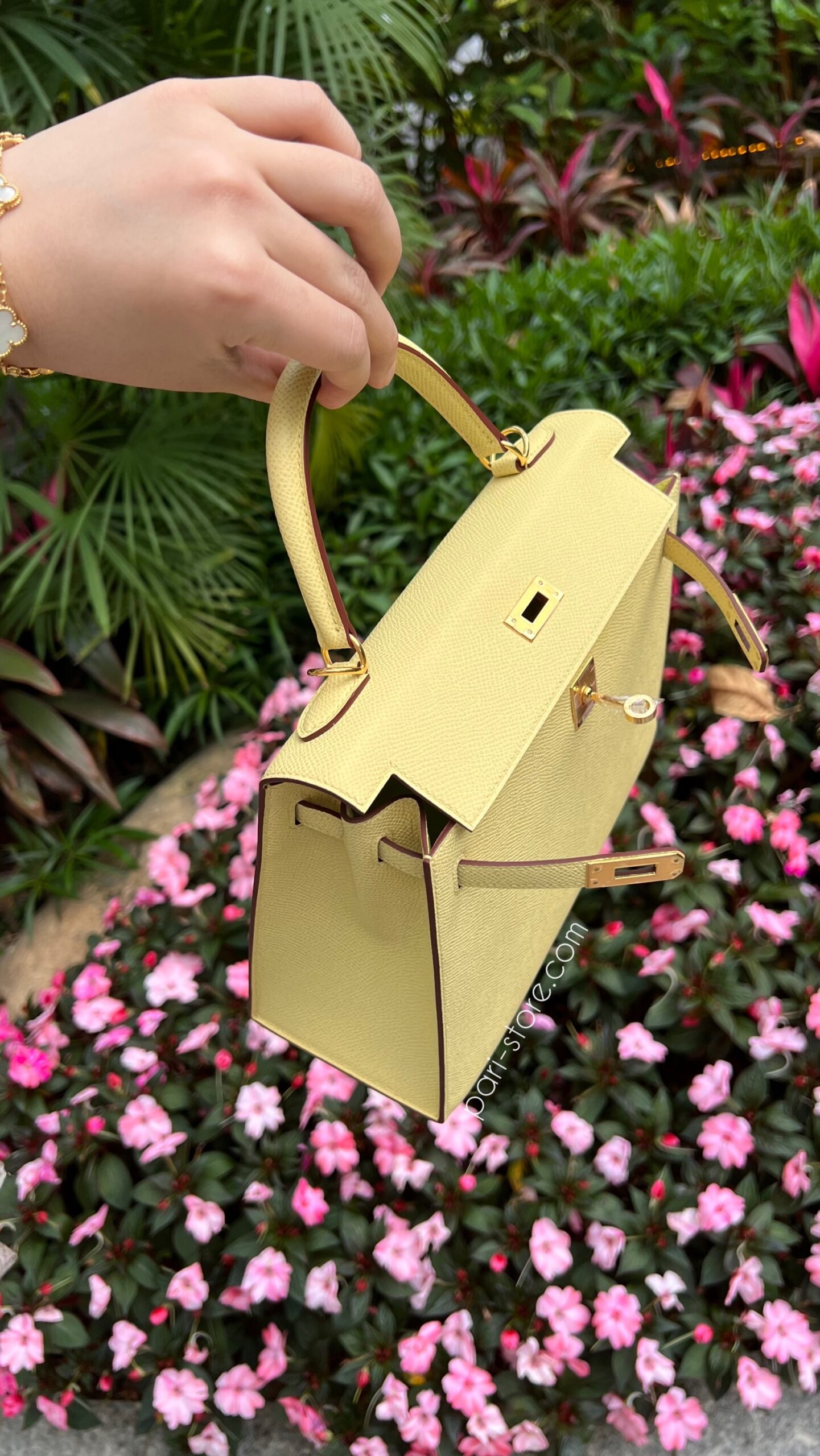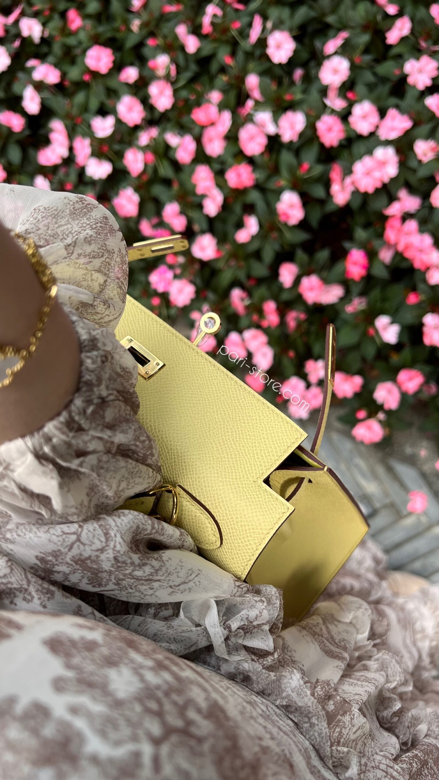 Kelly 25 in Jaune Poussin Epsom leather. Fully hand-sewn with beeswax threads. Gold hardware.