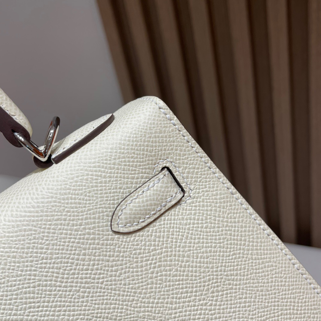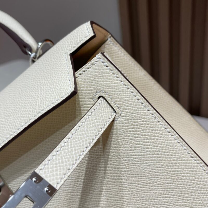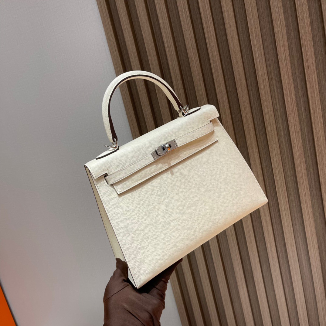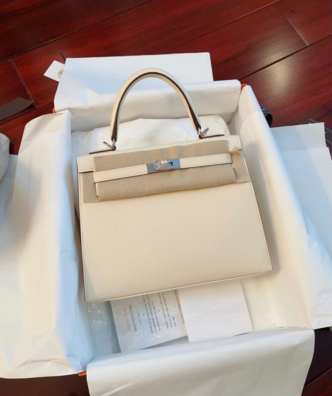 Kelly 25cm Epsom leather. i2 Creamy White (Nata). Silver Buckle