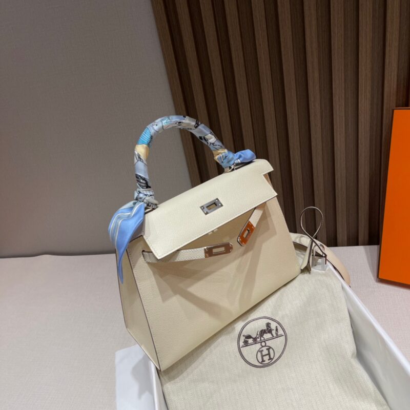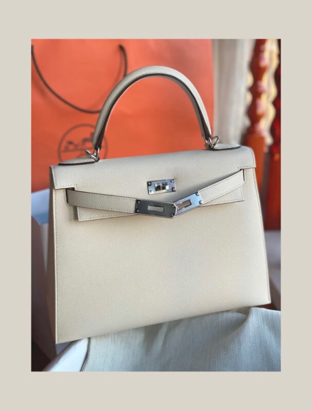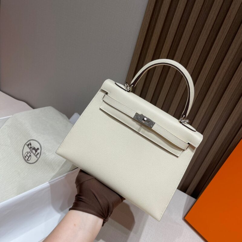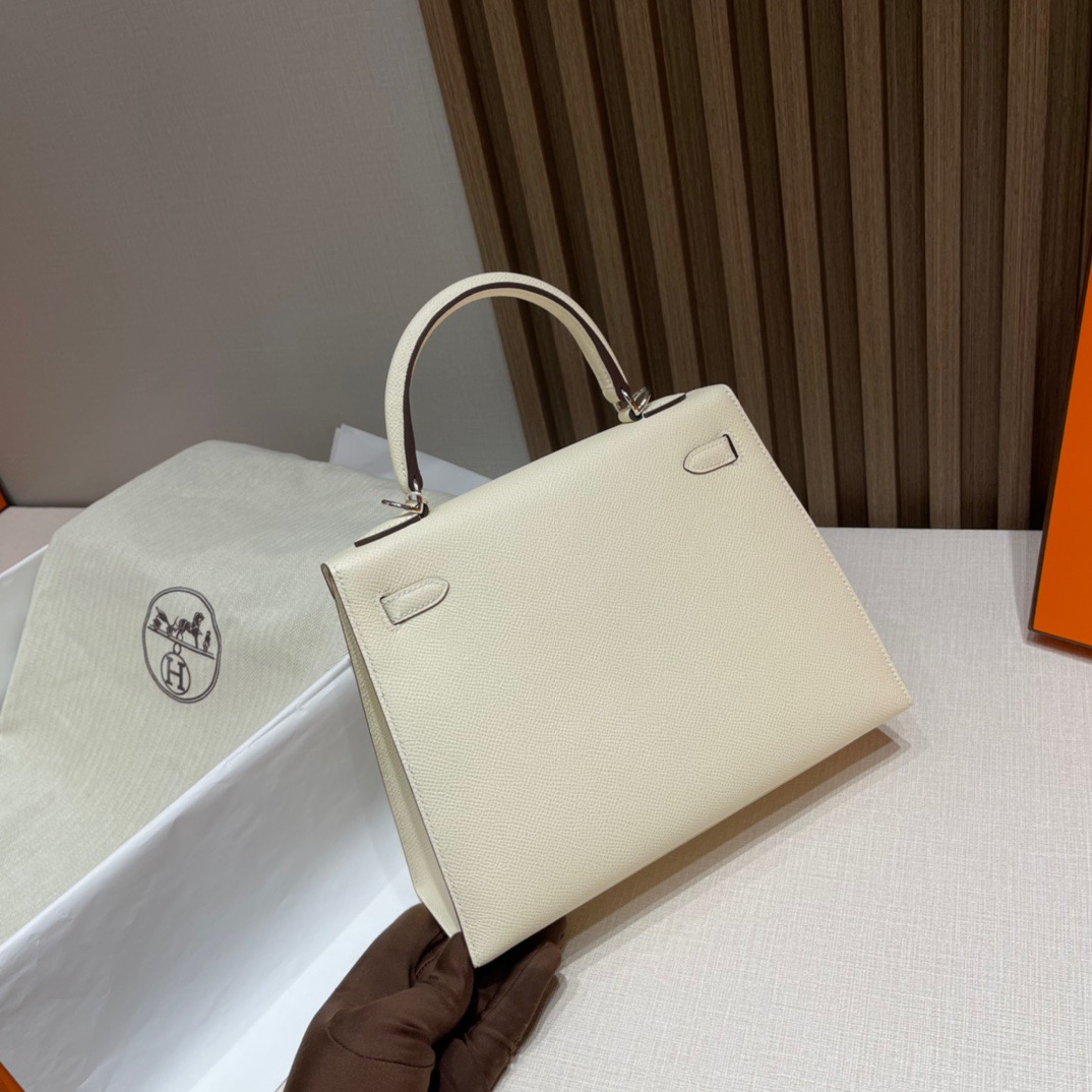 Kelly 25cm Epsom leather. i2 Creamy White (Nata). Silver Buckle