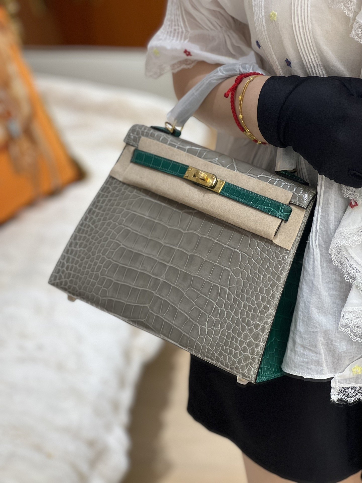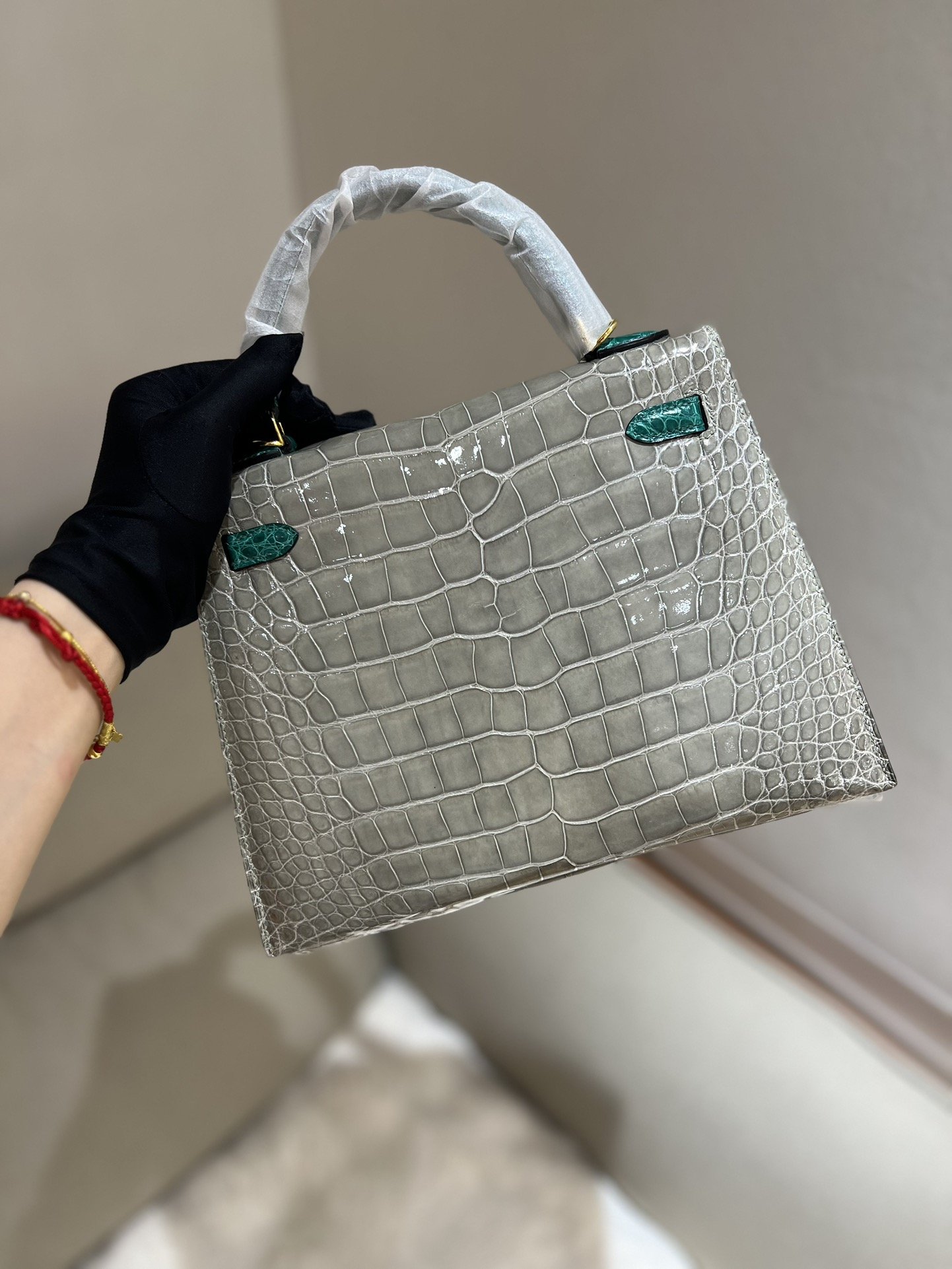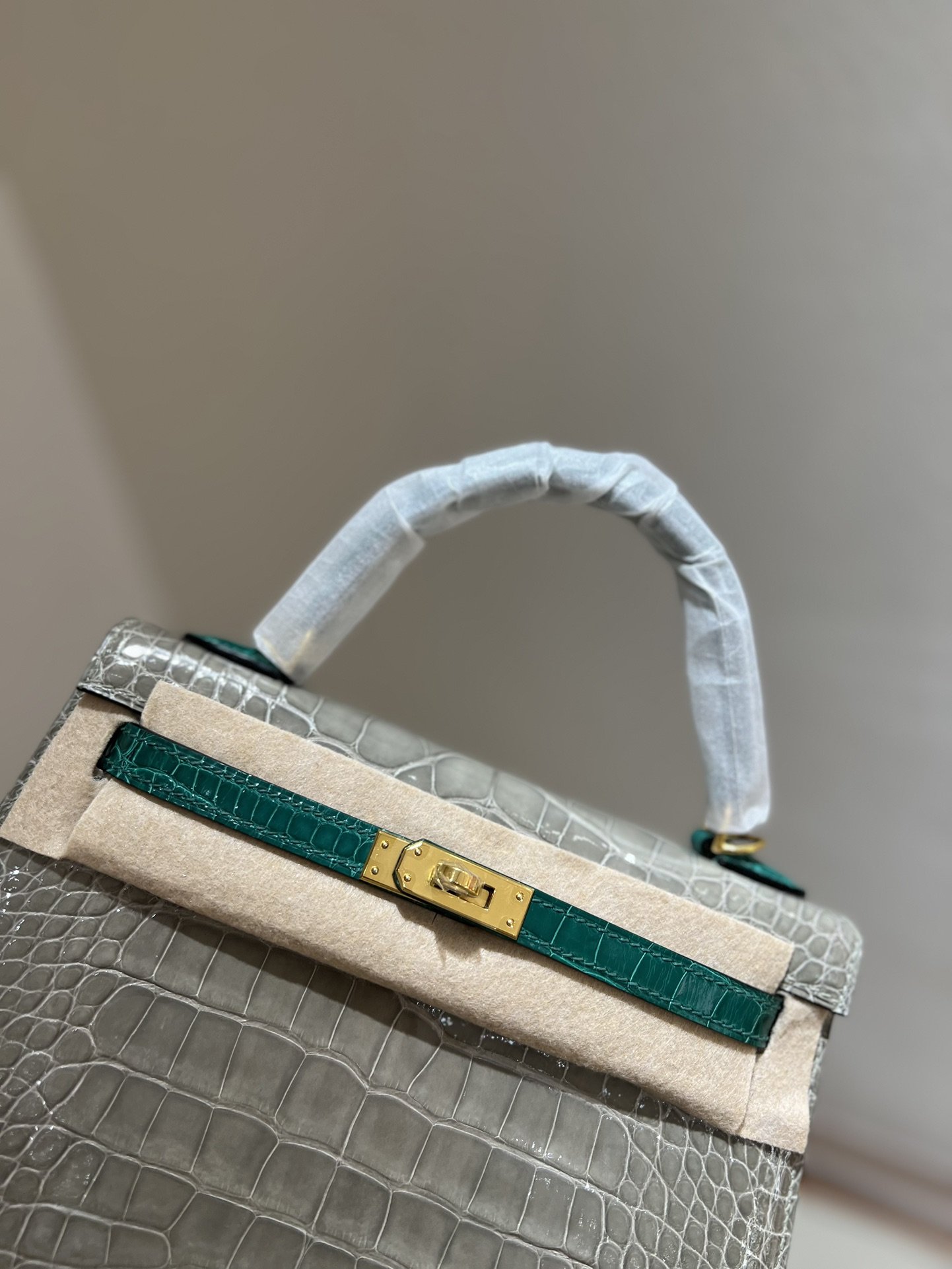 Kelly 25 in Gris Tourterelle & Emerald Shiny Alligator