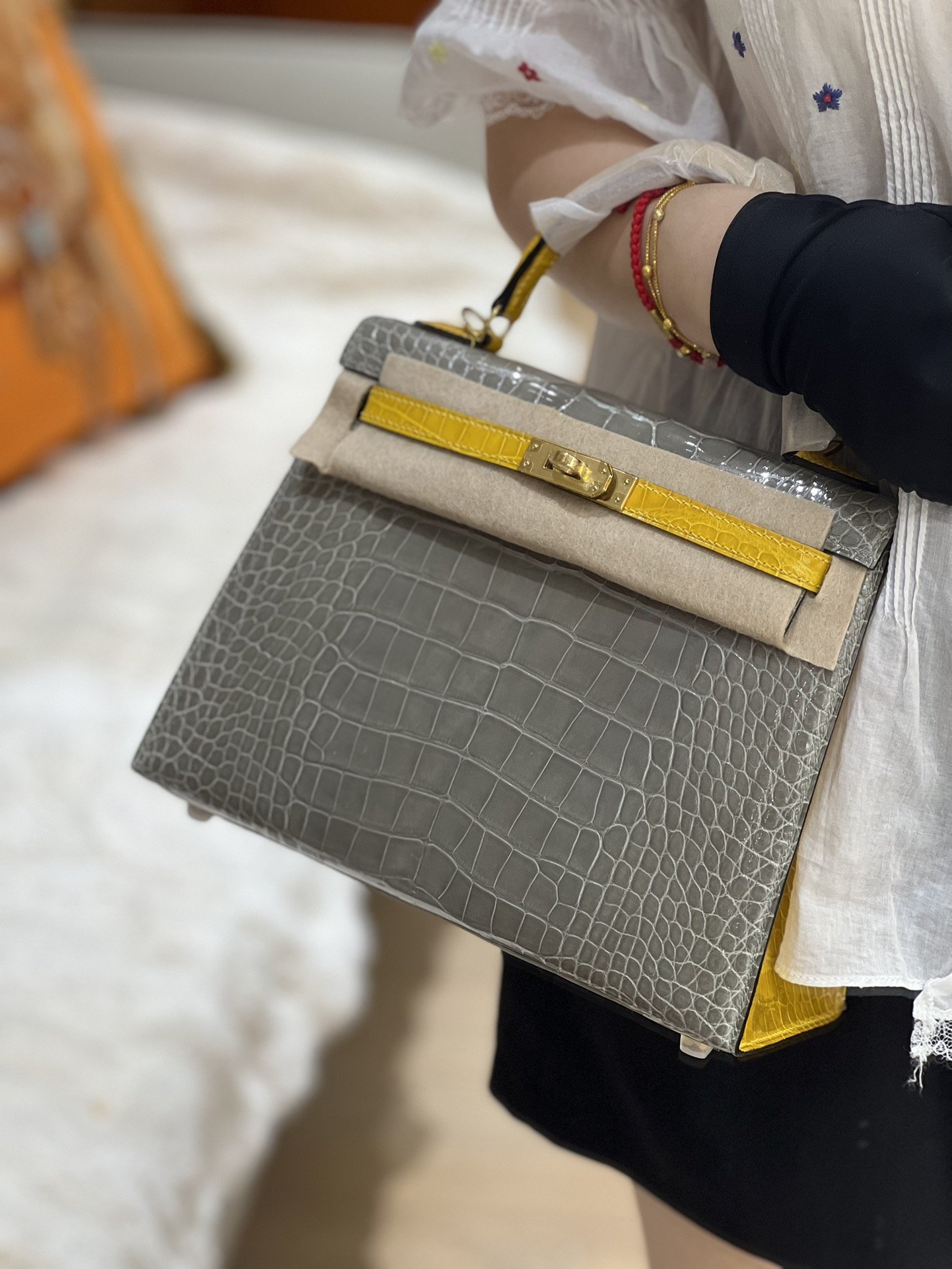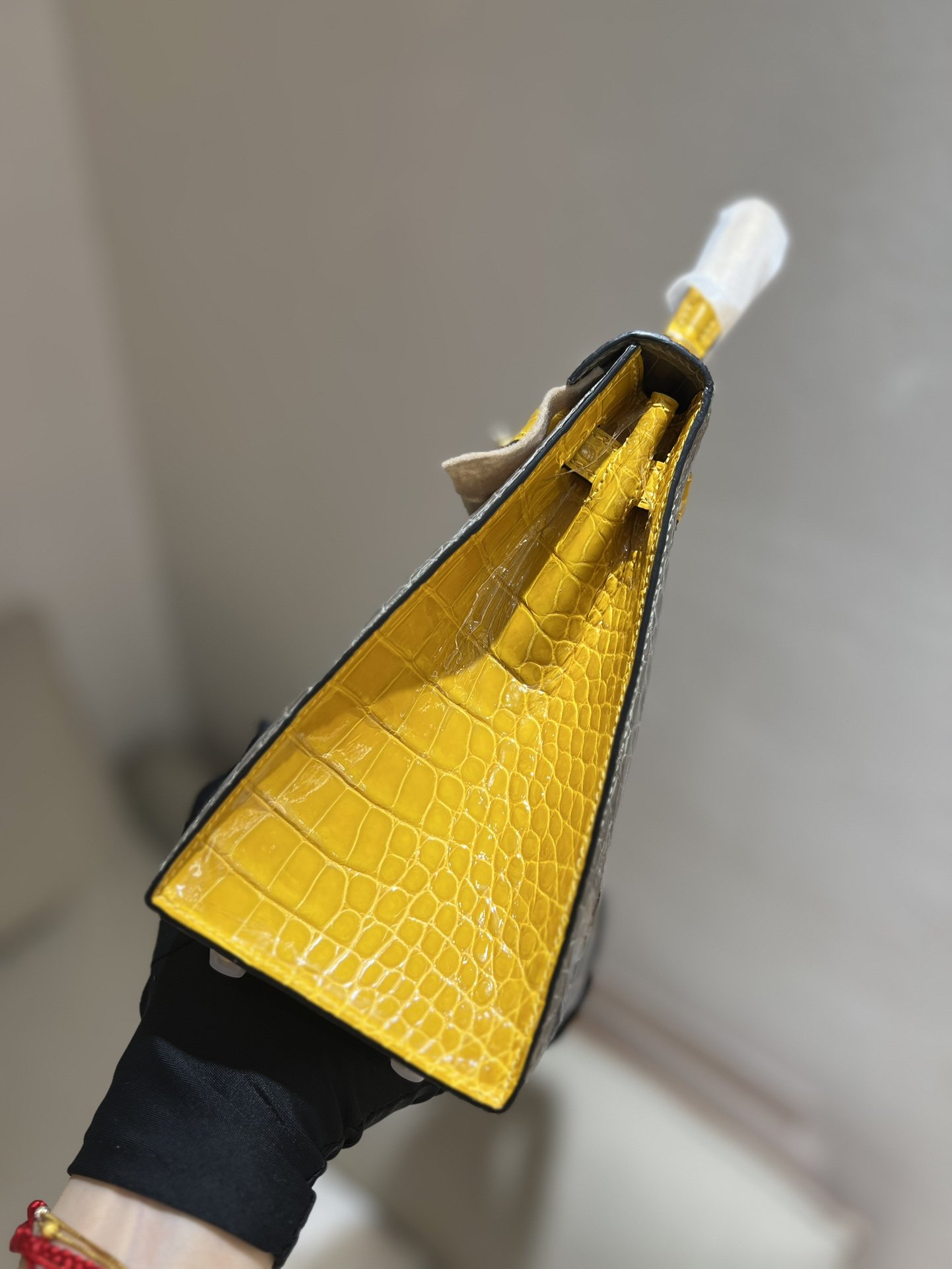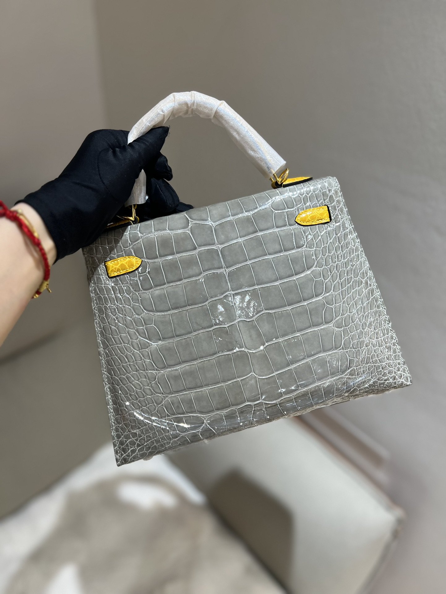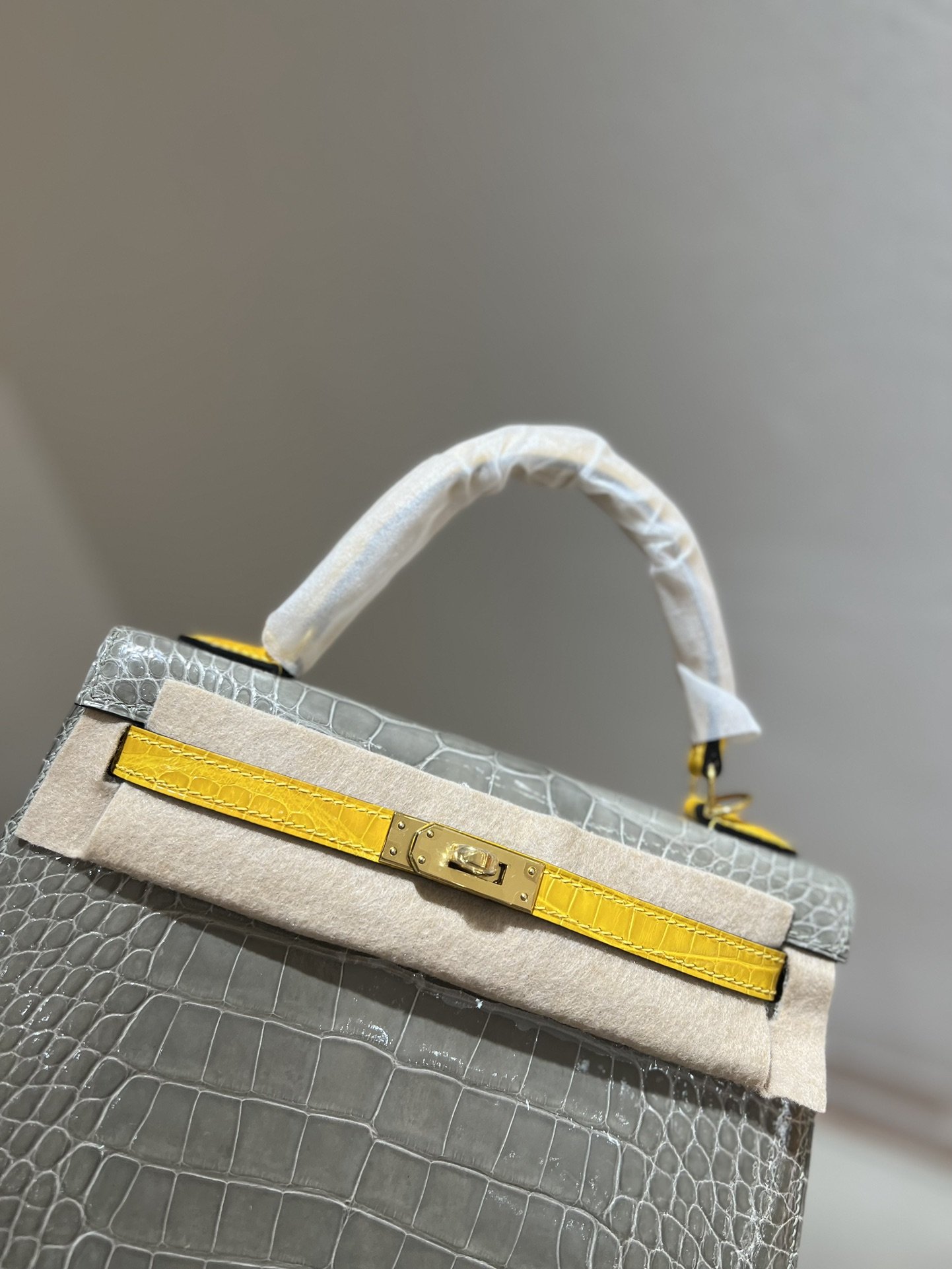 Kelly 25 in Gris Tourterelle & Jaune Ambre Shiny Alligator PHW |