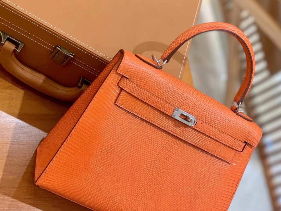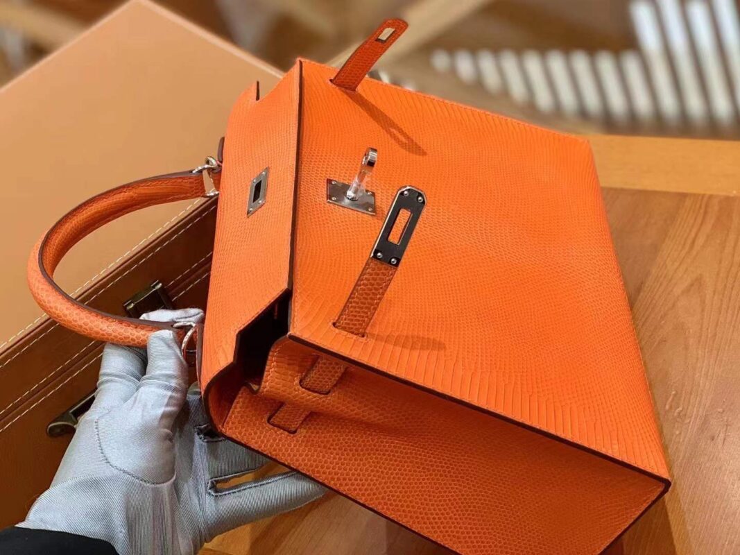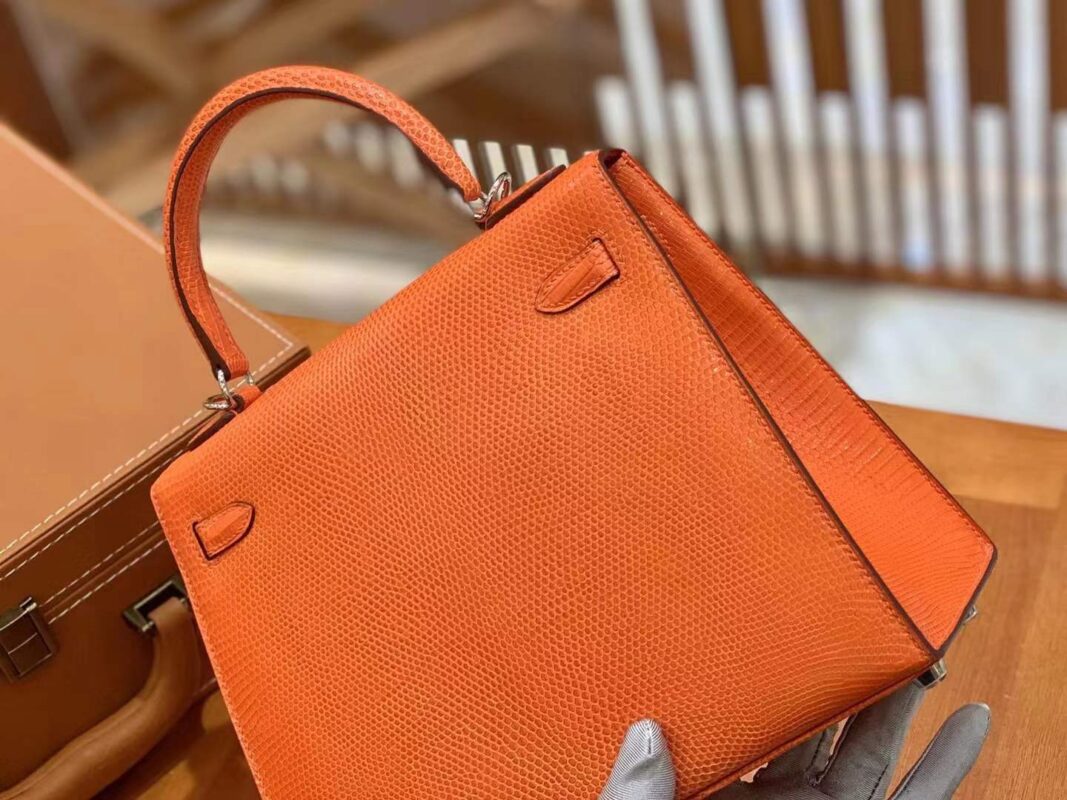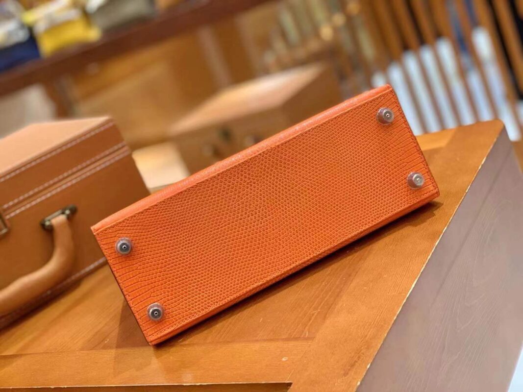 Kelly 25cm Orange Red Imported wild lizard skin. Hand-sewn