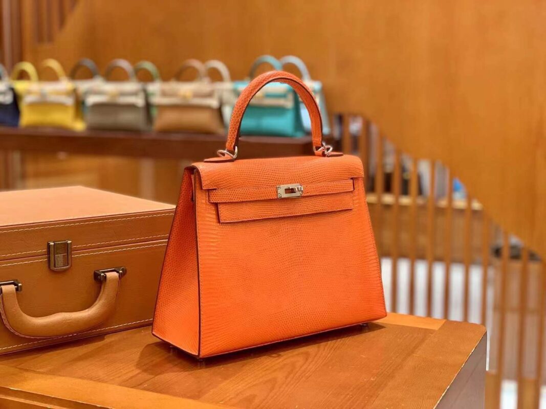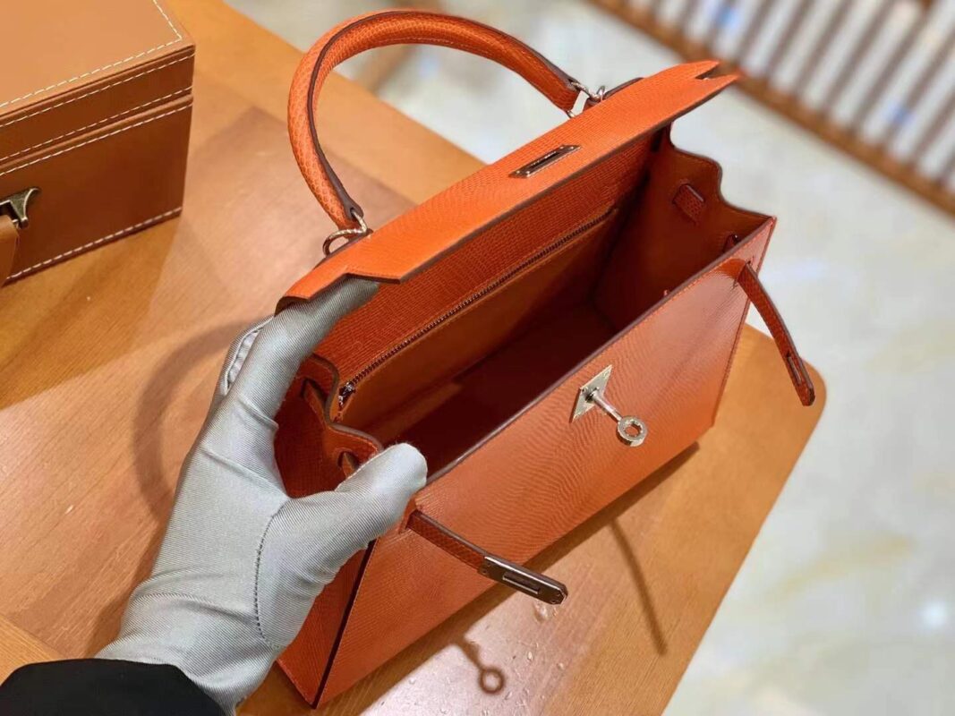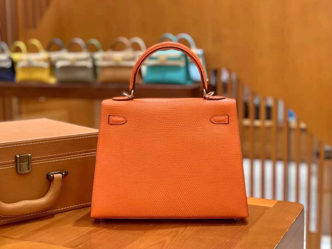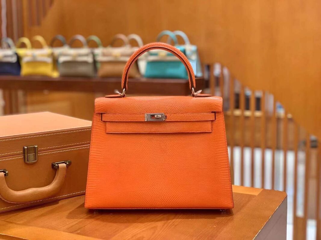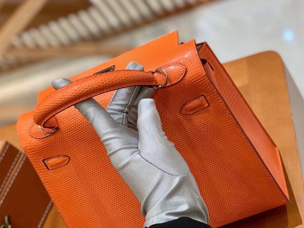 Kelly 25cm Orange Red Imported wild lizard skin. Hand-sewn