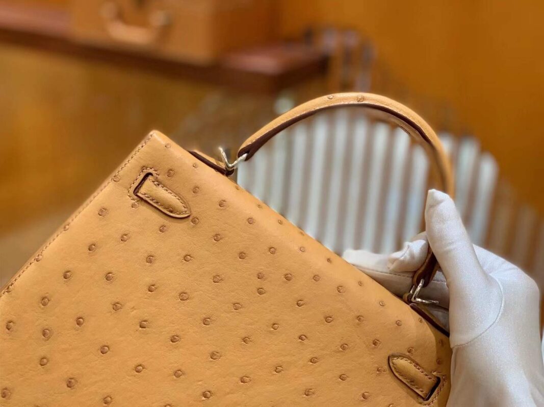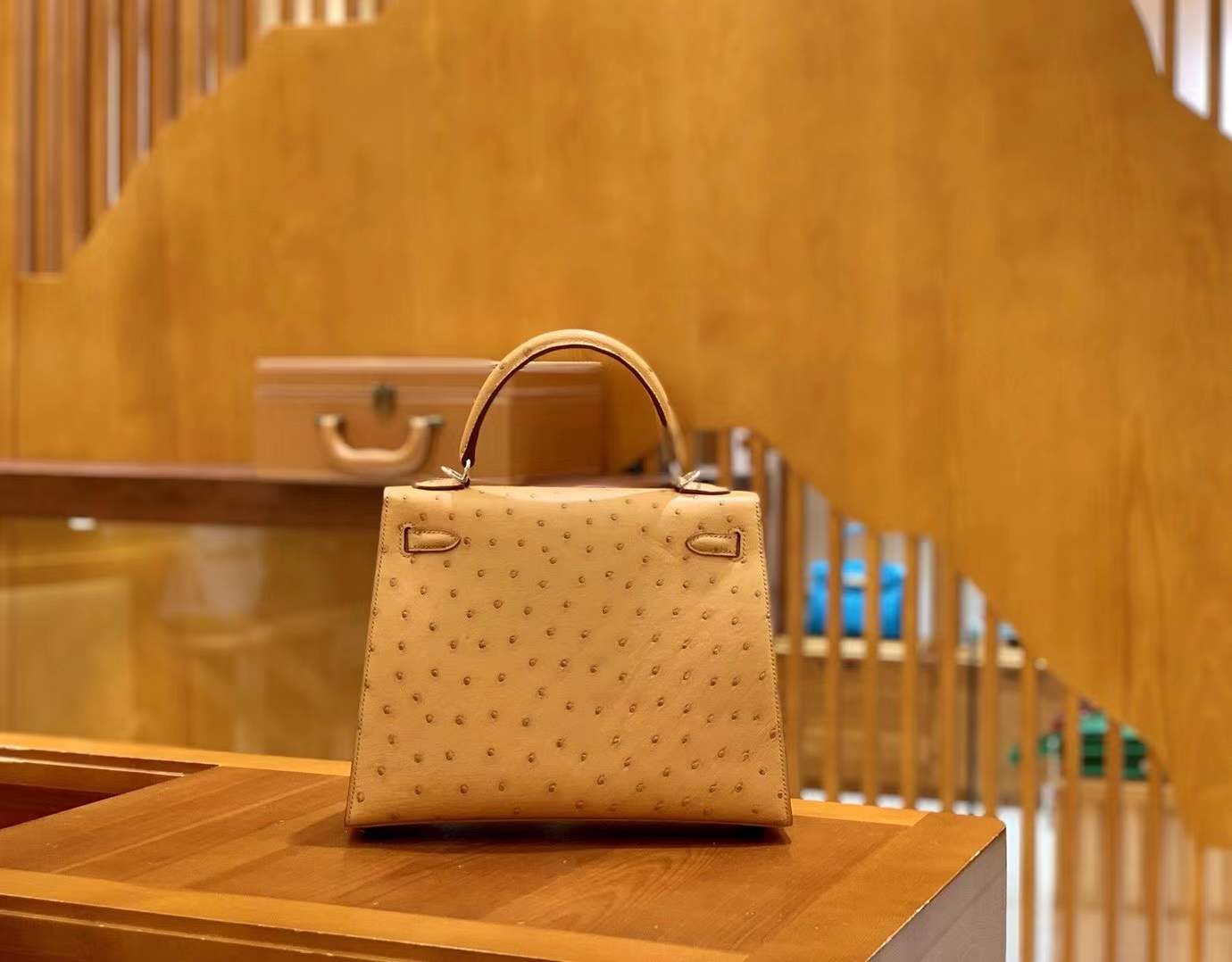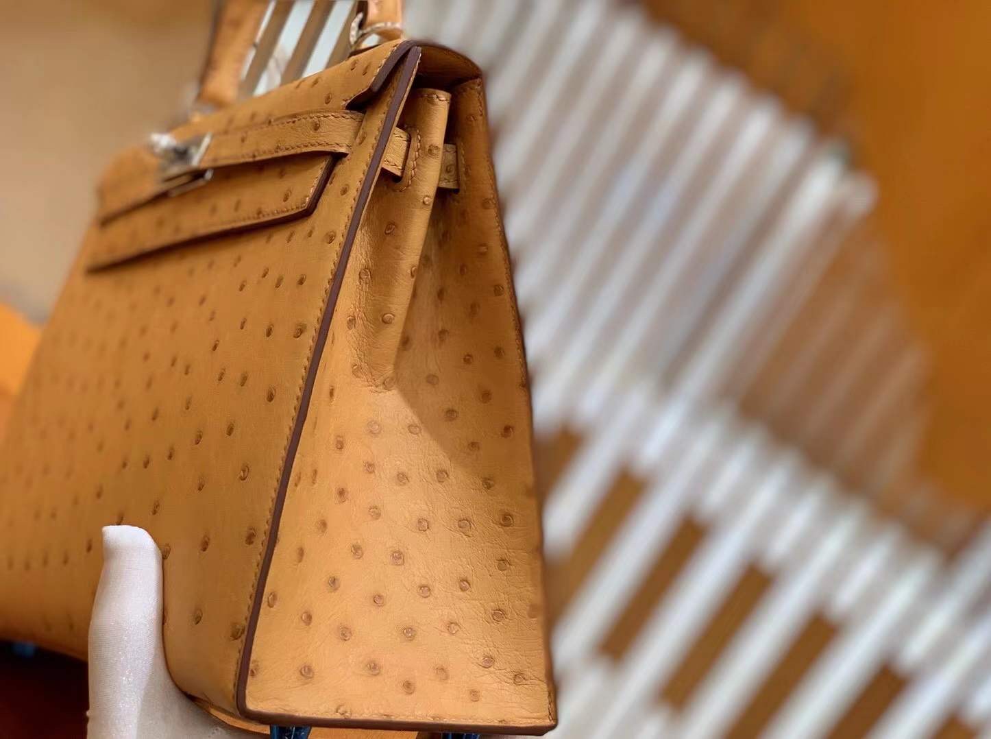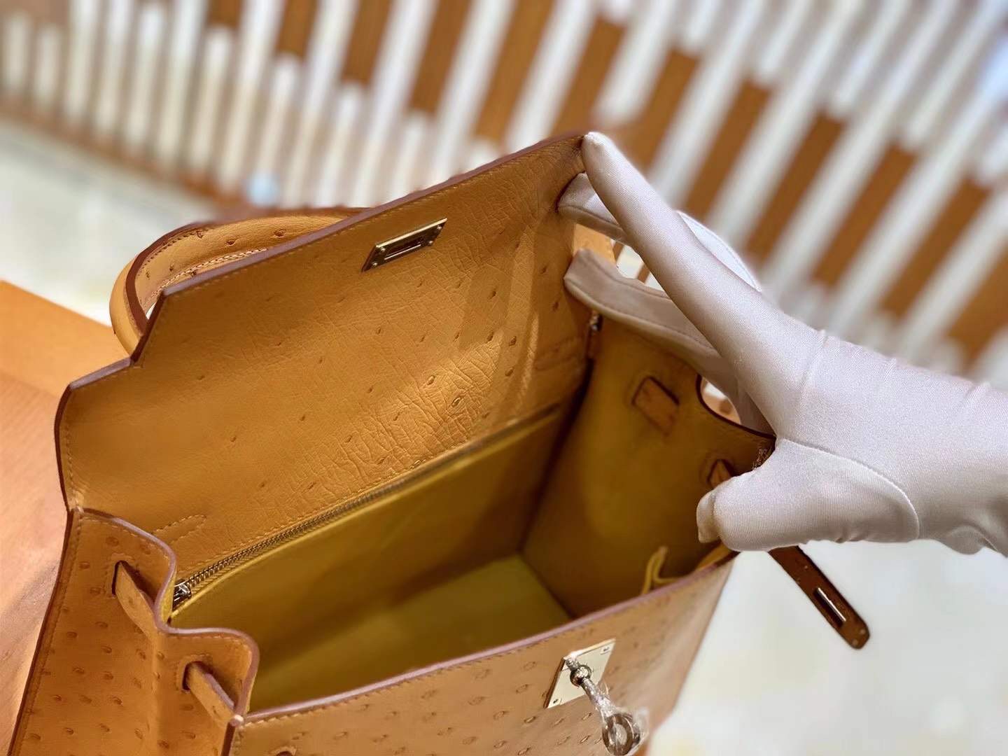Kelly 25cm Toffee Gold Silver Buckle Imported South African KK grade ostrich leather. Hand-sewn