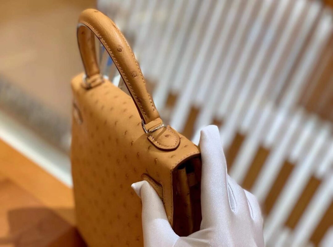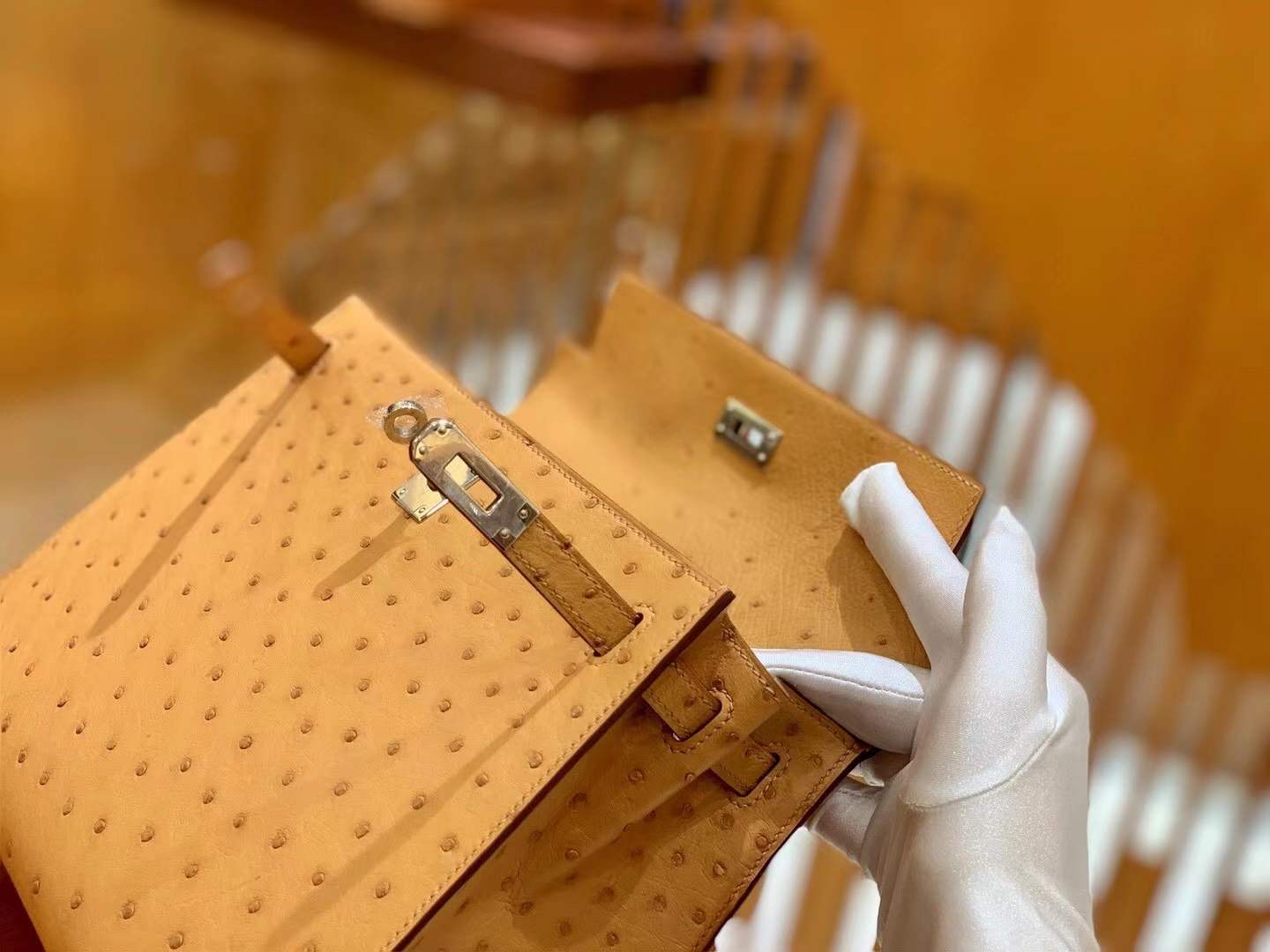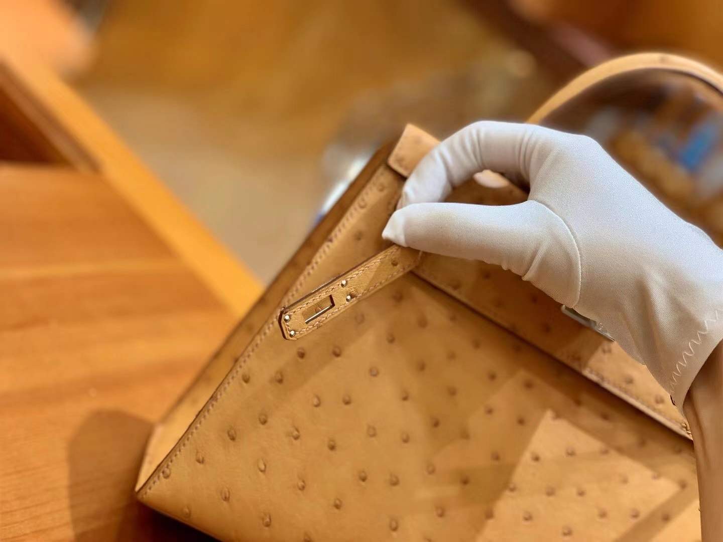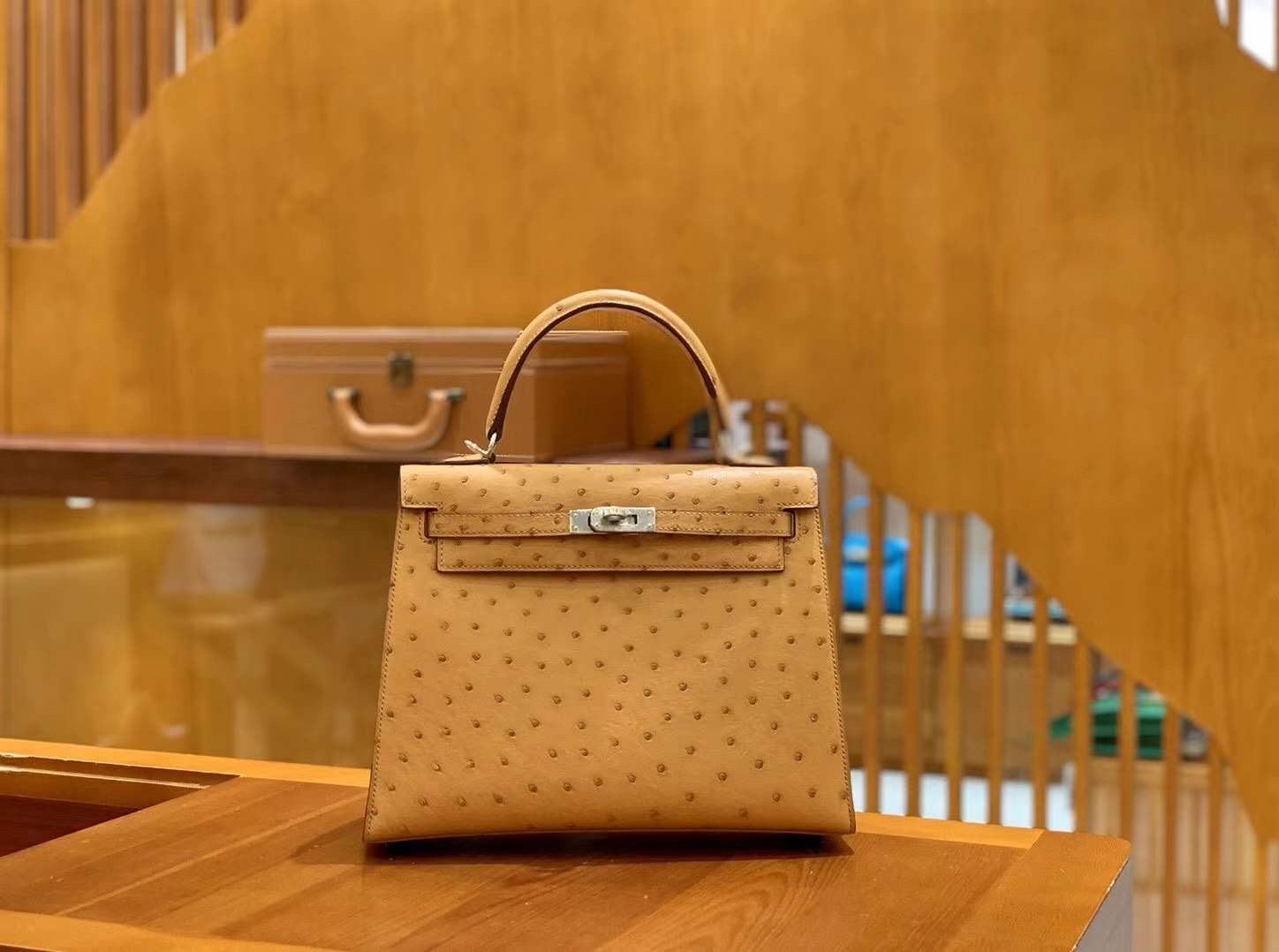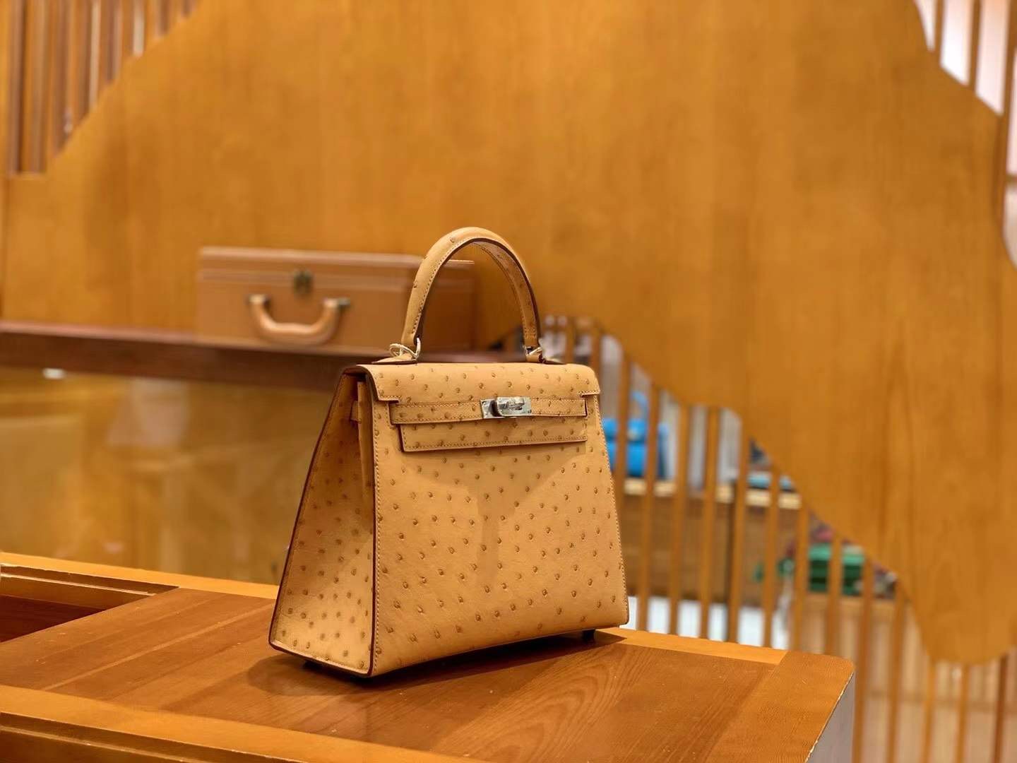 Kelly 25cm Toffee Gold Silver Buckle Imported South African KK grade ostrich leather. Hand-sewn