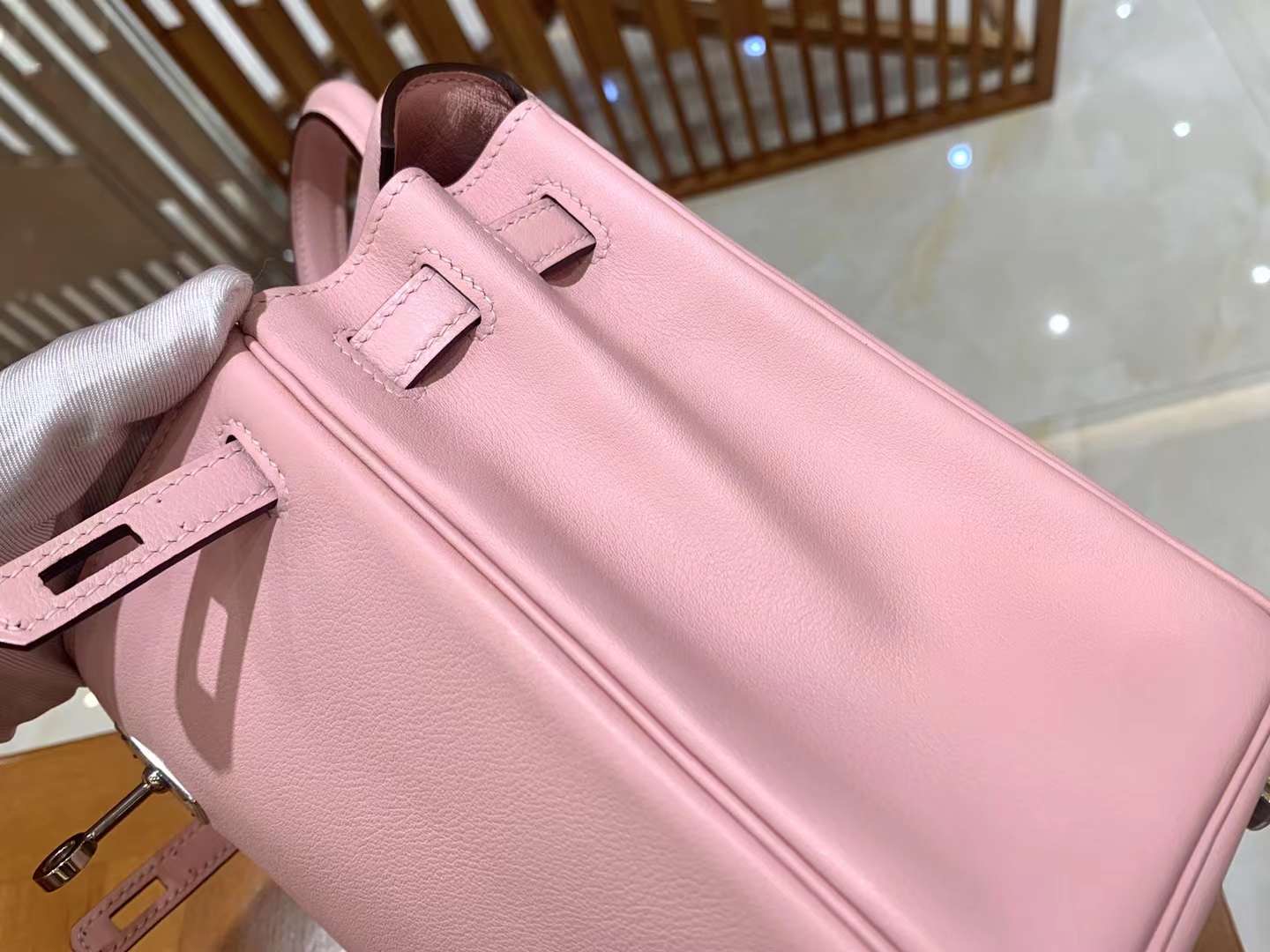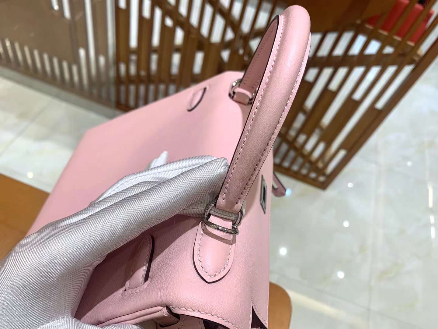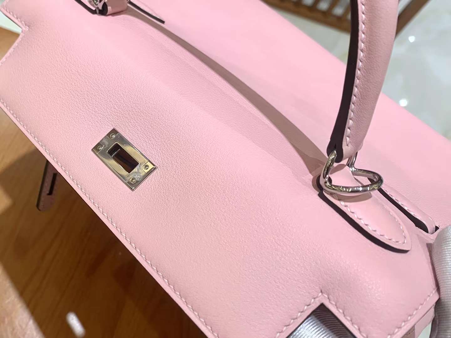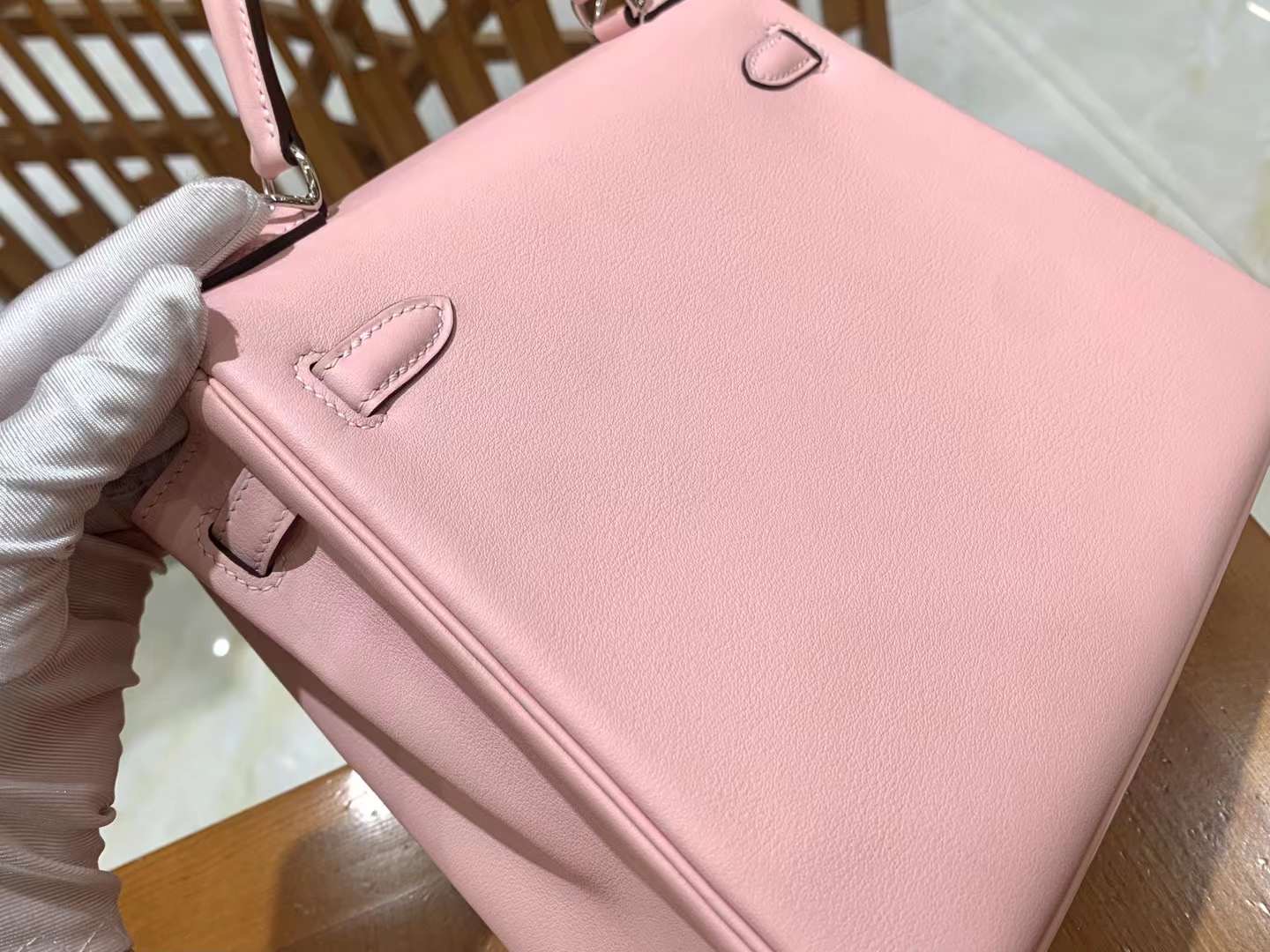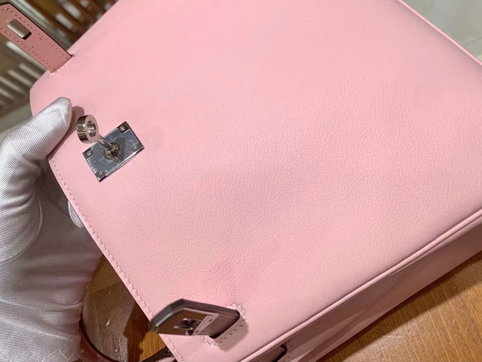 KL25cm Q Pink. Silver Buckle Imported Swift cowhide. French original beeswax thread. Fully hand-sewn