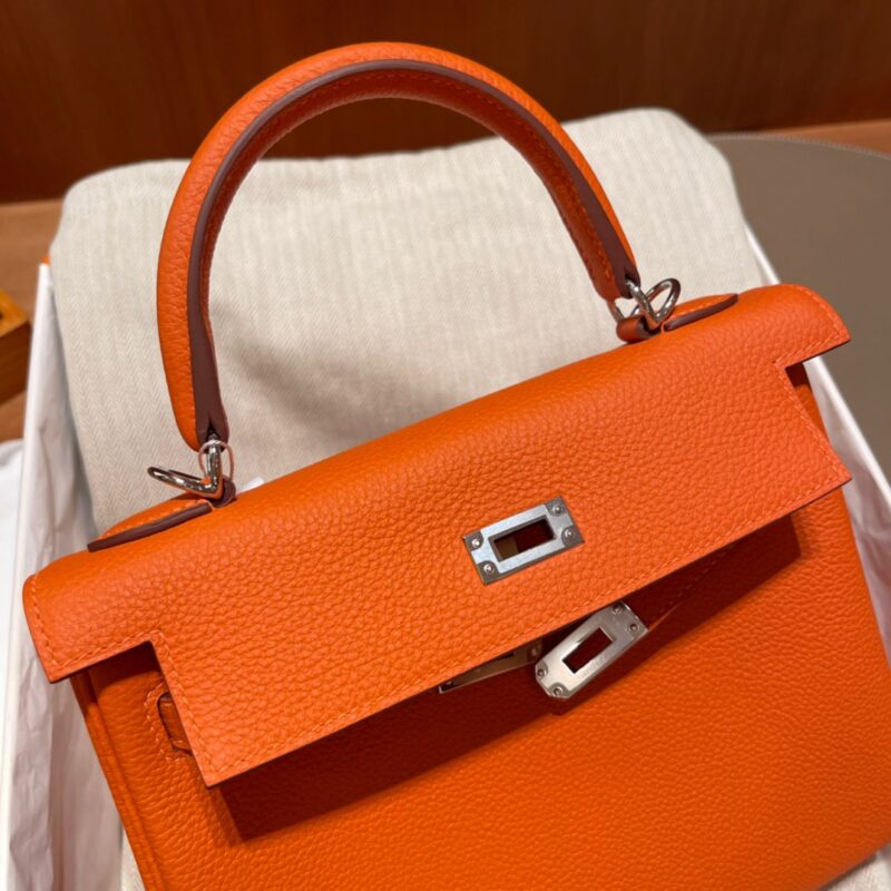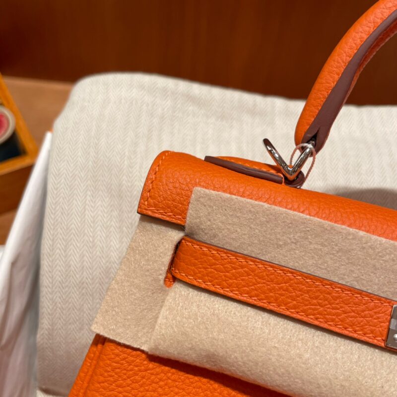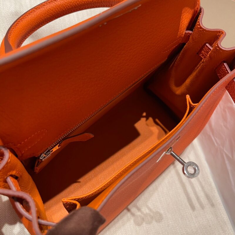 Kelly 25cm Togo leather inseam 93 Orange. Silver Buckle