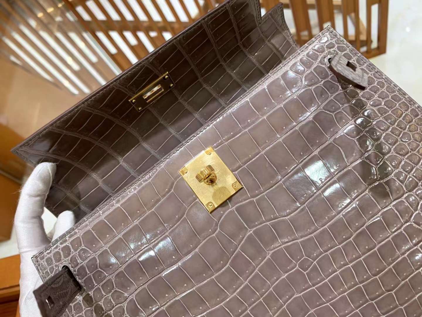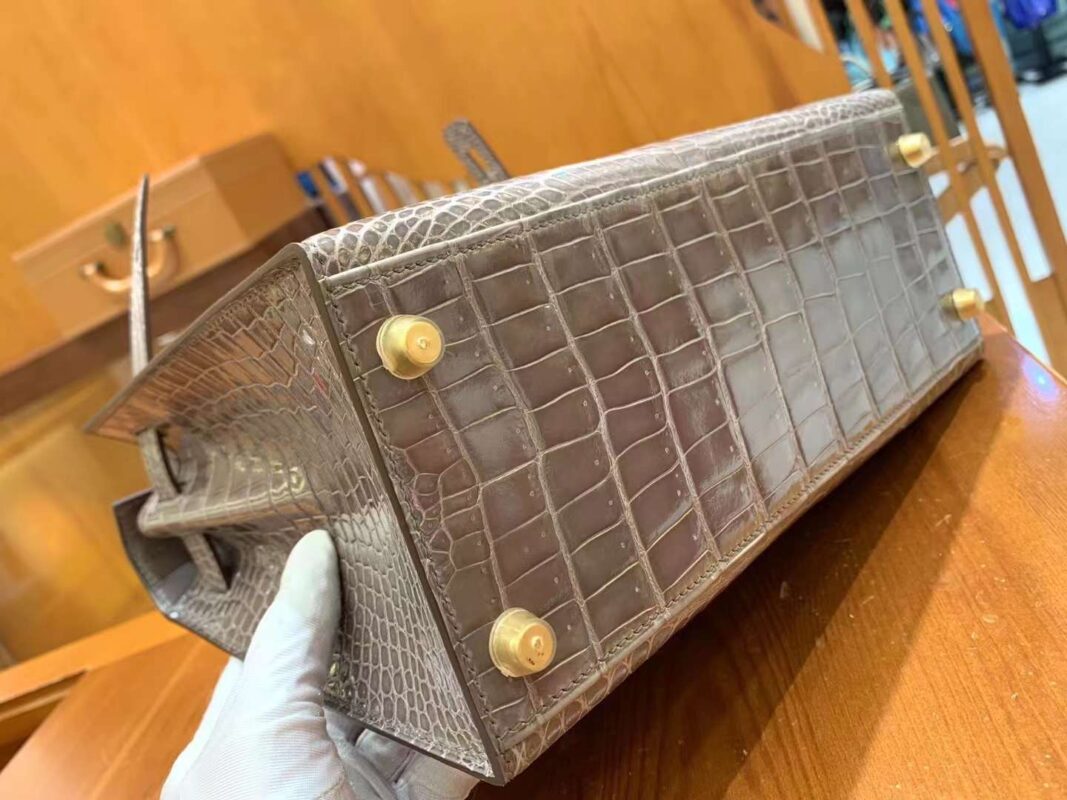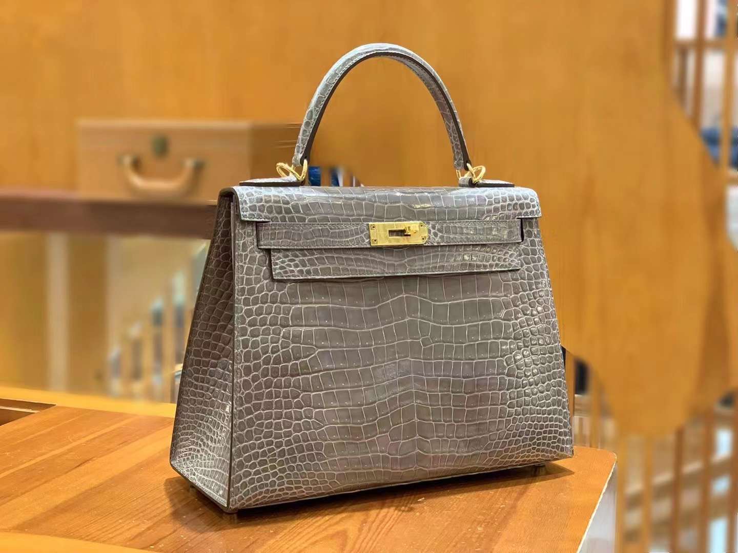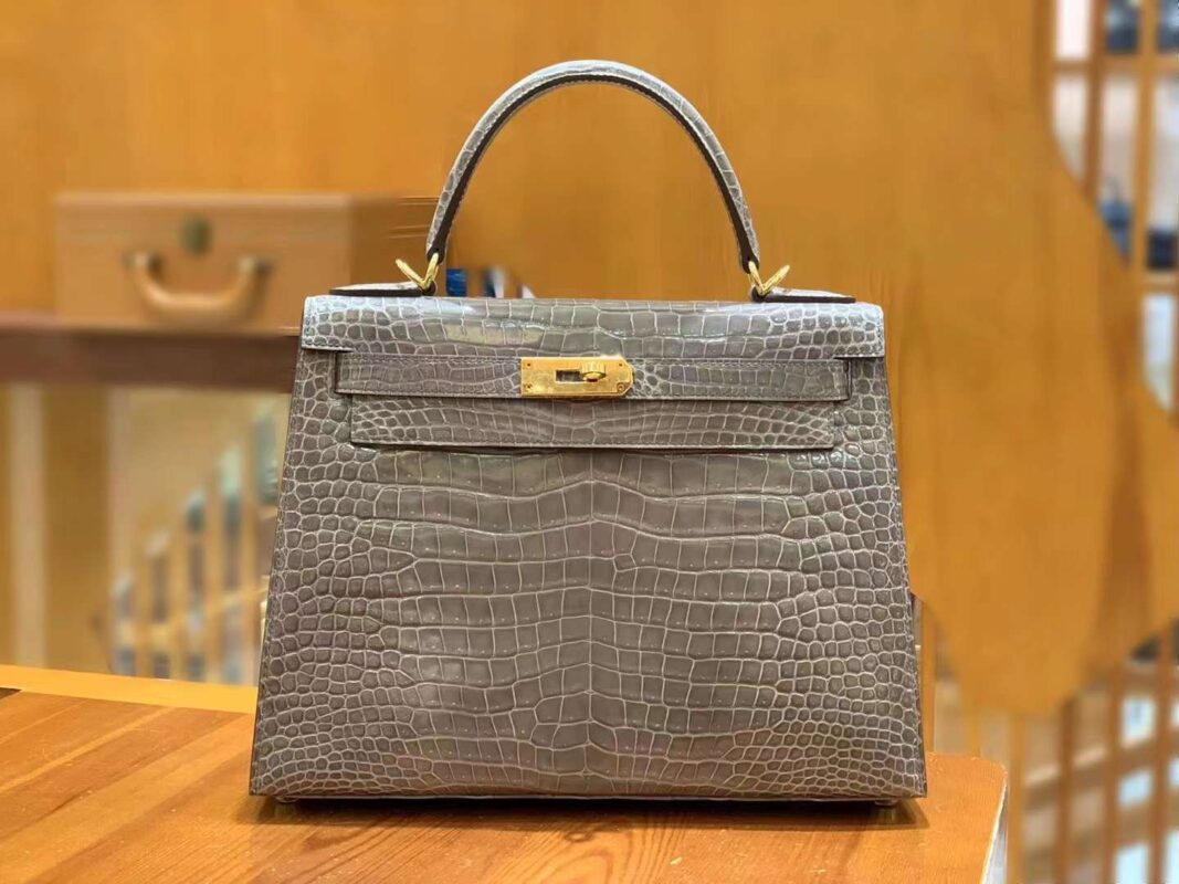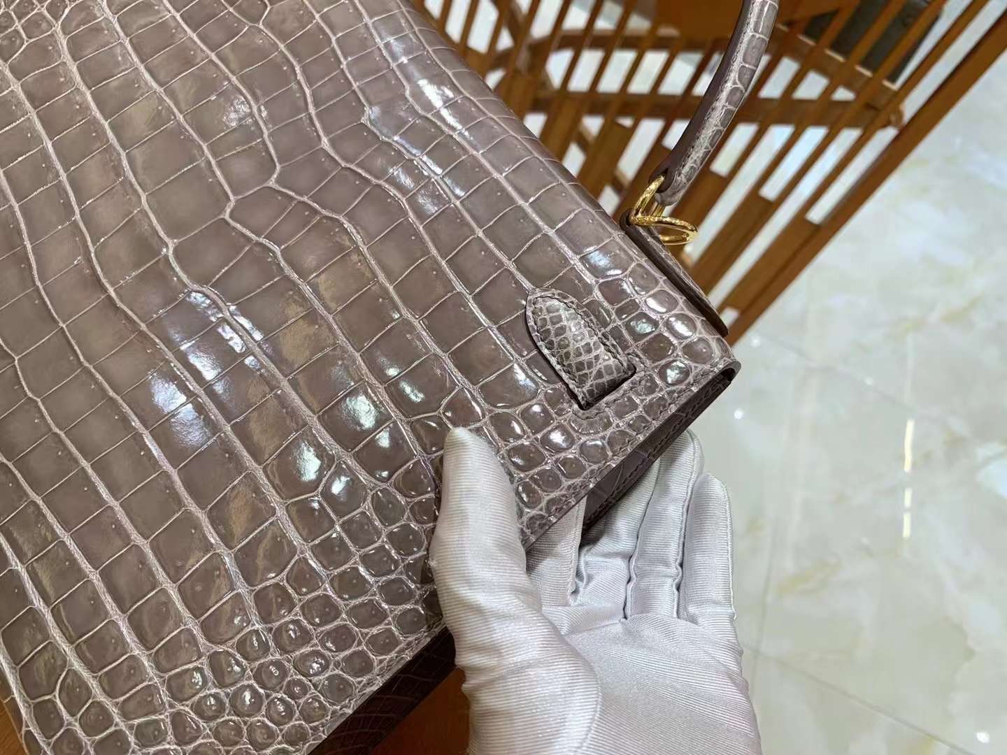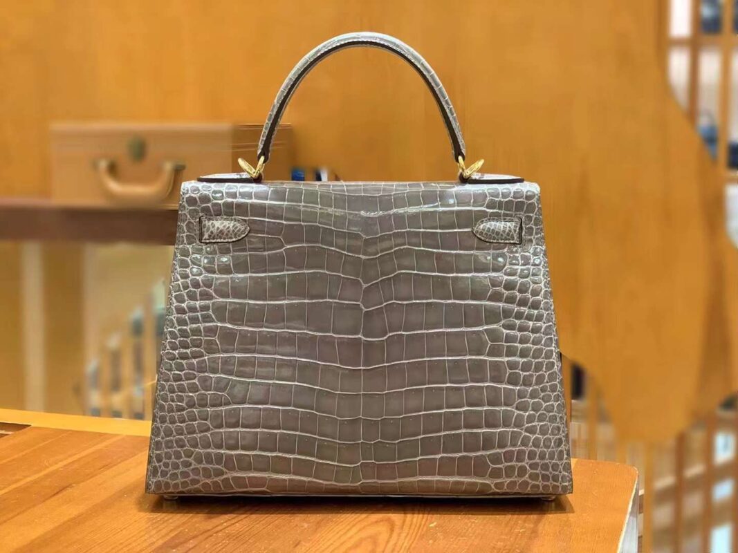 Kelly 28cm Elephant Grey Imported wild crocodile leather. French beeswax thread. 100% hand-sewn