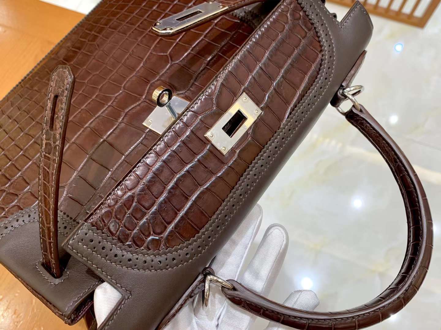 KL 28cm Brown with lace edge First-class bay crocodile leather. Silver Buckle. Imported raw materials. Fully hand-sewn