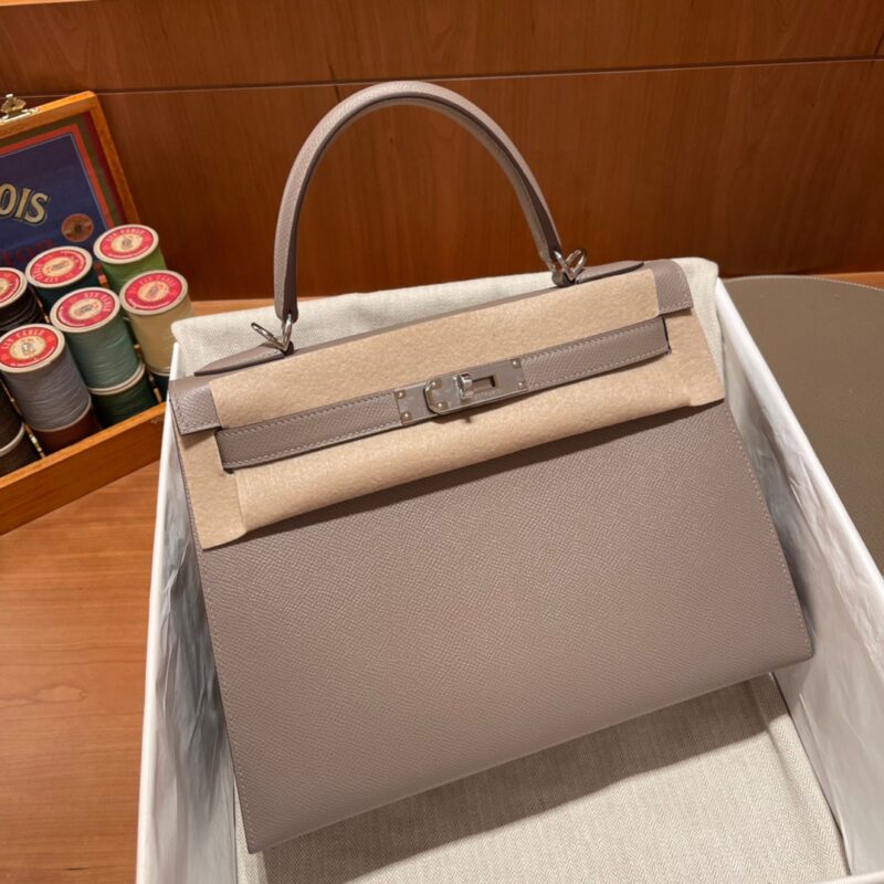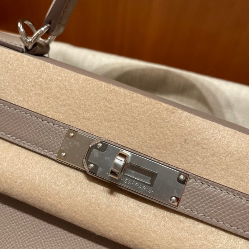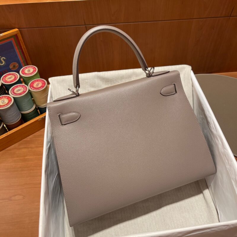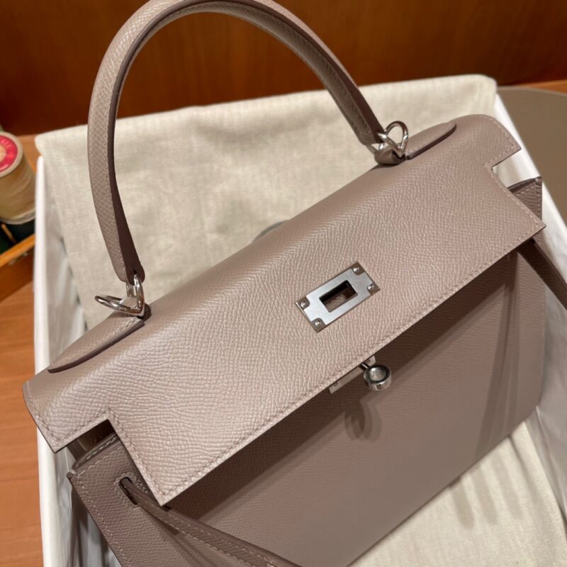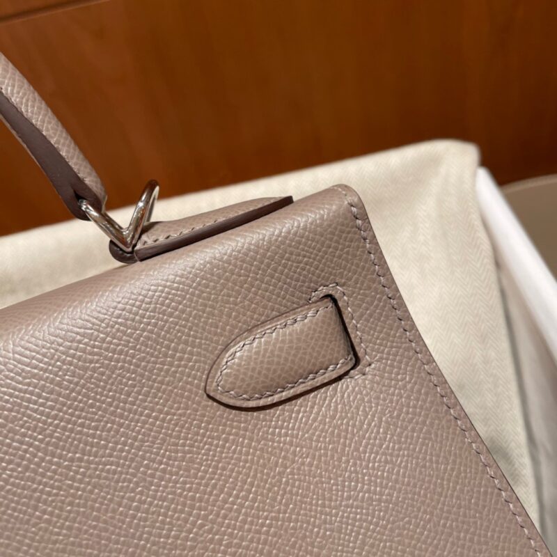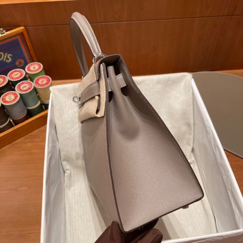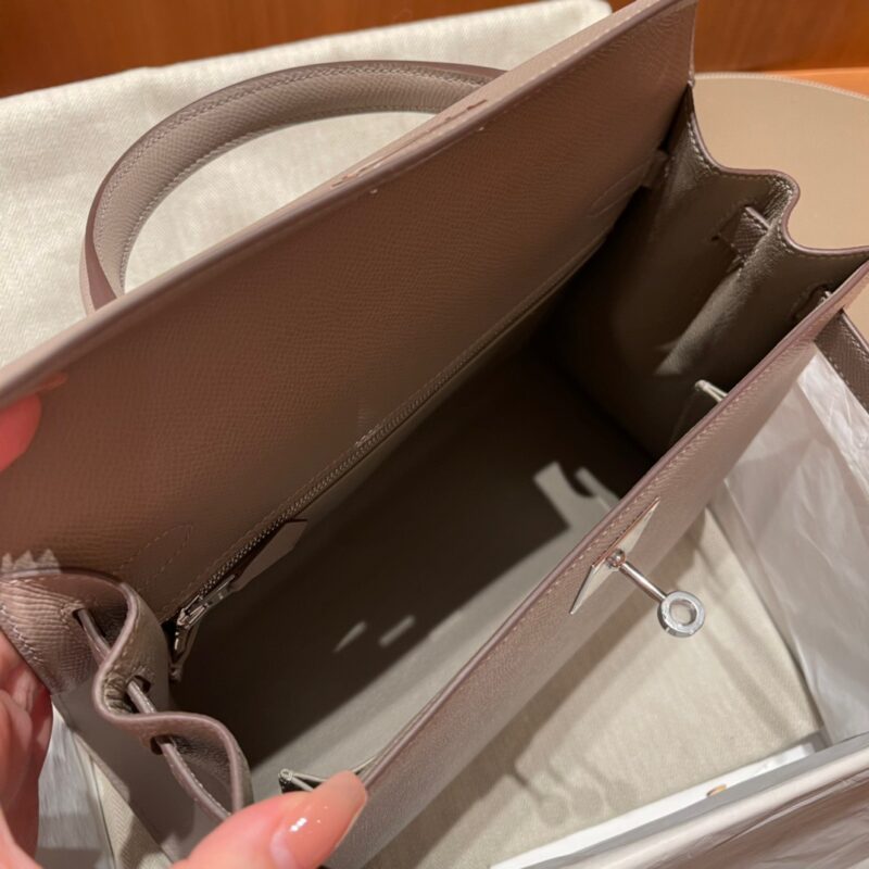 Kelly 28cm Epsom Leather. M8 Asphalt Grey (Gris Asphalte). Silver Buckle