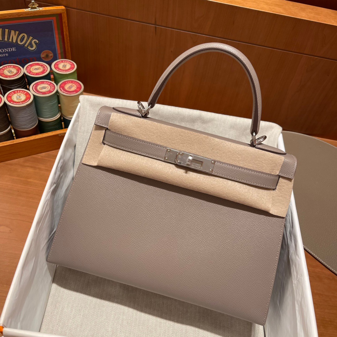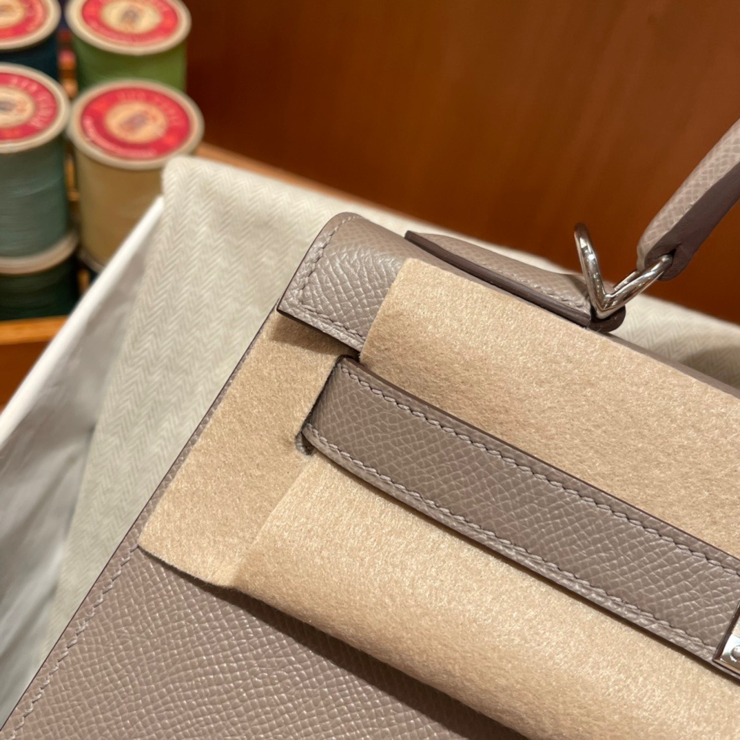 Kelly 28cm Epsom Leather. M8 Asphalt Grey (Gris Asphalte). Silver Buckle