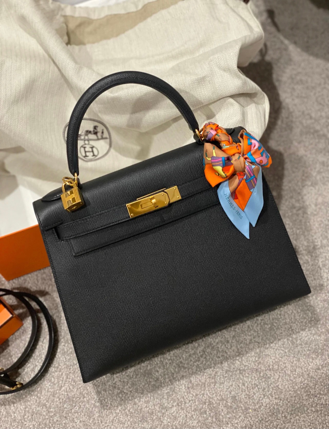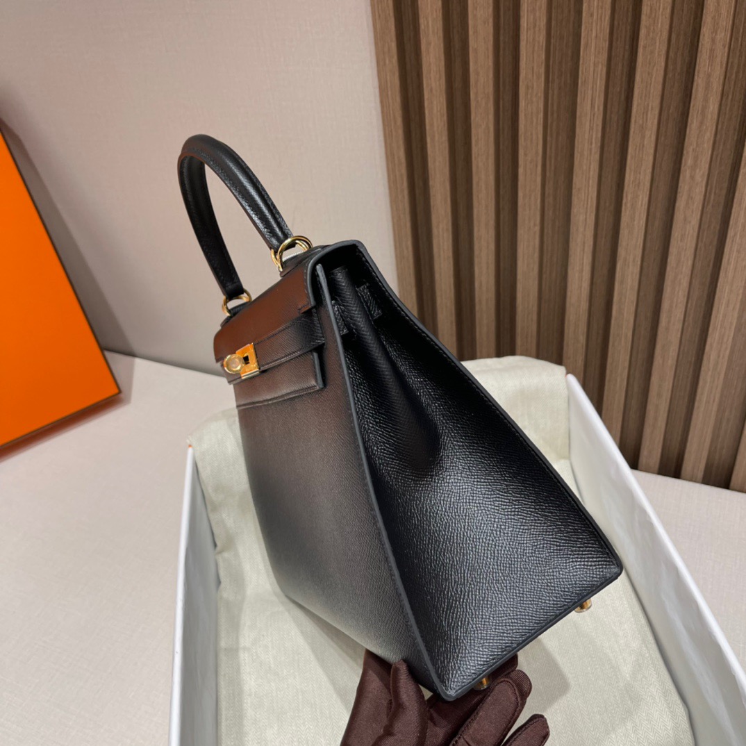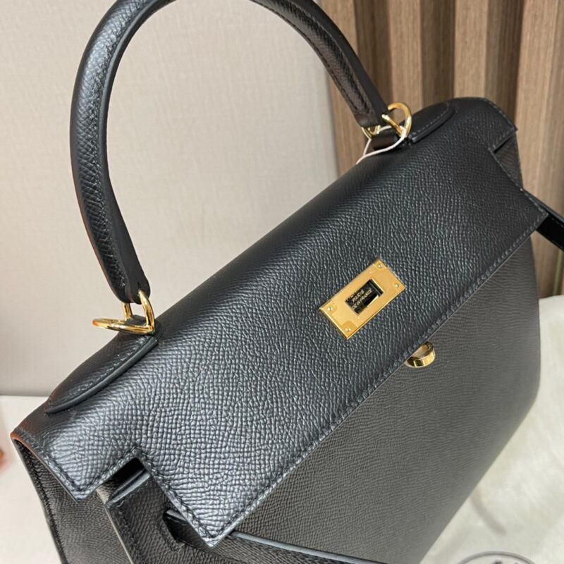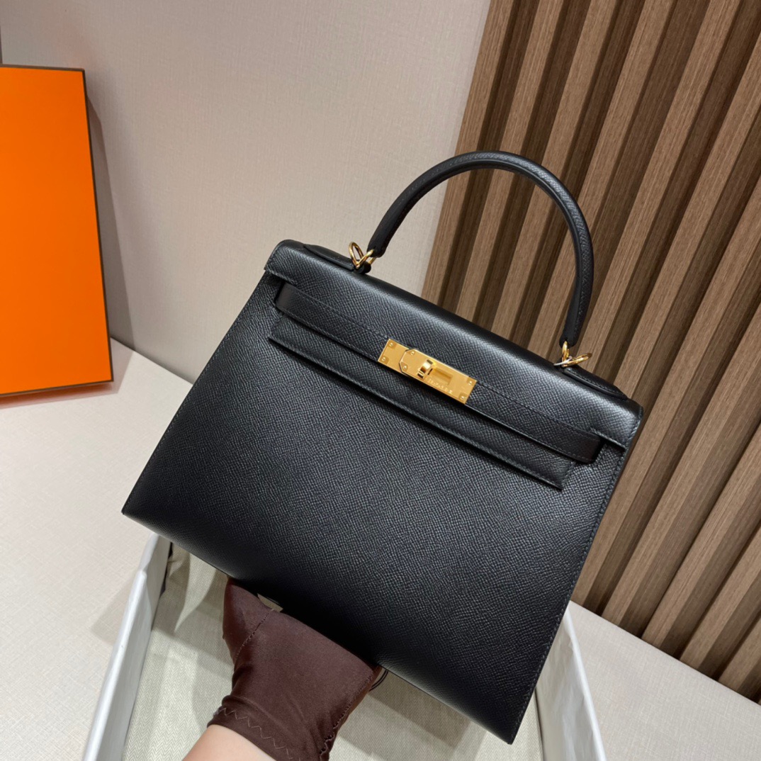 Kelly 28cm Epsom Leather 89 Black (Noir). Silver Buckle