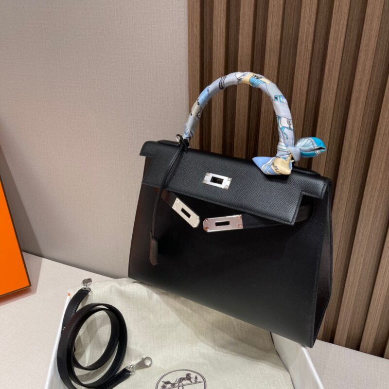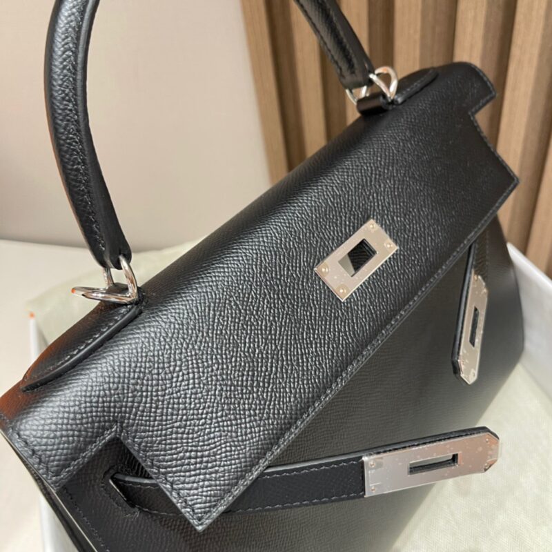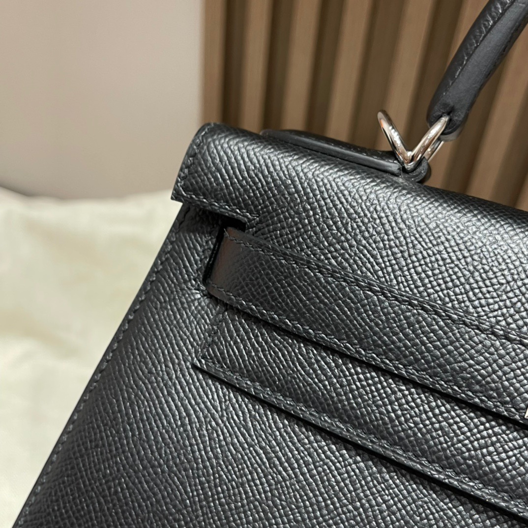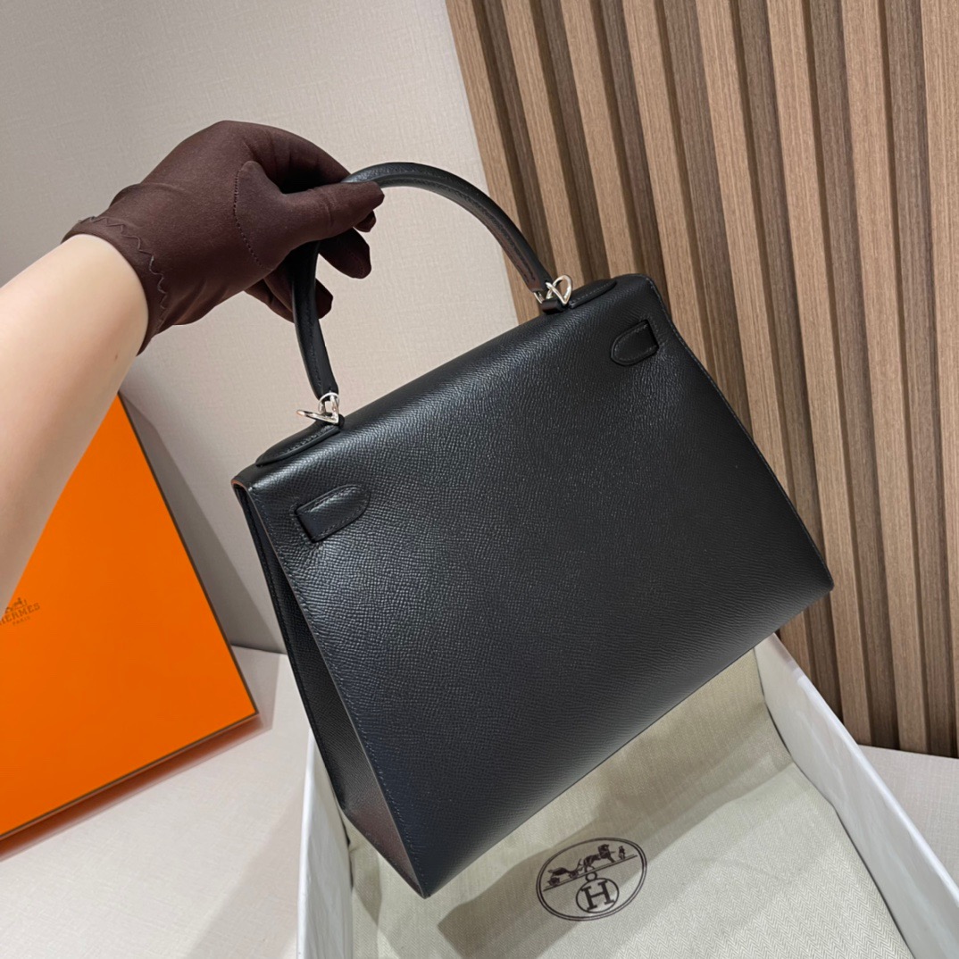 Kelly 28cm Epsom Leather. 89 Black (Noir). Silver Buckle