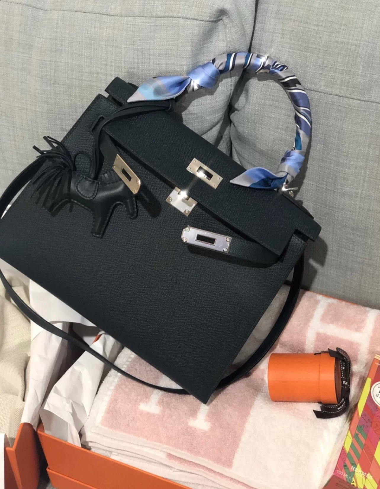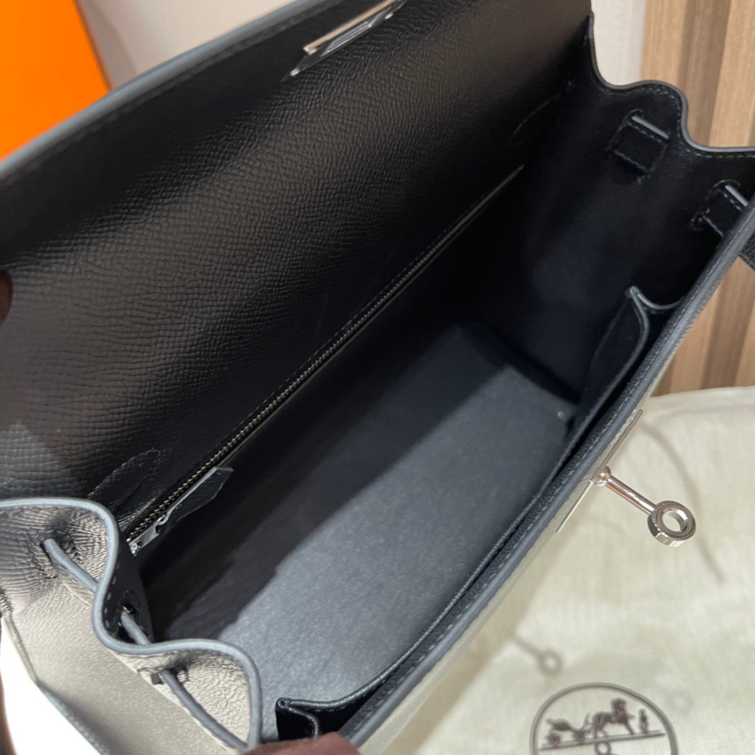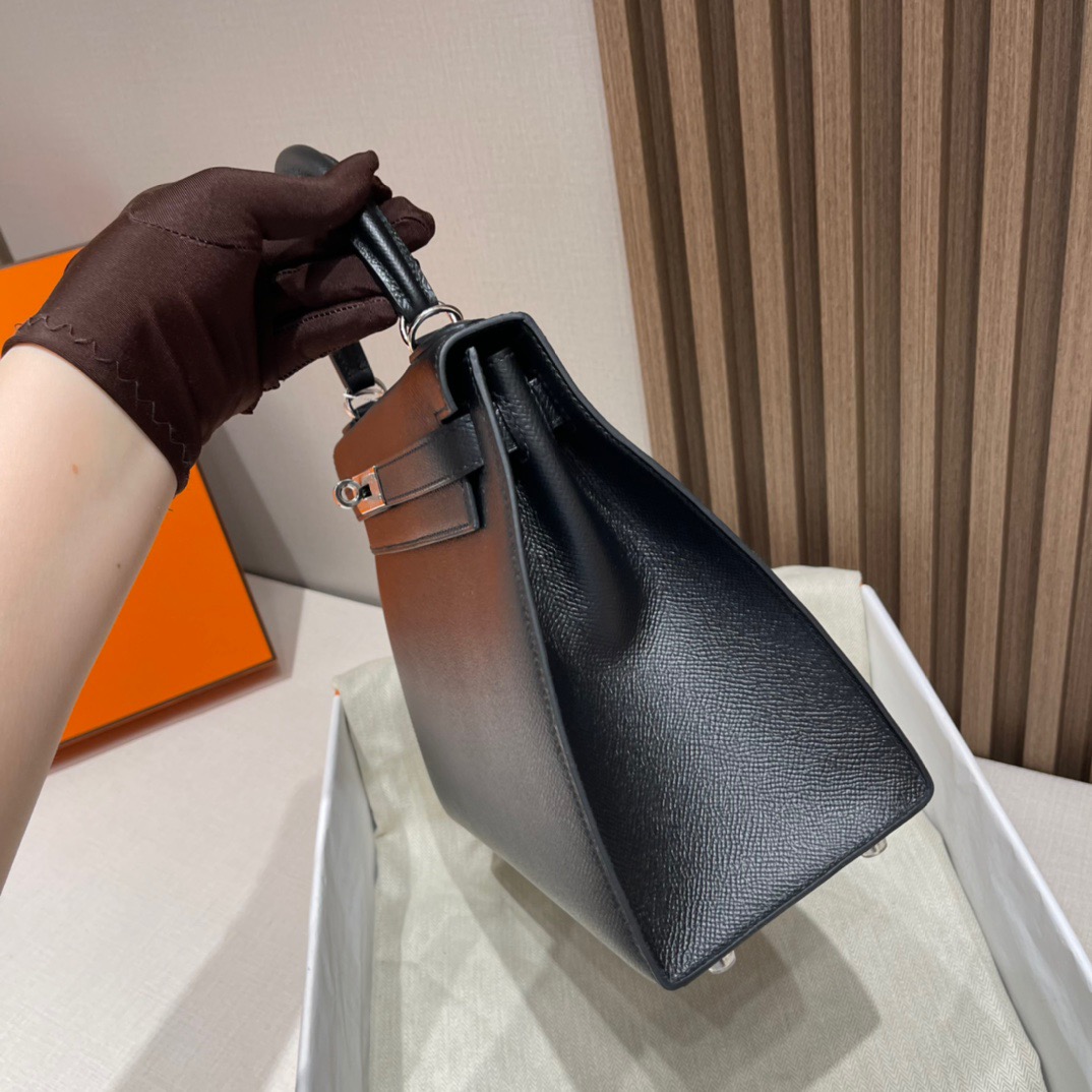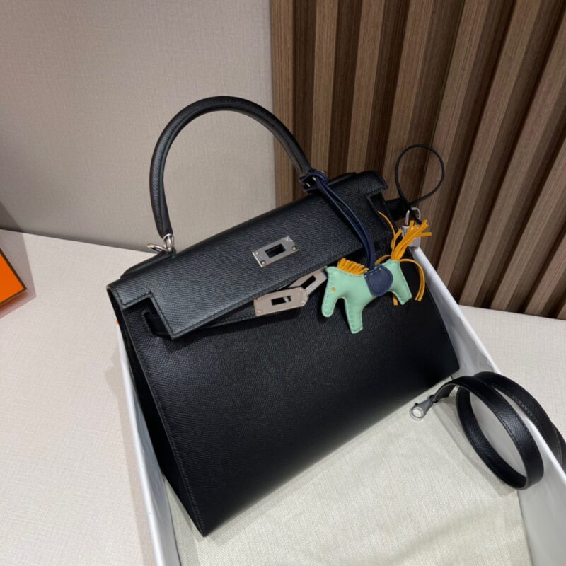 Kelly 28cm Epsom Leather. 89 Black (Noir). Silver Buckle