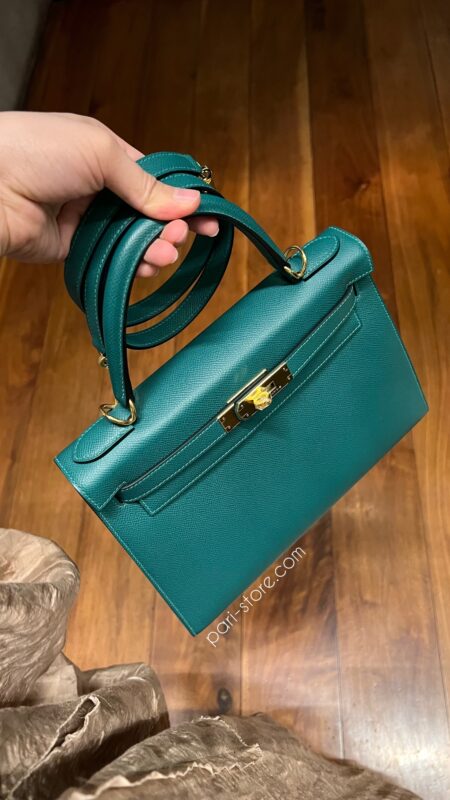 Kelly 28 in Epsom leather in Malachite green colour. Fully hand-sewn with beeswax thread. Gold hardware.