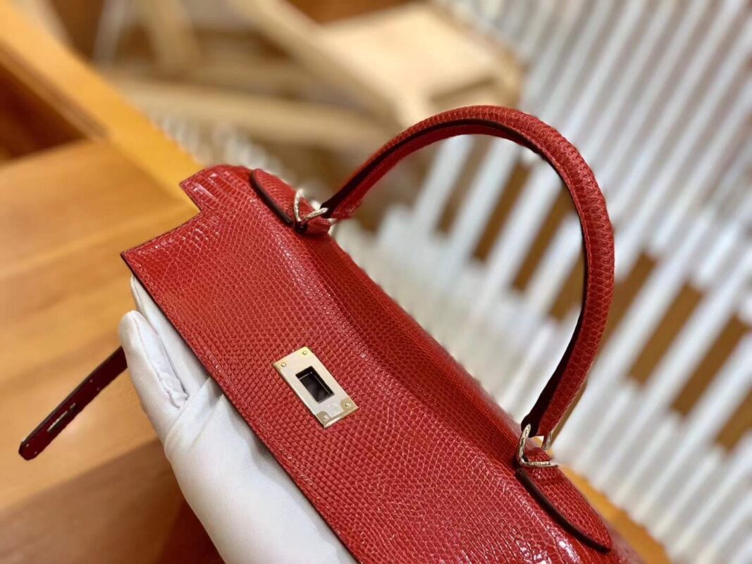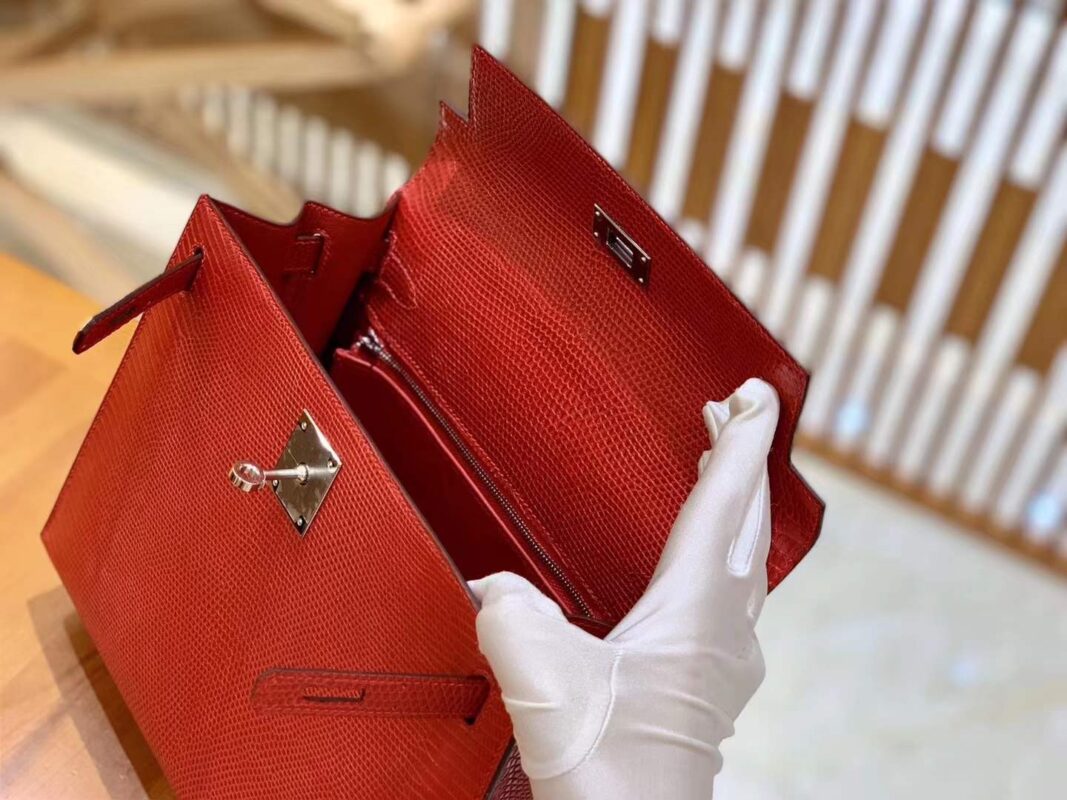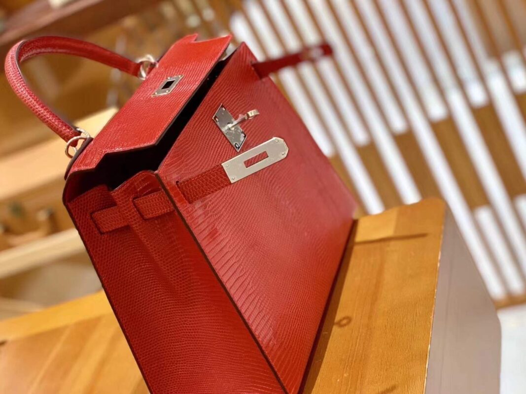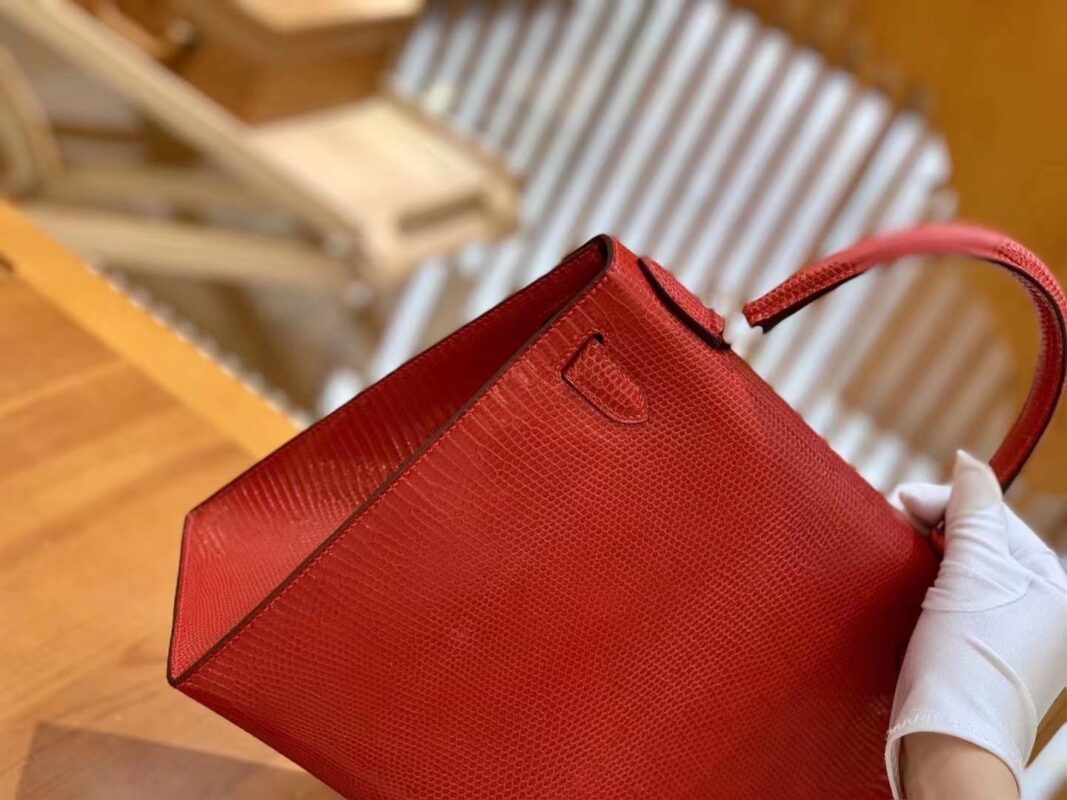 Kelly 28cm Flag Red Imported wild lizard skin. Hand-sewn