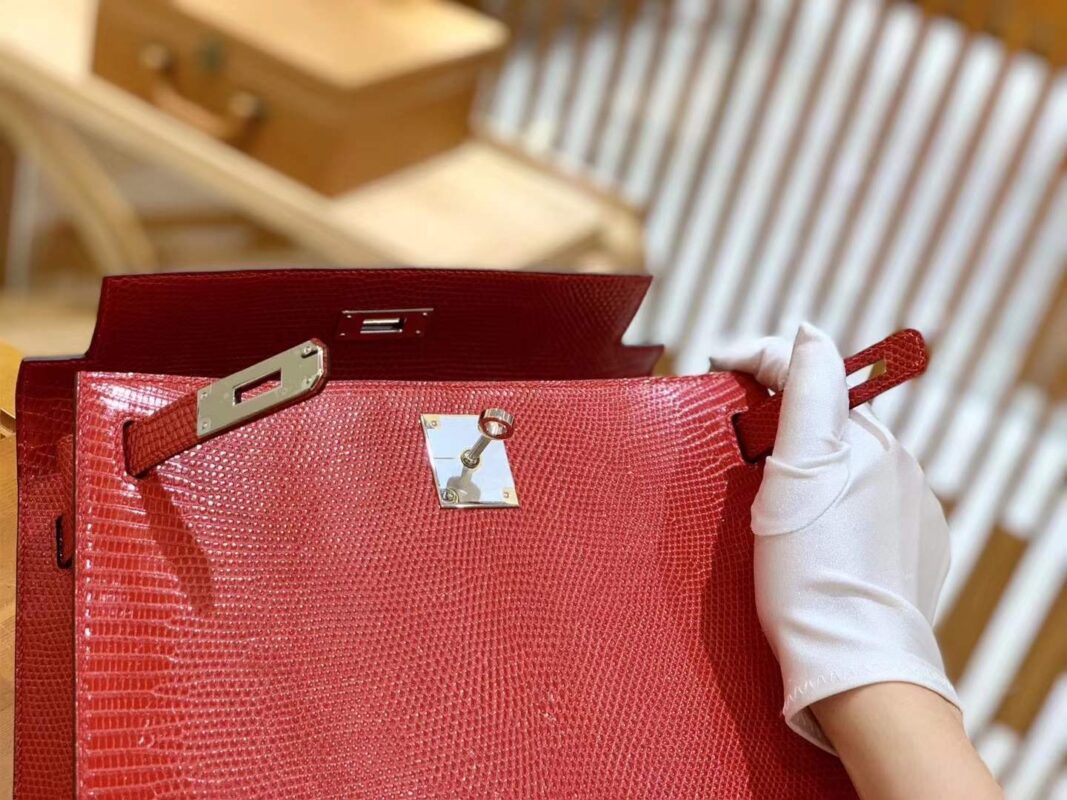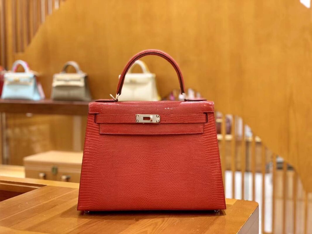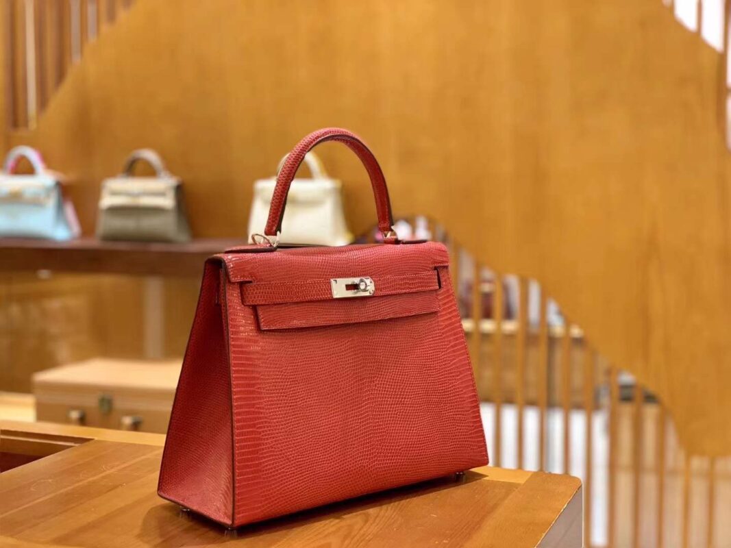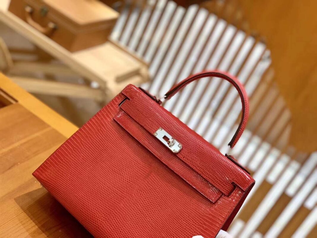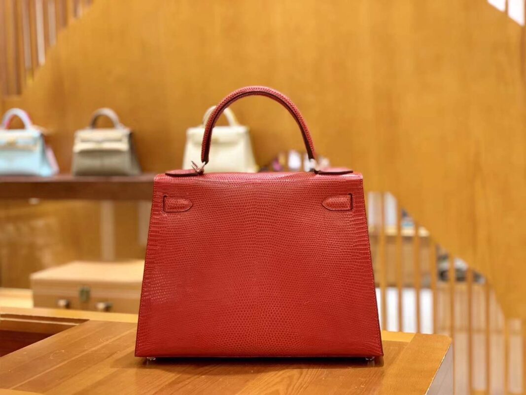 Kelly 28cm Flag Red Imported wild lizard skin. Hand-sewn