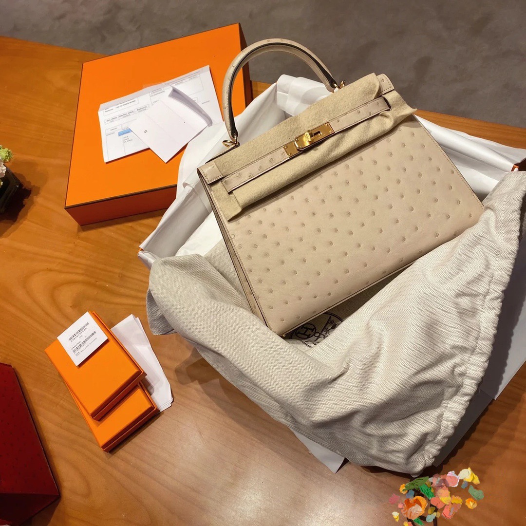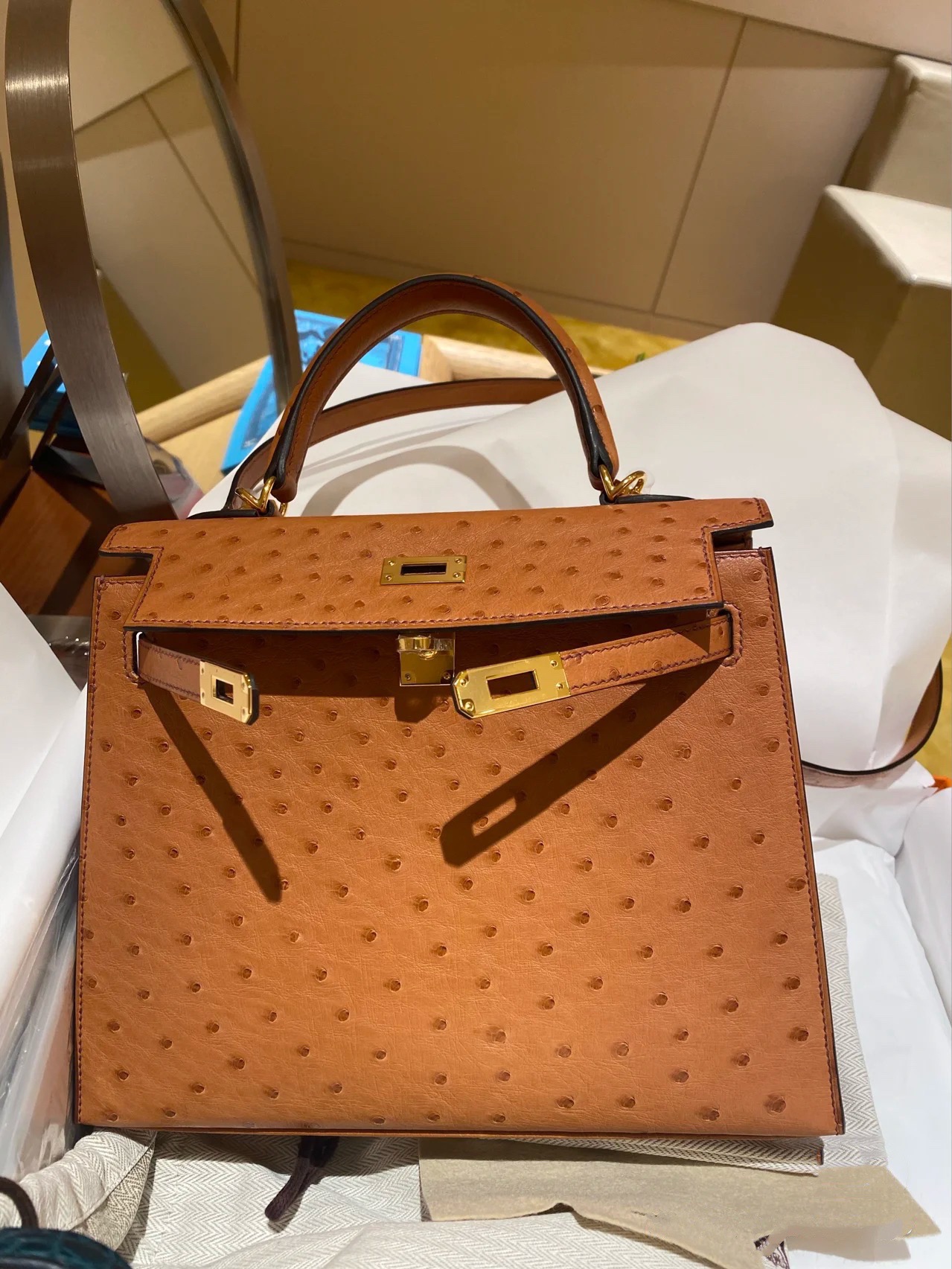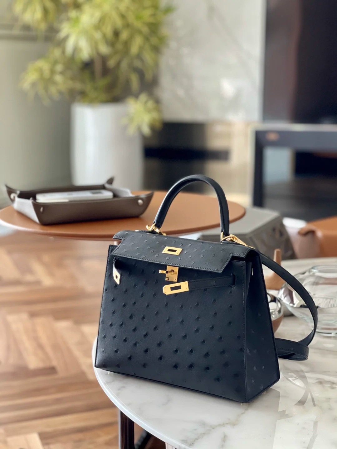 Kelly 28 Ostrich leather. Black Gold Buckle