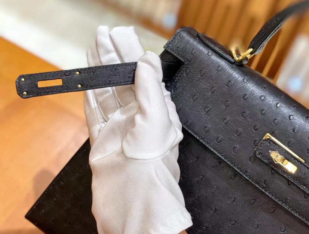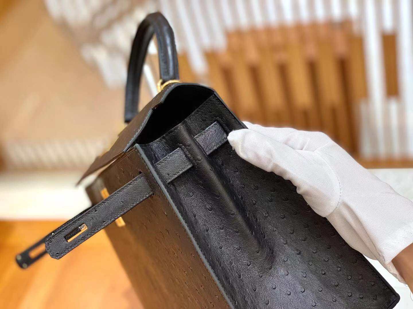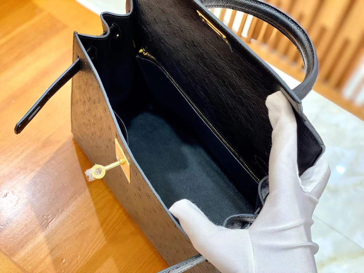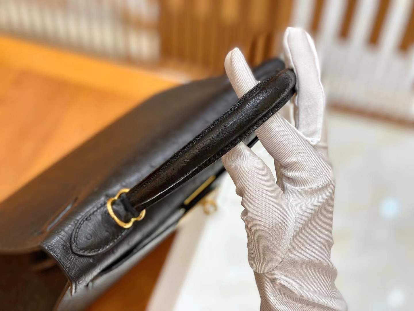 Kelly 28cm Black Gold Buckle Imported South African KK grade ostrich leather. Hand-sewn