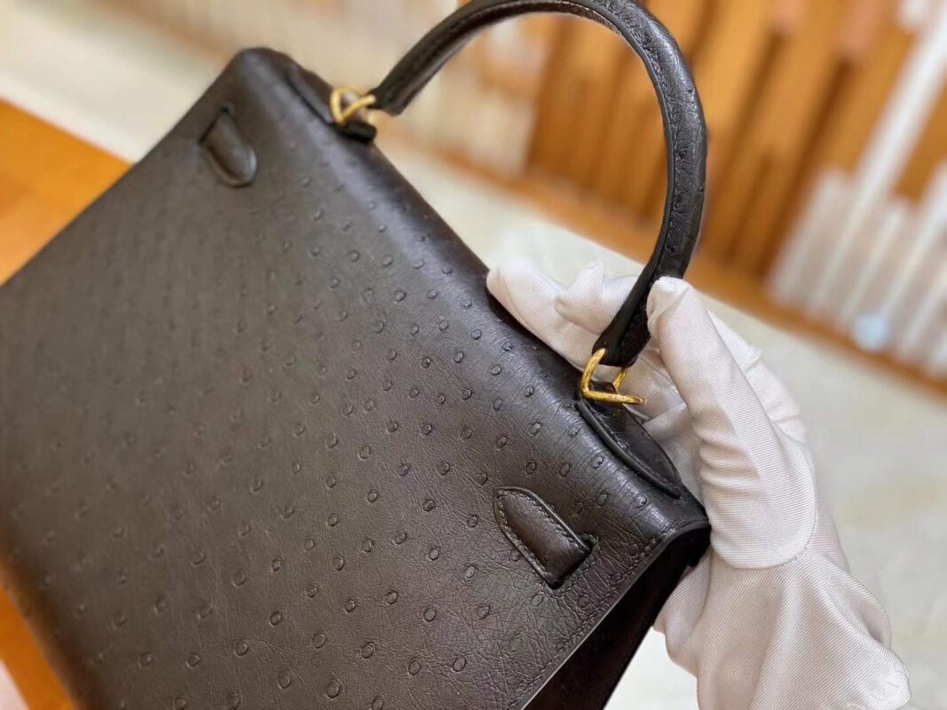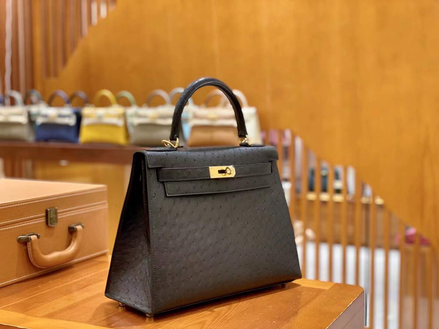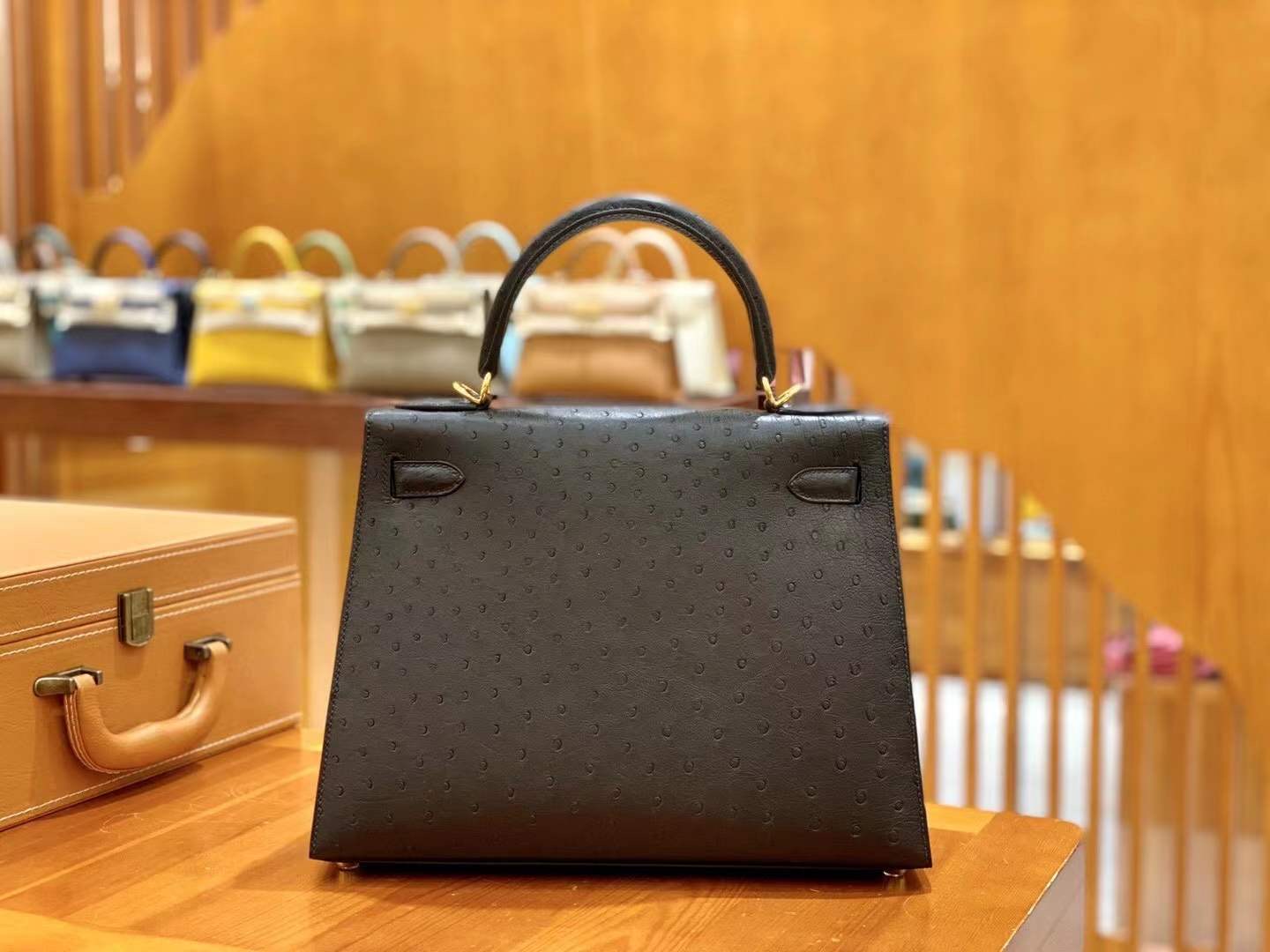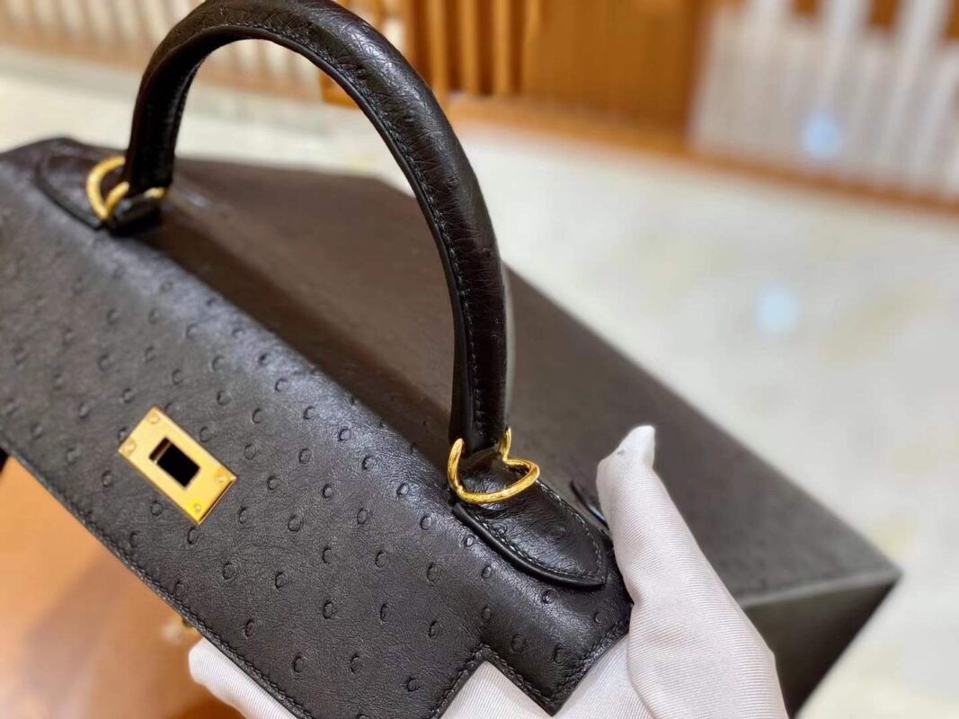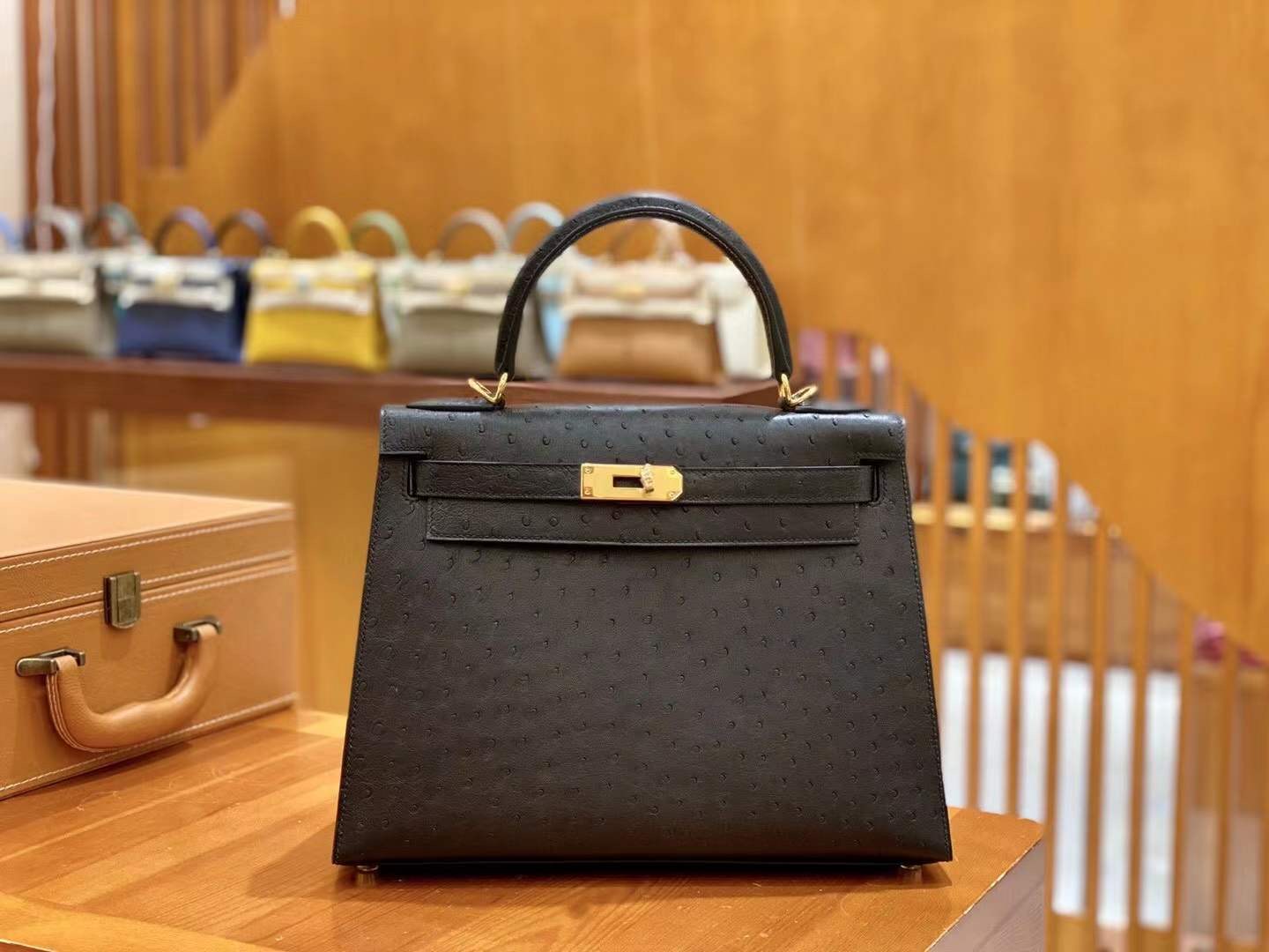 Kelly 28cm Black Gold Buckle Imported South African KK grade ostrich leather. Hand-sewn