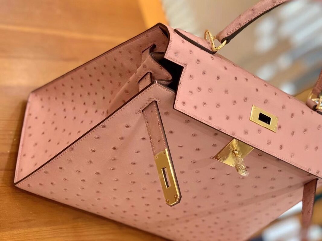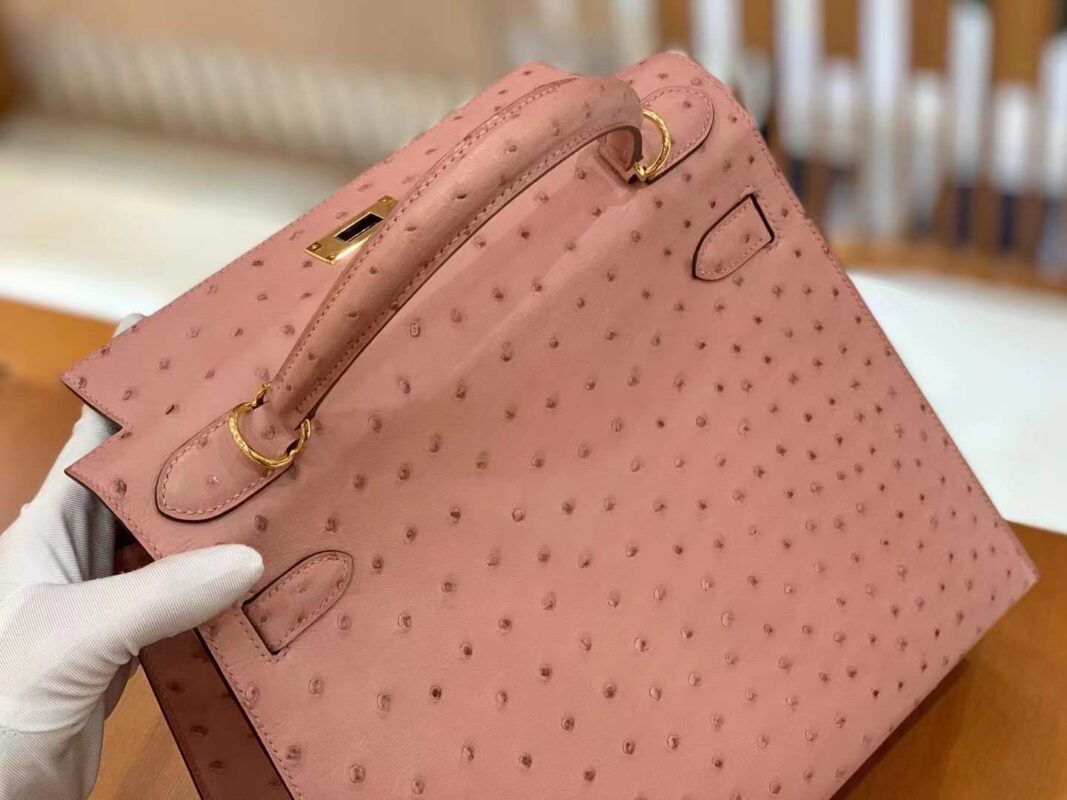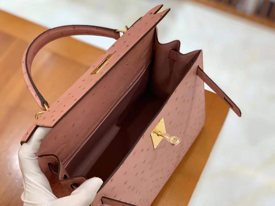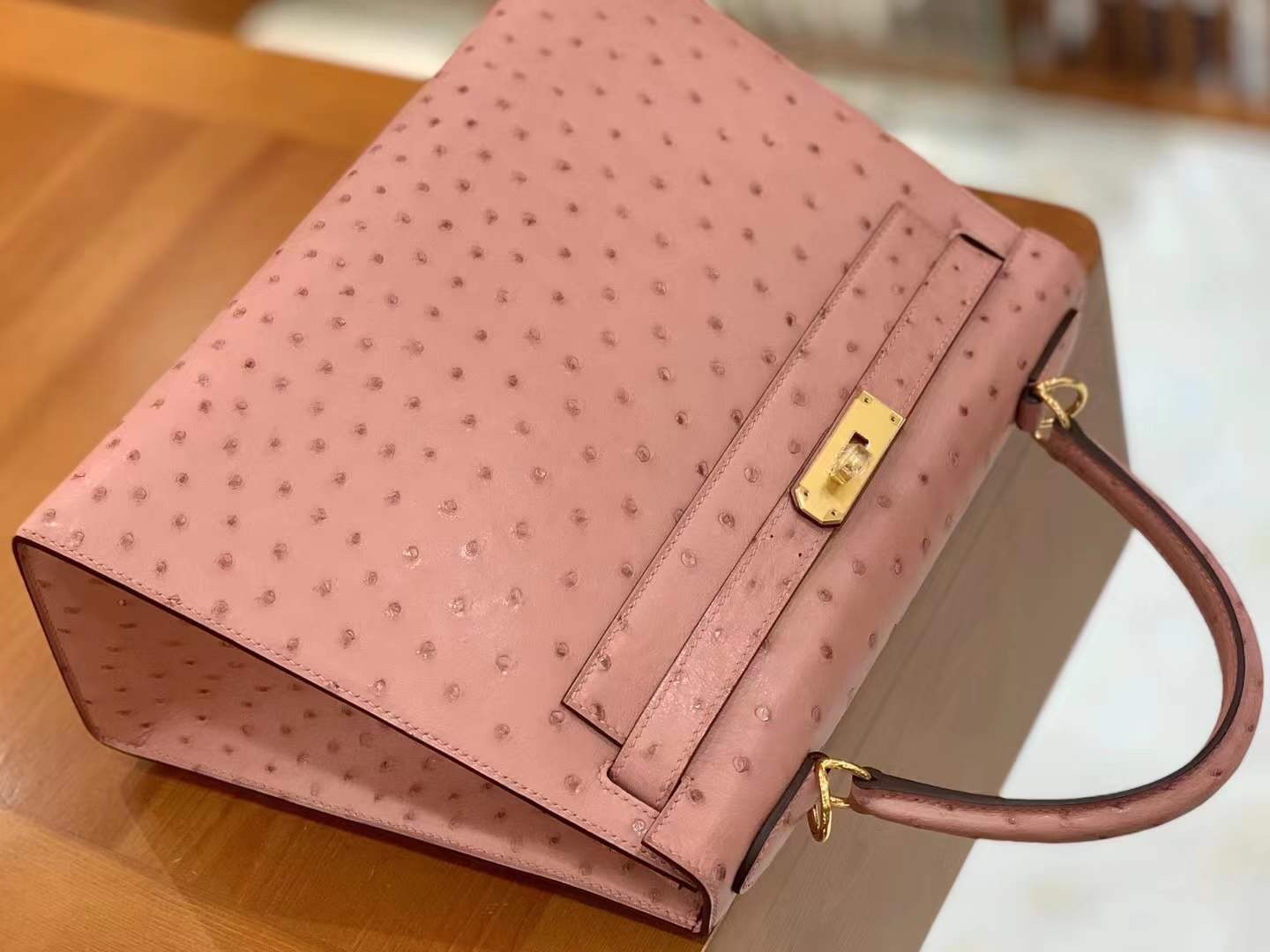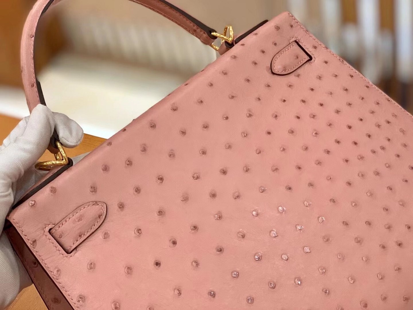 Kelly 28cm Ceramic Pink Gold BuckleImported South African KK grade ostrich leather. Hand-sewn