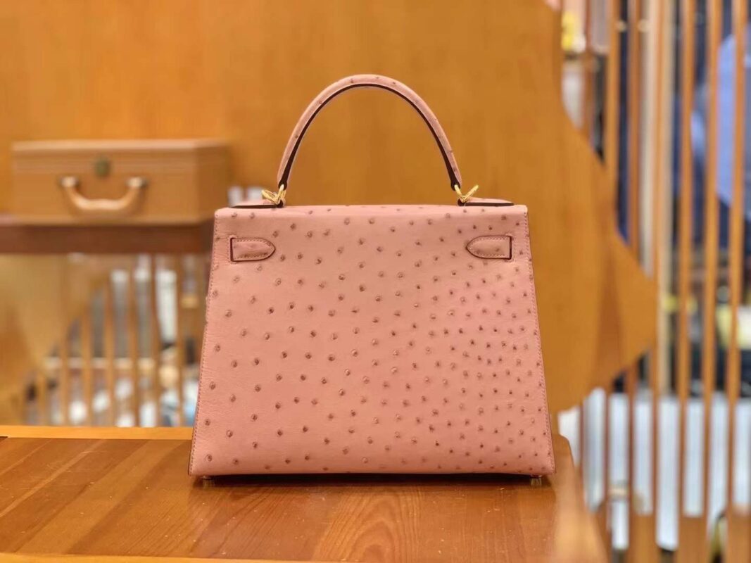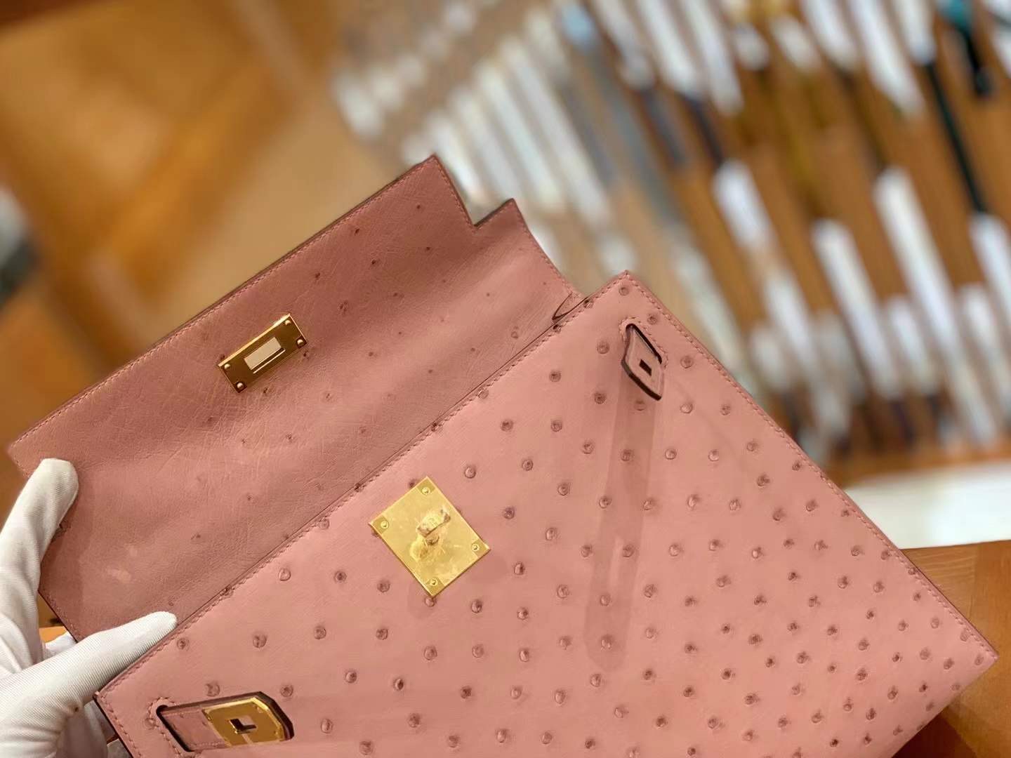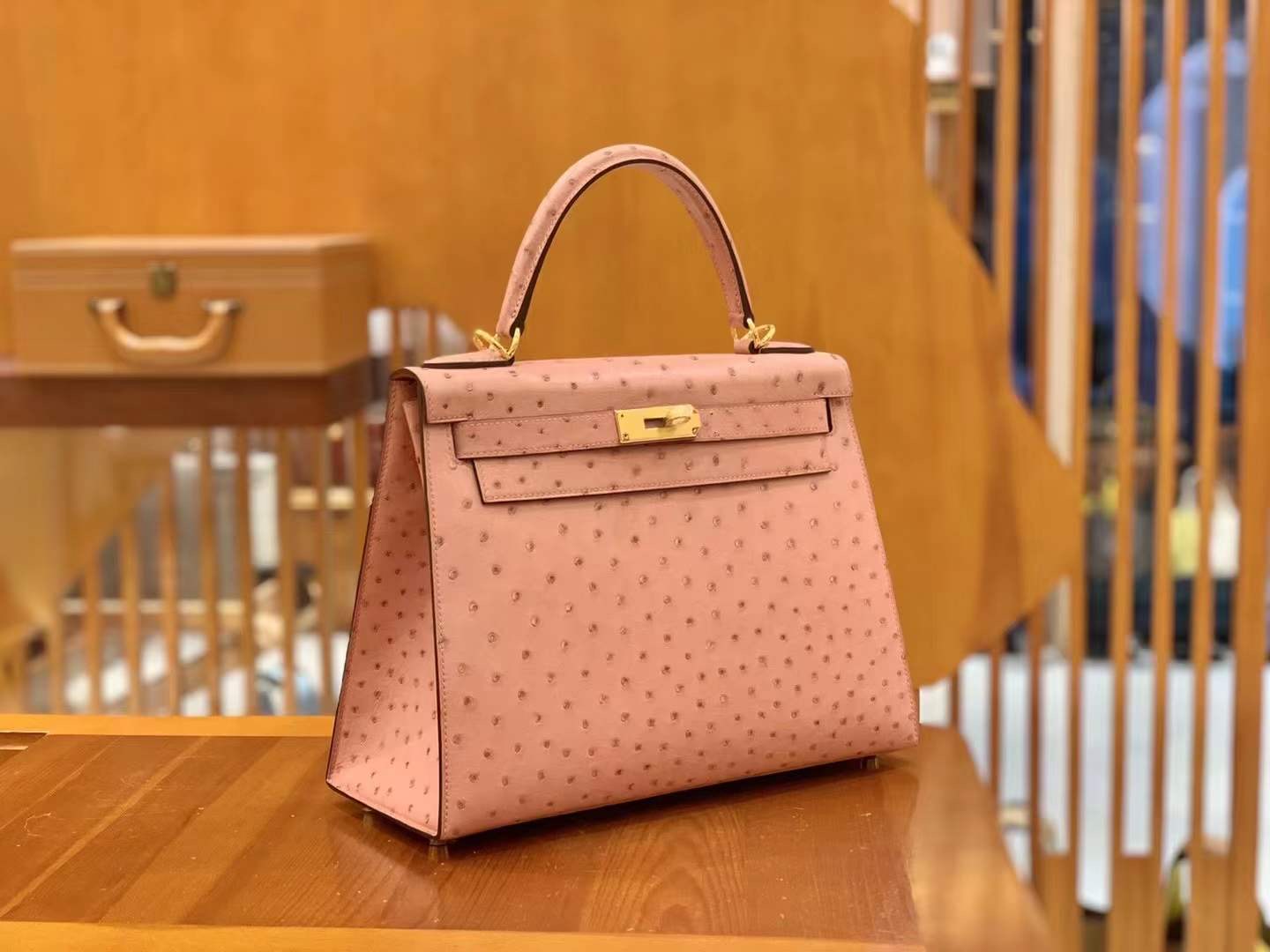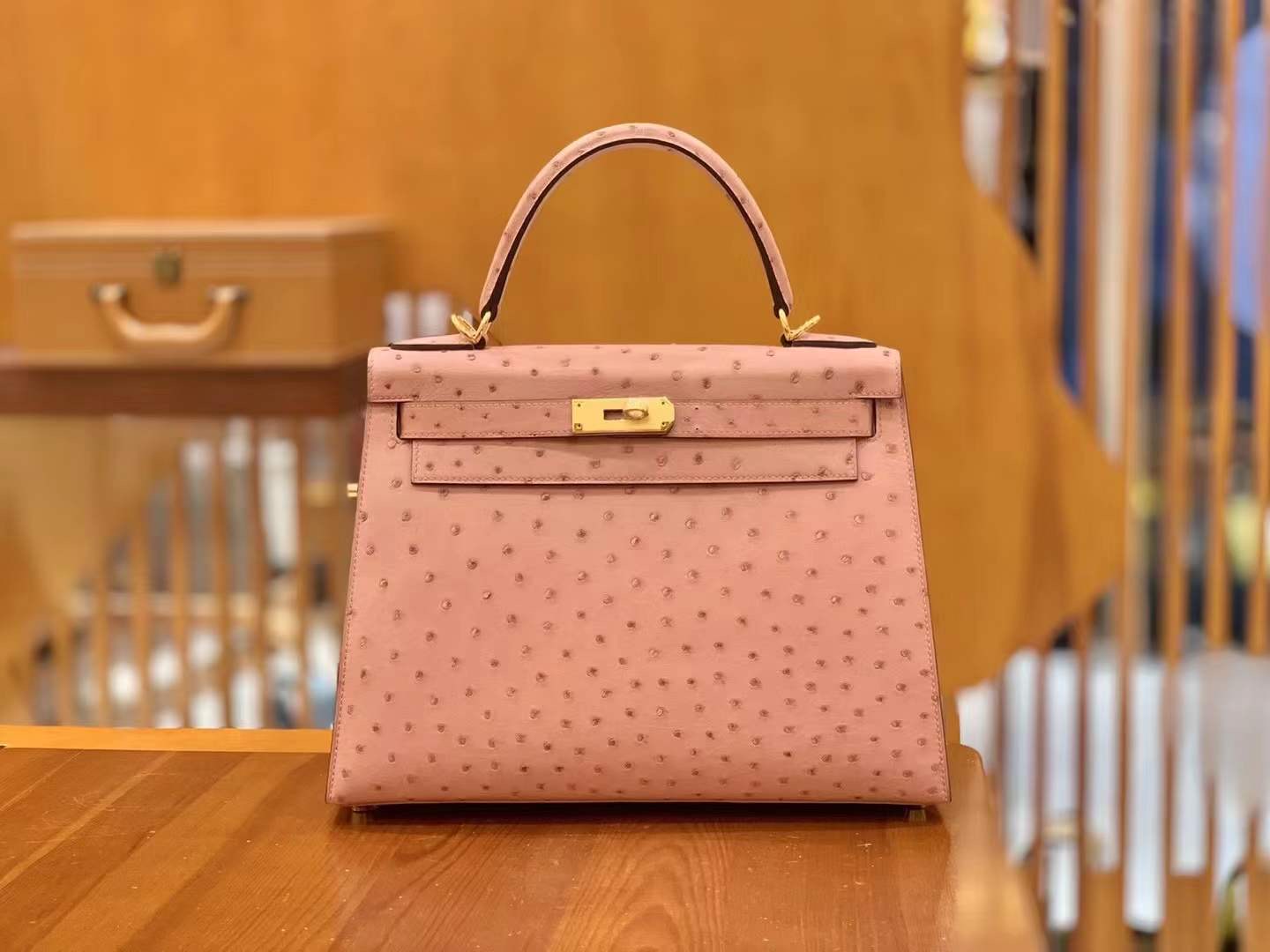 Kelly 28cm Ceramic Pink Gold BuckleImported South African KK grade ostrich leather. Hand-sewn
