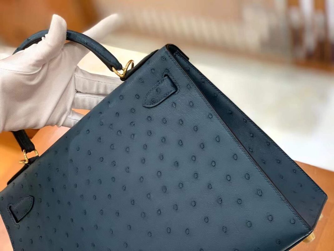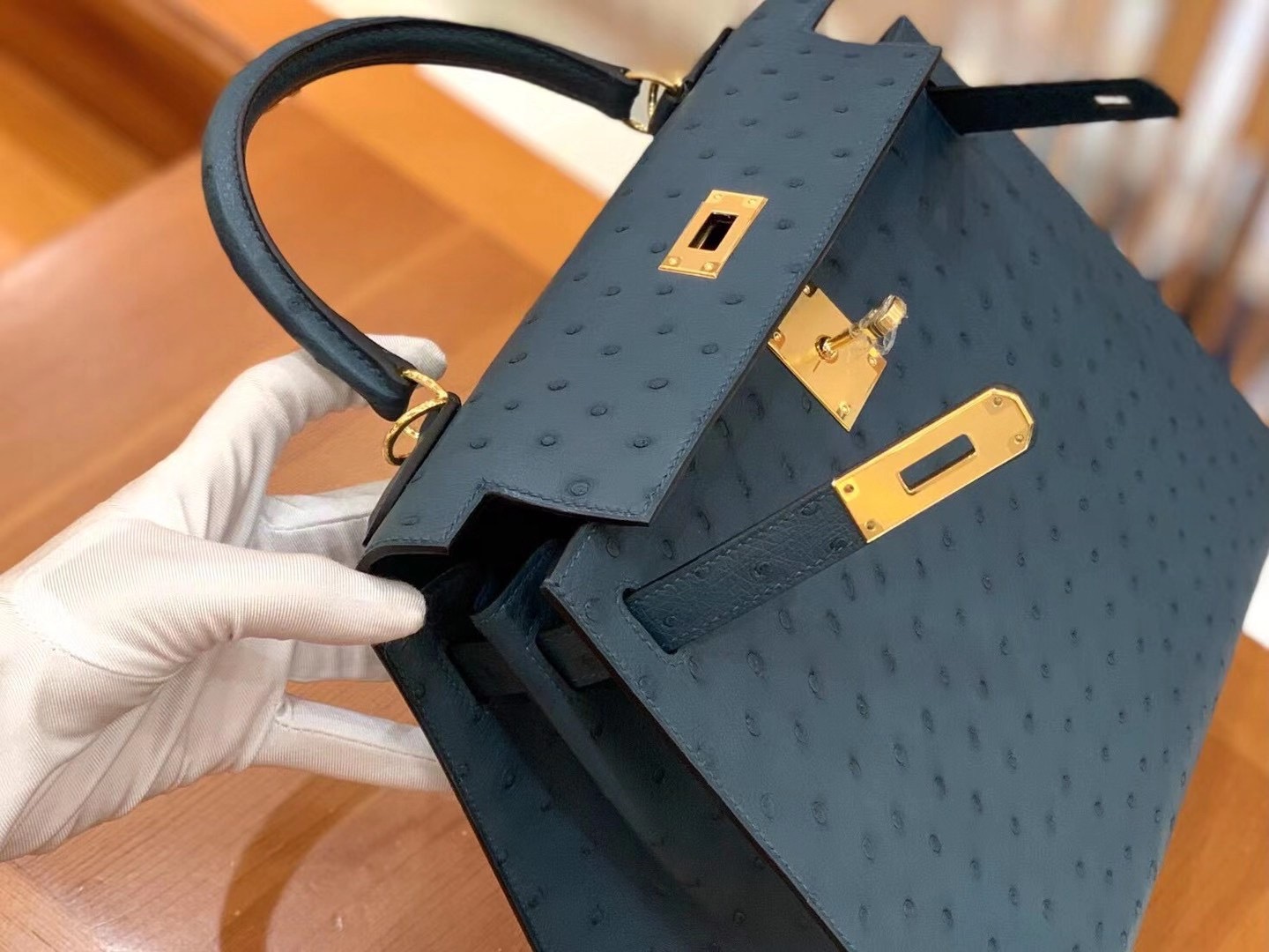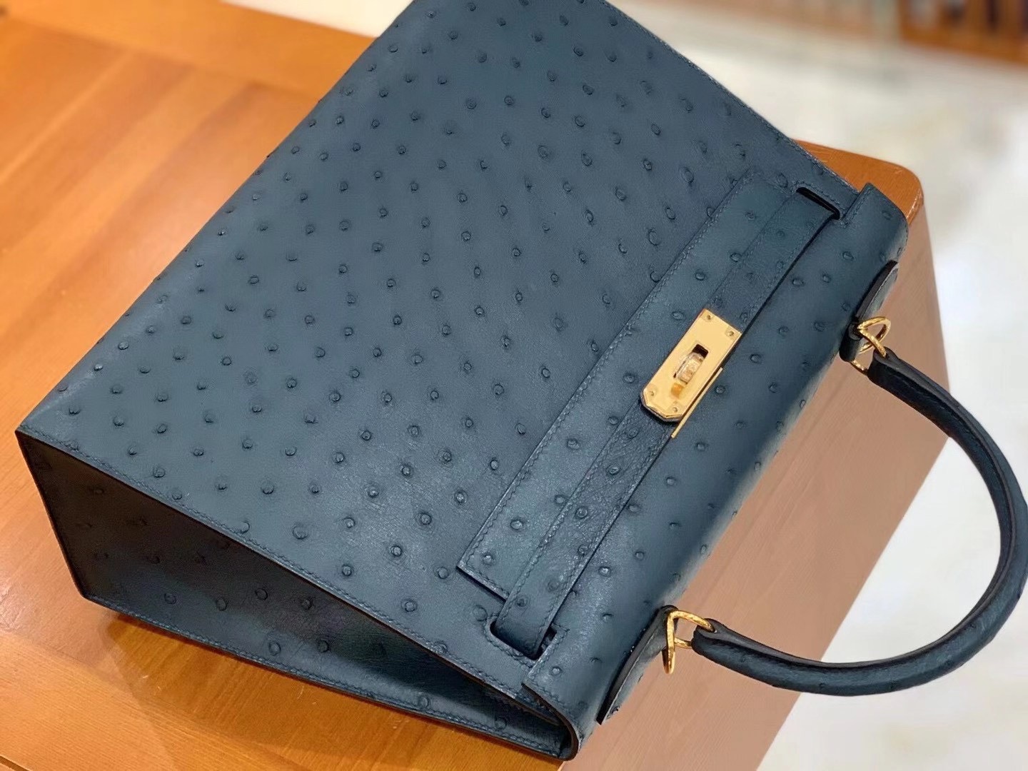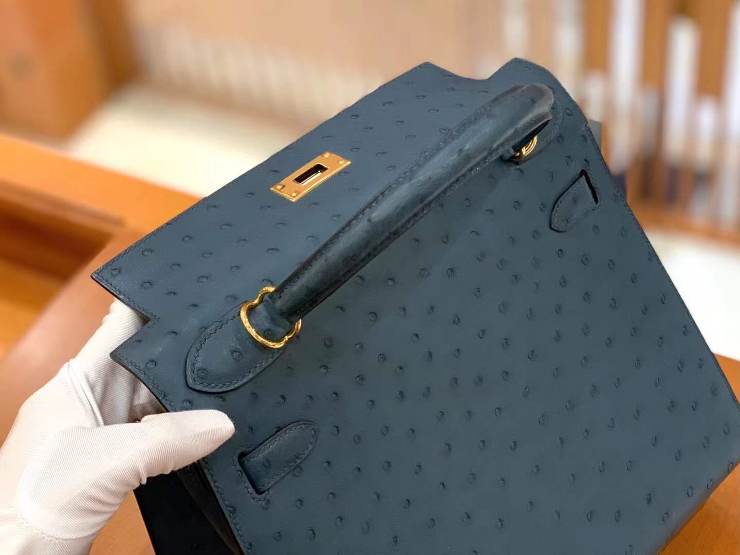 Kelly 28cm Indigo Gold BuckleImported South African KK grade ostrich leather. Hand-sewn