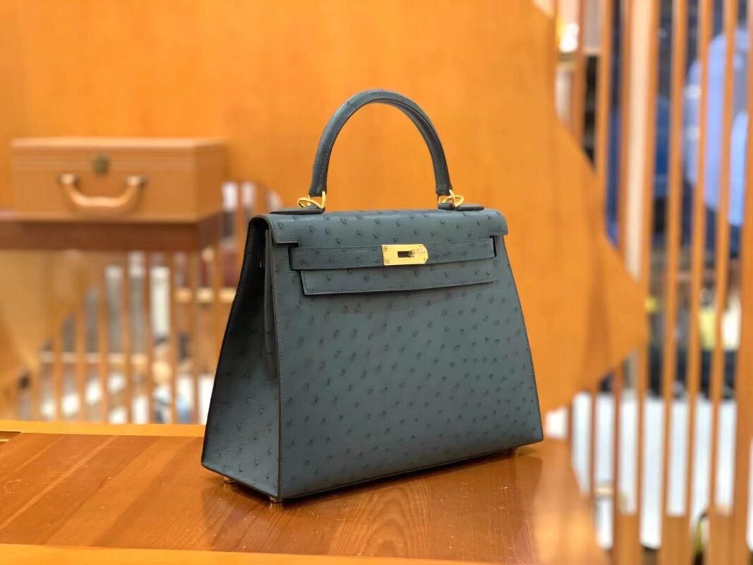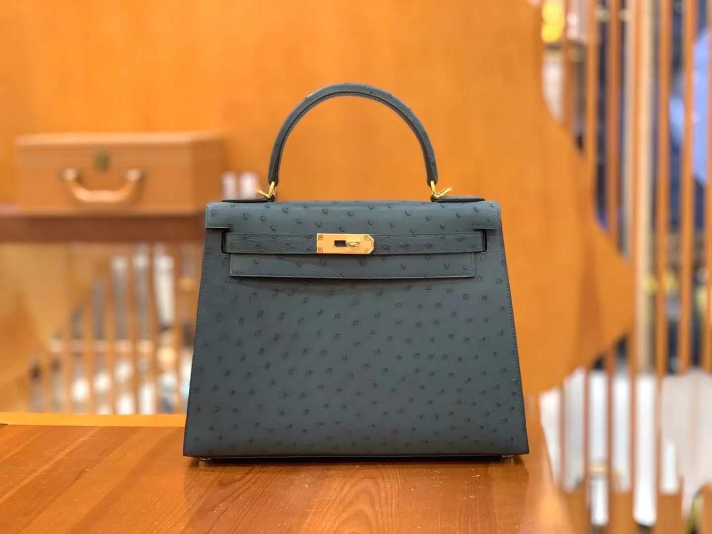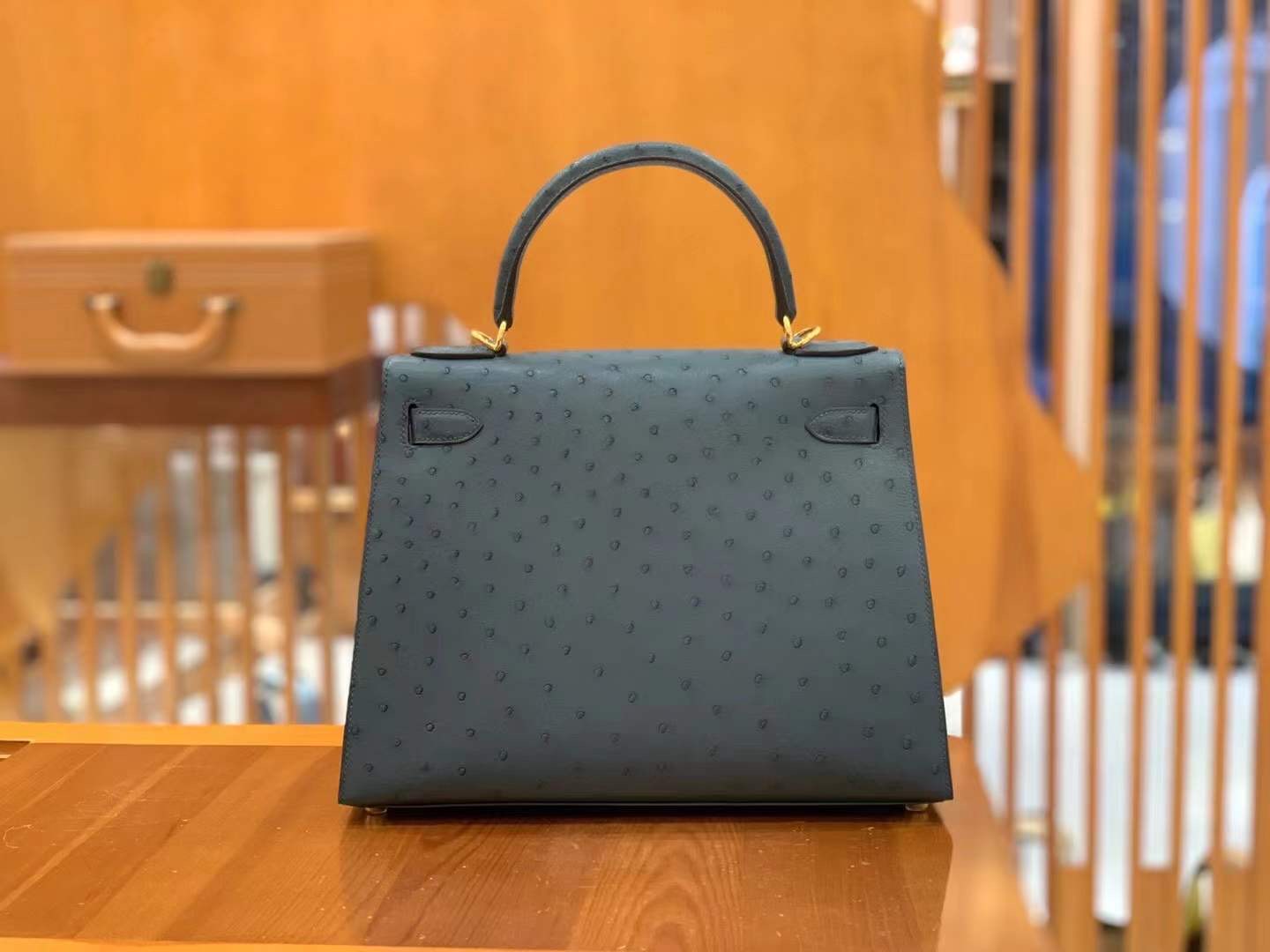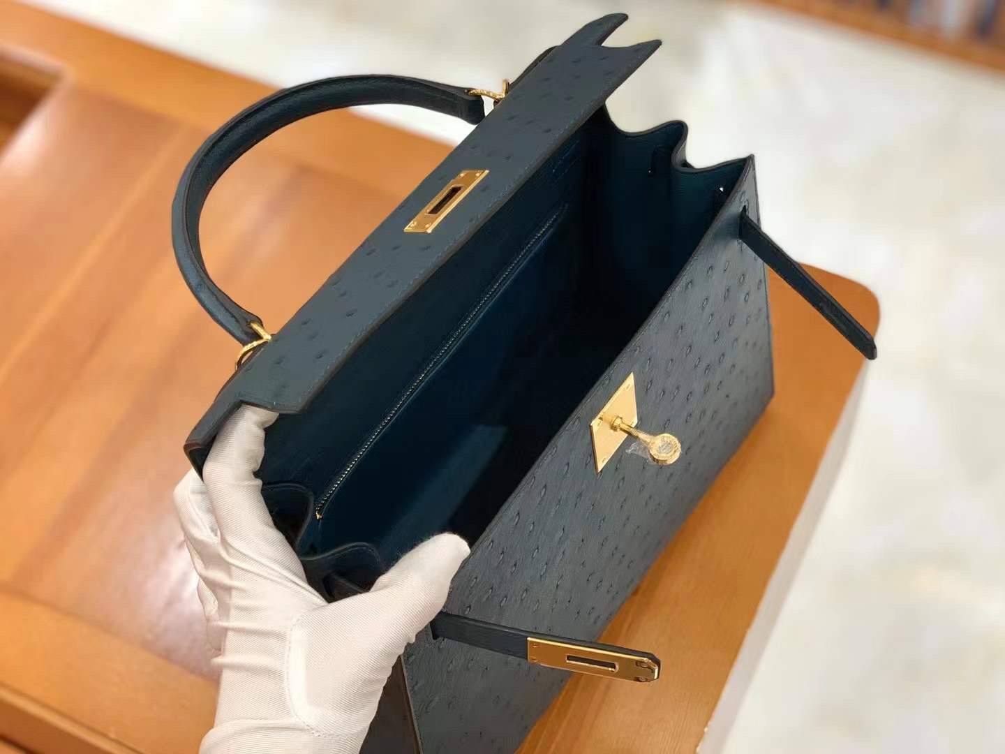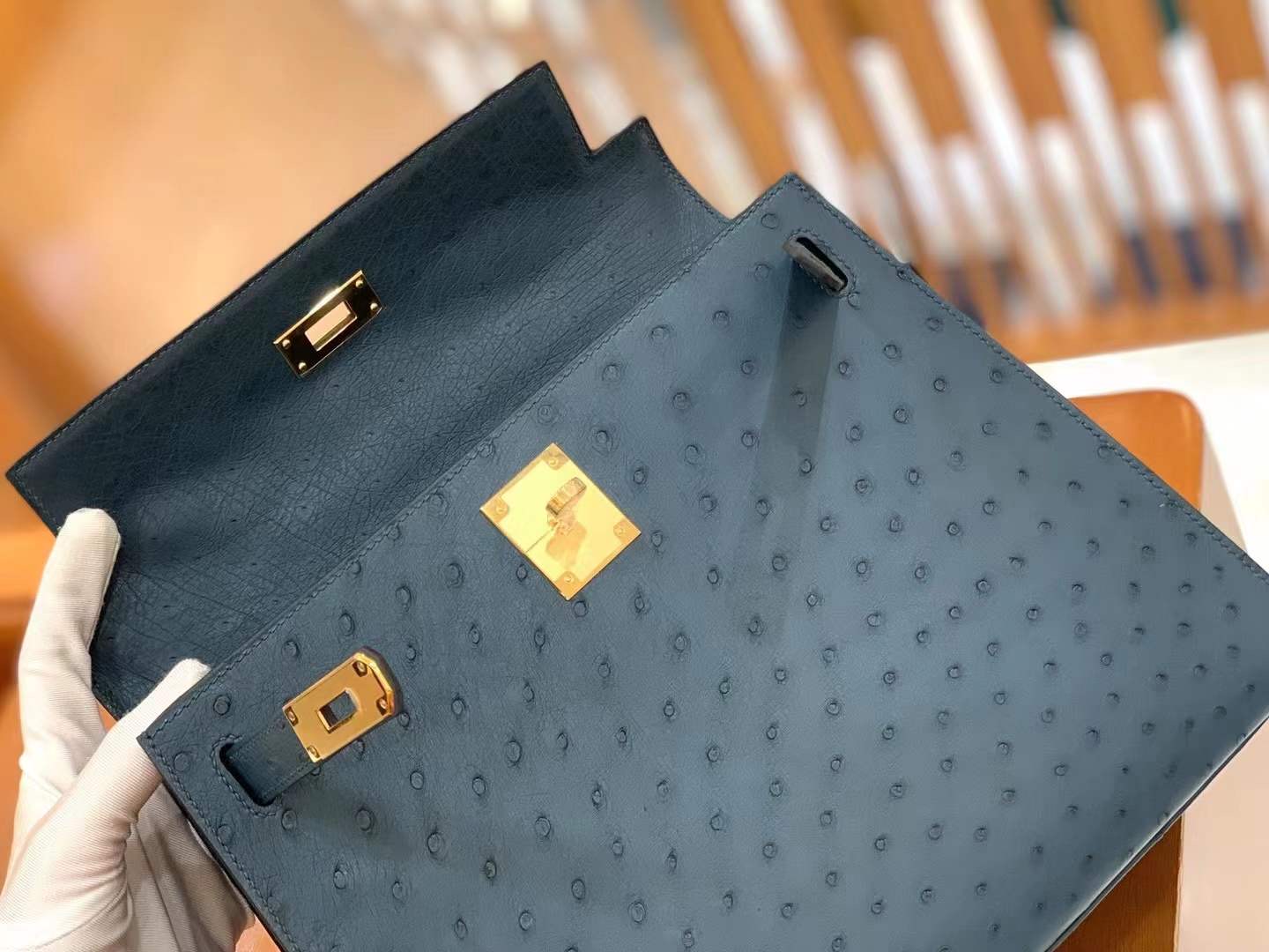 Kelly 28cm Indigo Gold BuckleImported South African KK grade ostrich leather. Hand-sewn