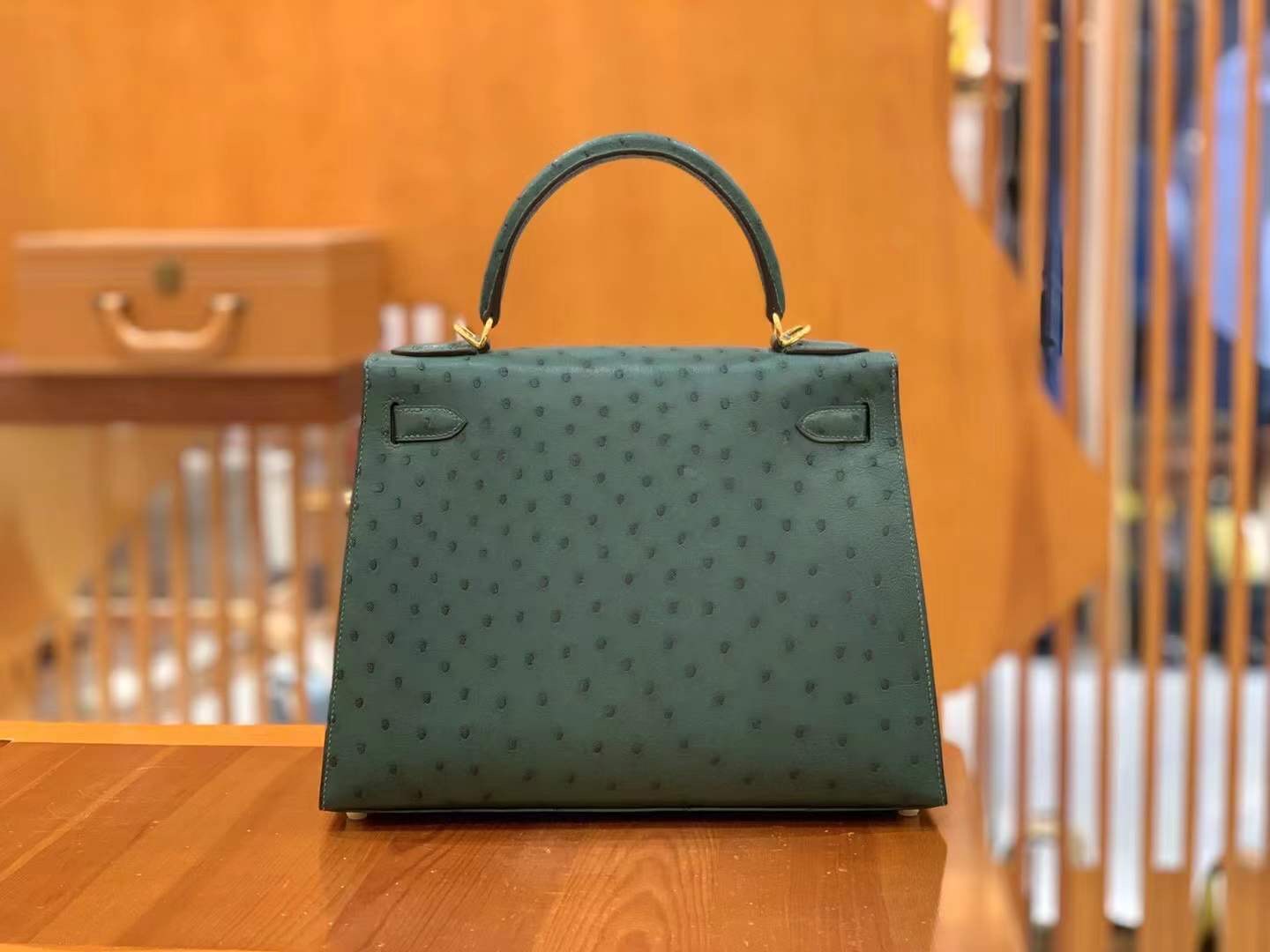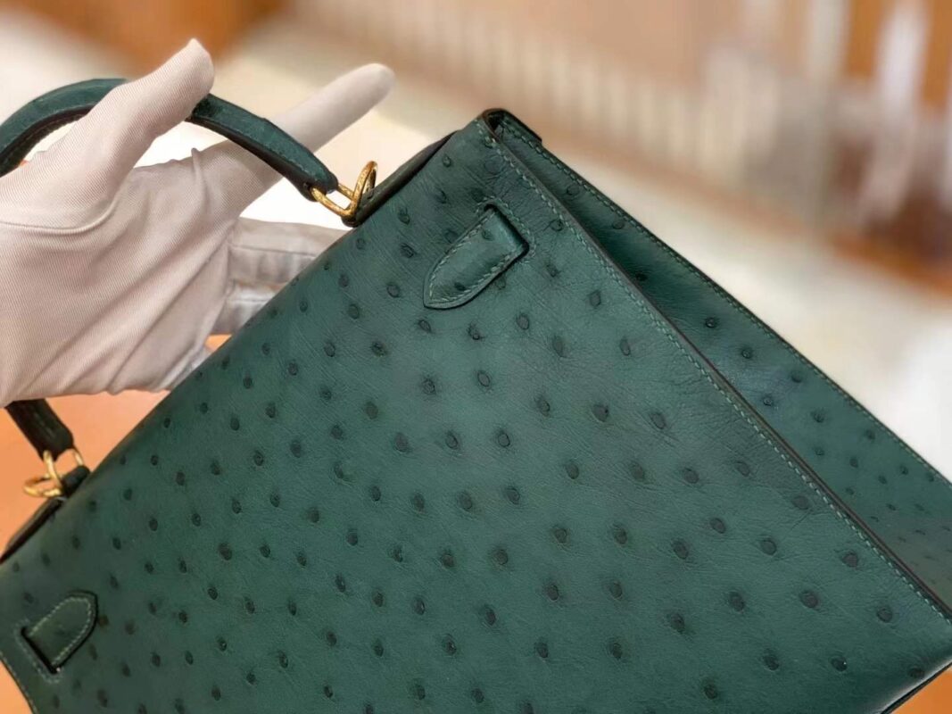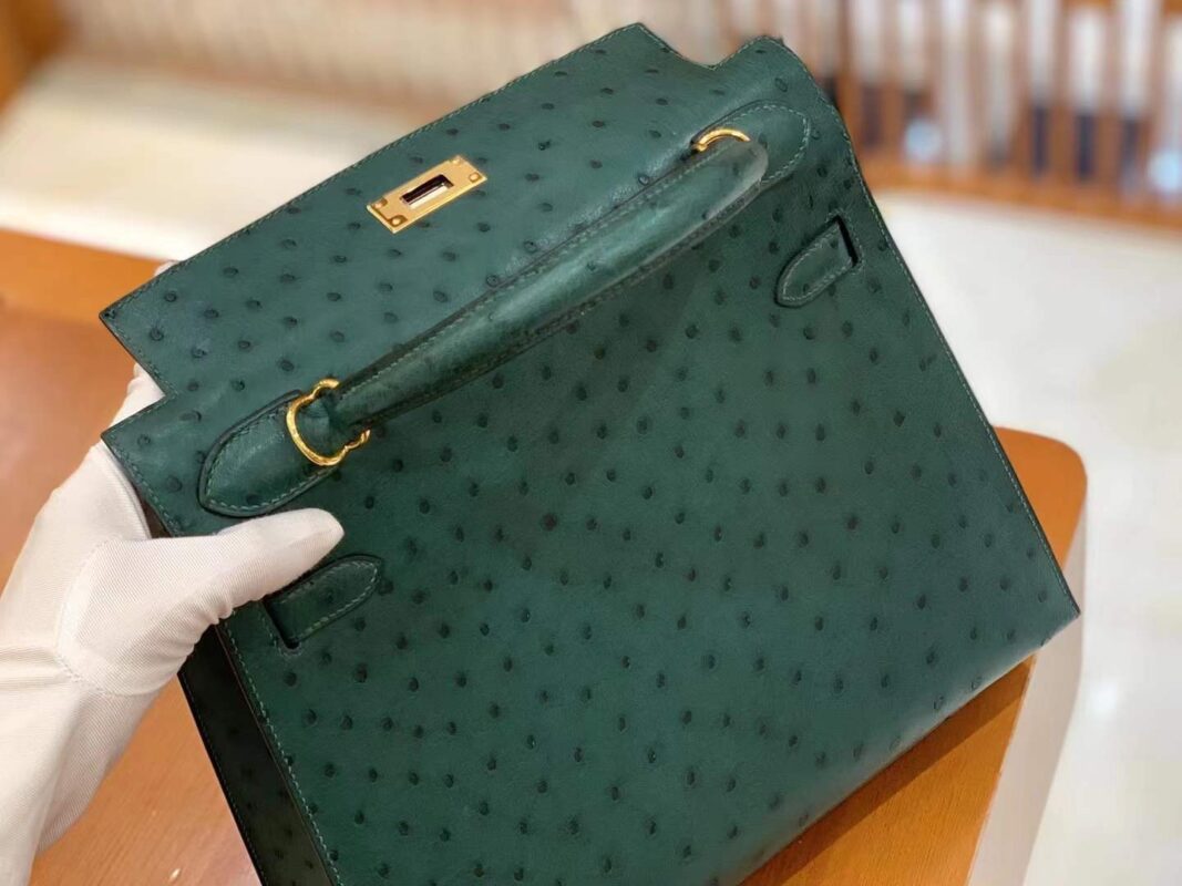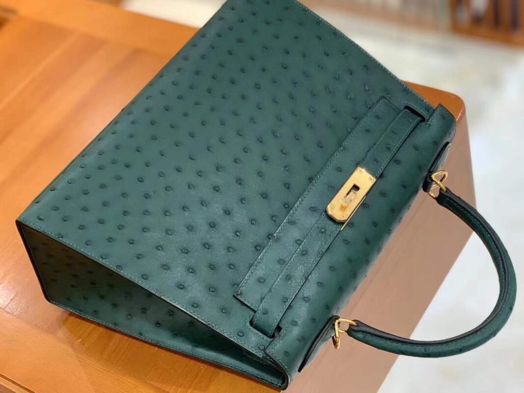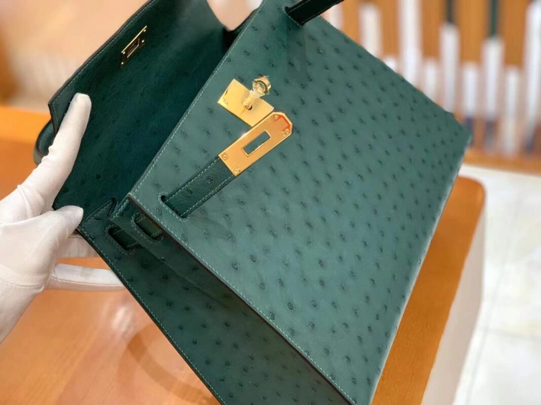 Kelly 28cm Malachite Green Gold BuckleImported South African KK grade ostrich leather. Hand-sewn