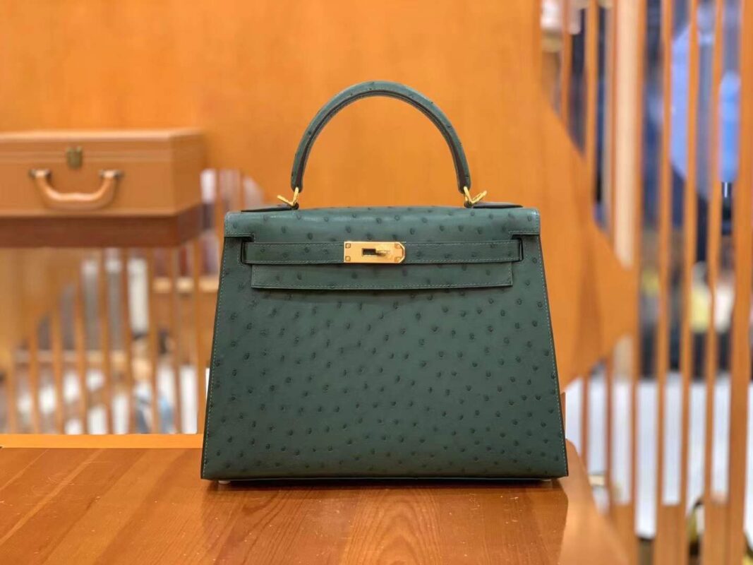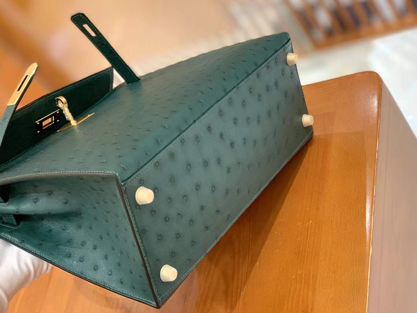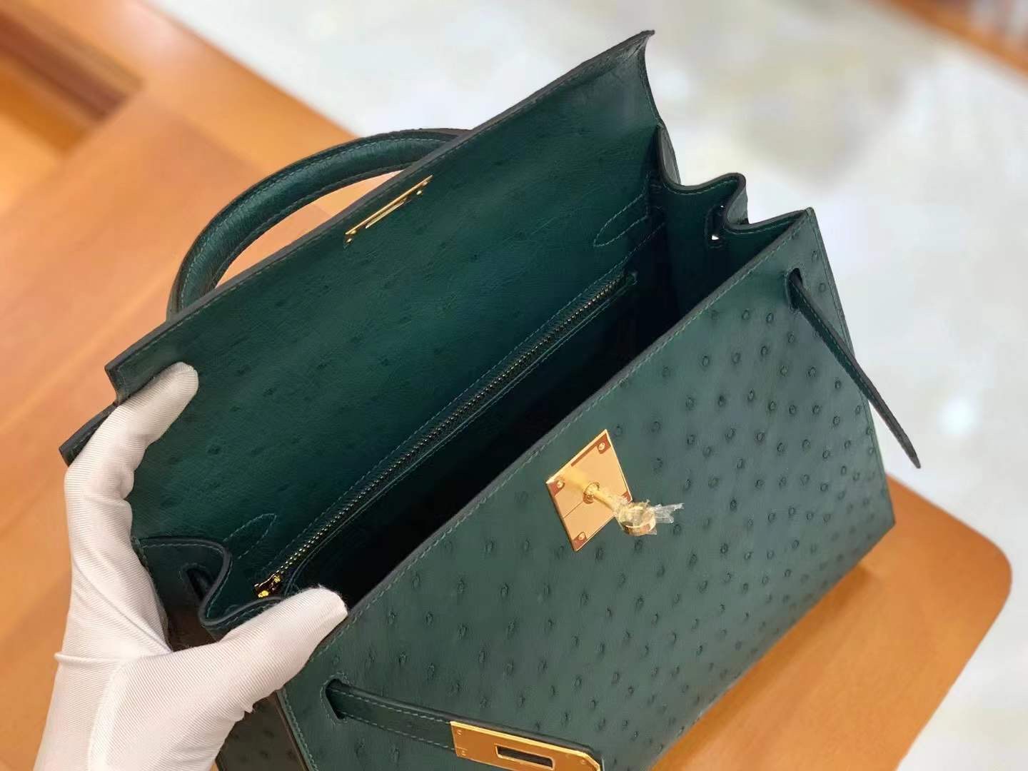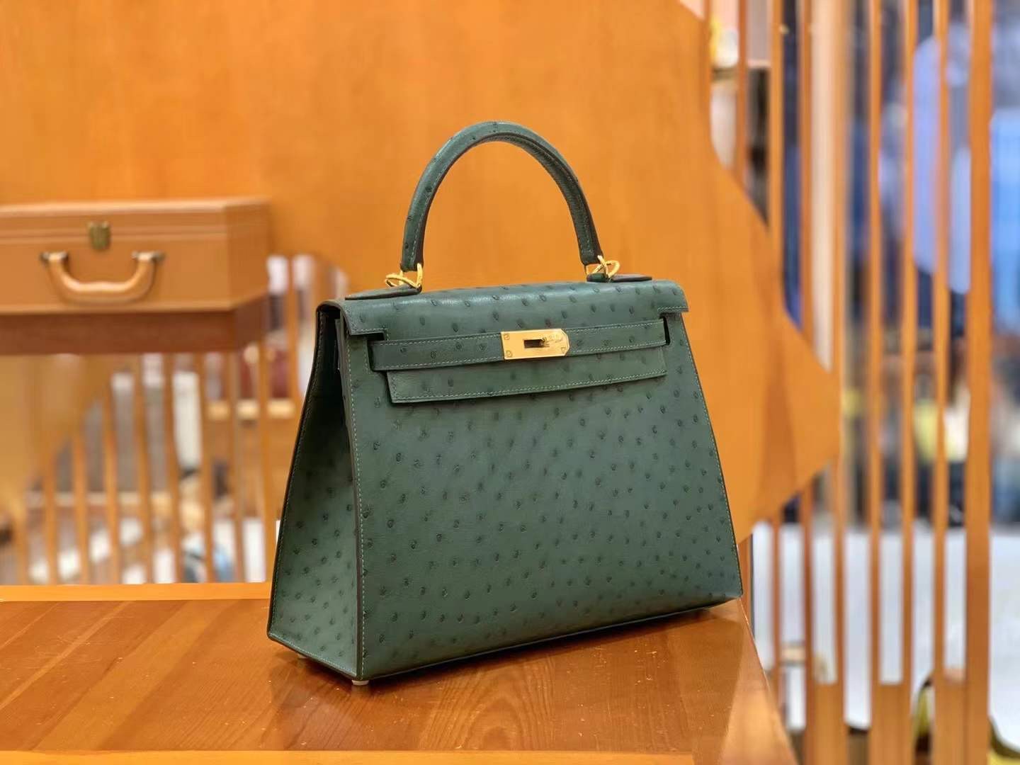 Kelly 28cm Malachite Green Gold BuckleImported South African KK grade ostrich leather. Hand-sewn
