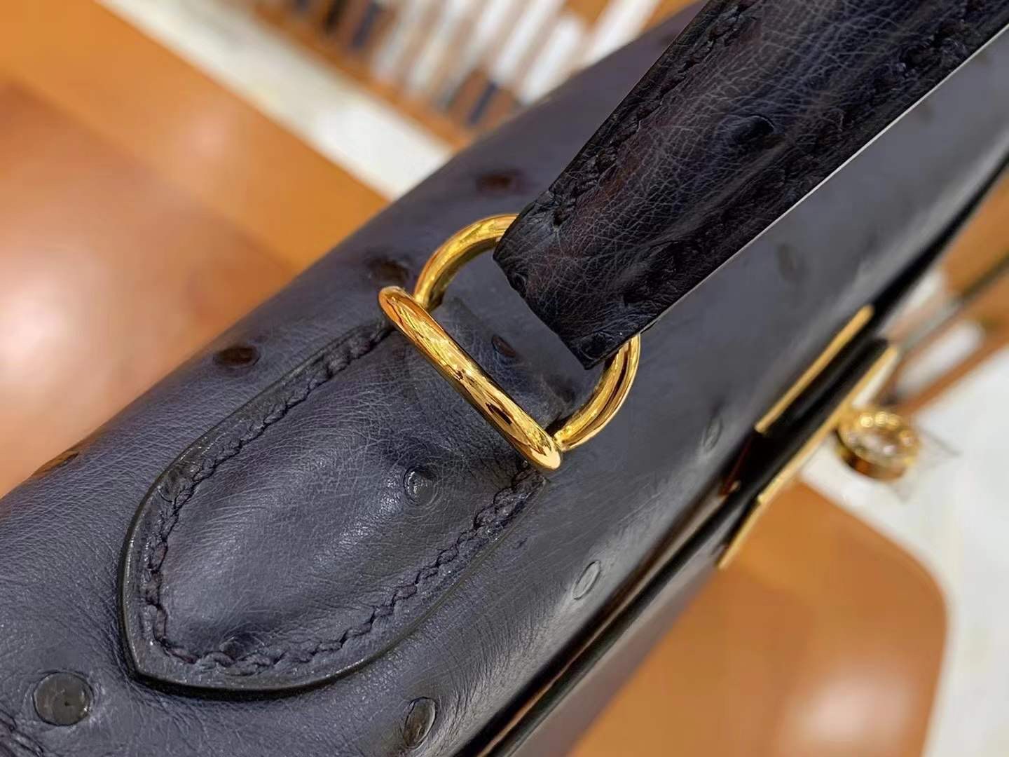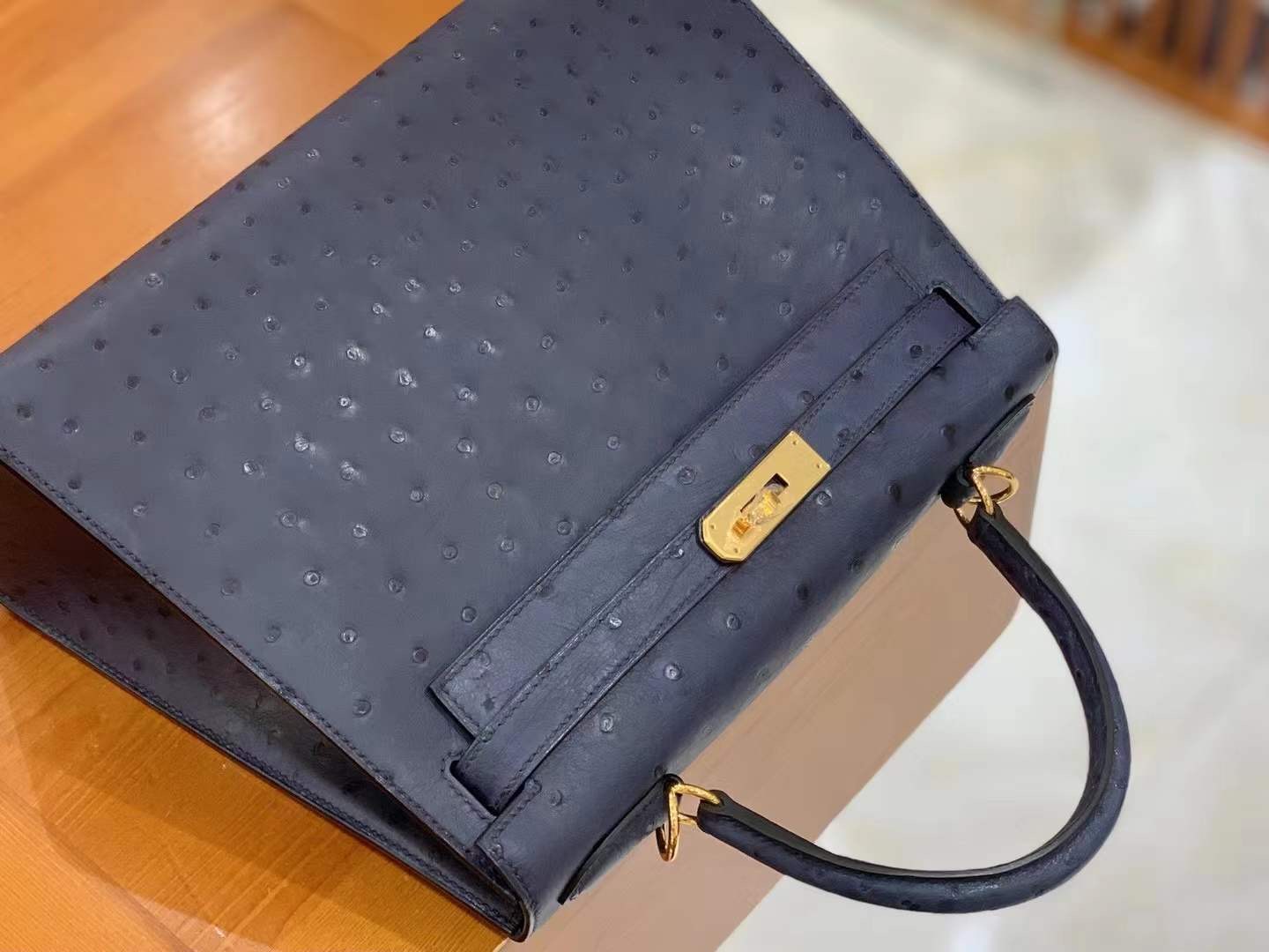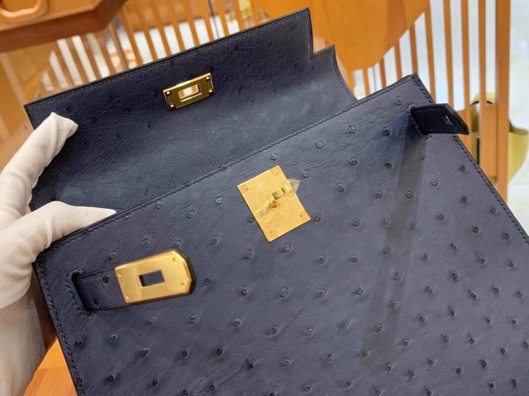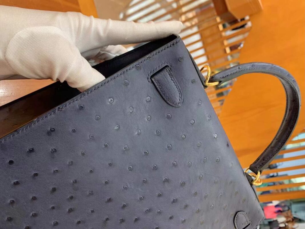 Kelly 28cm Maltese Blue Gold Buckle Imported South African KK grade ostrich leather. Hand-sewn