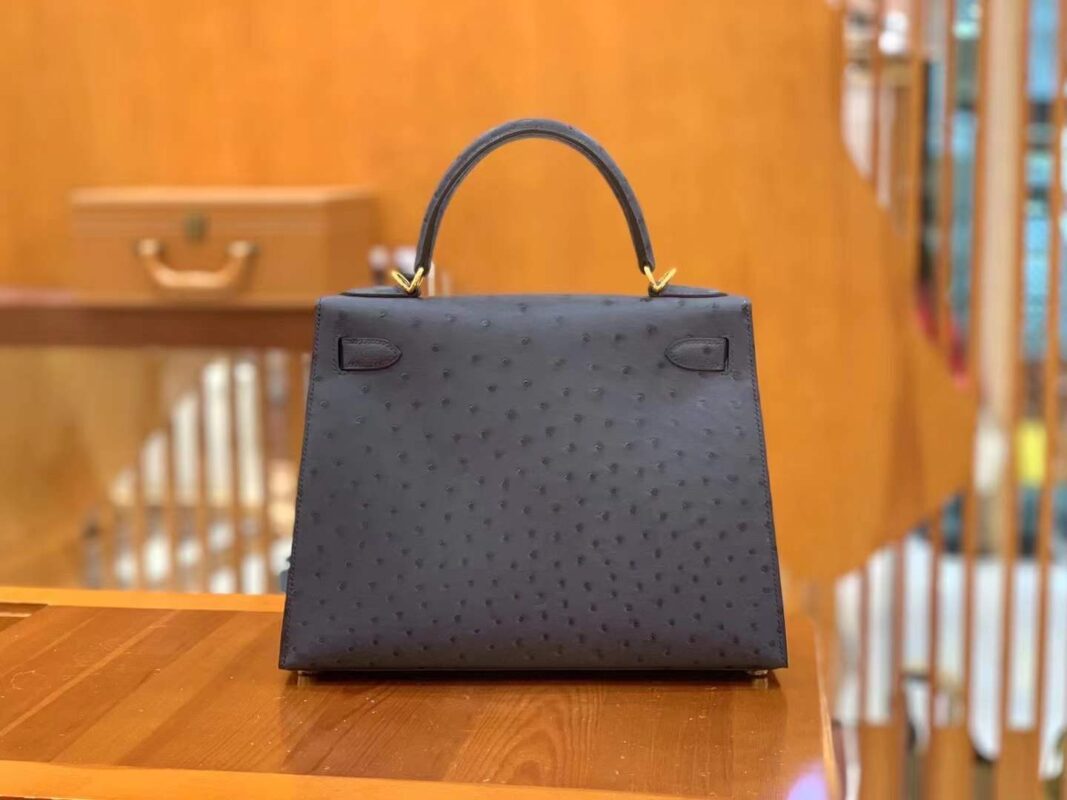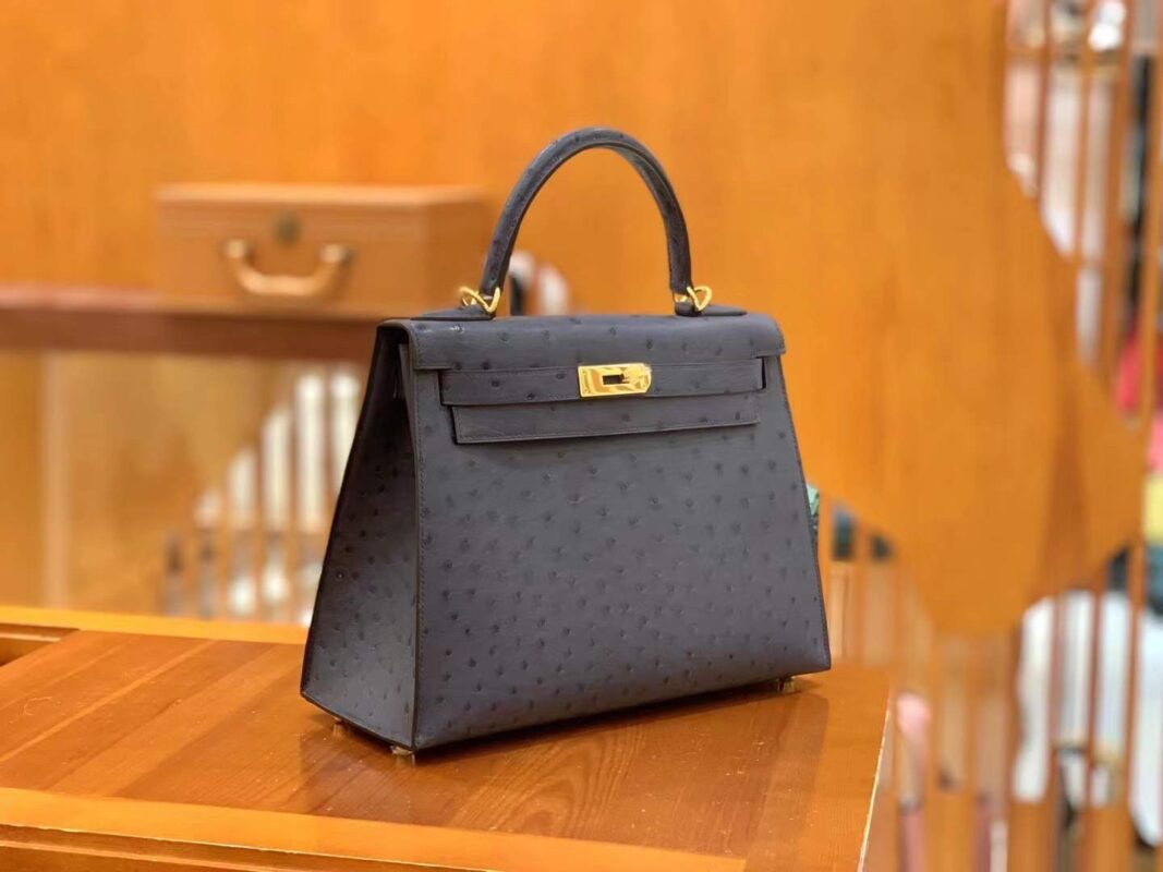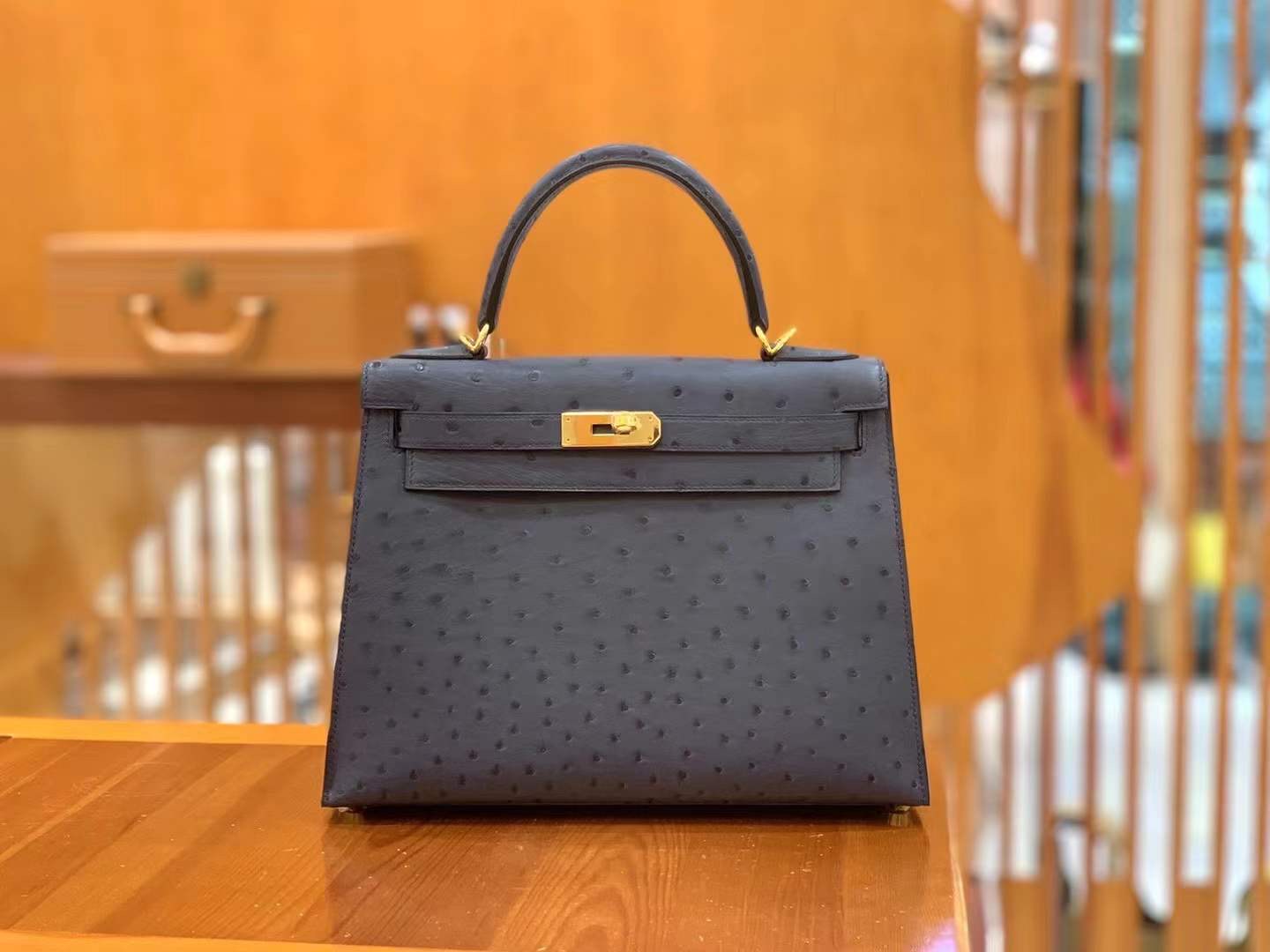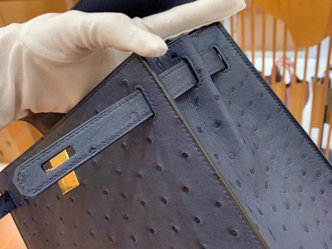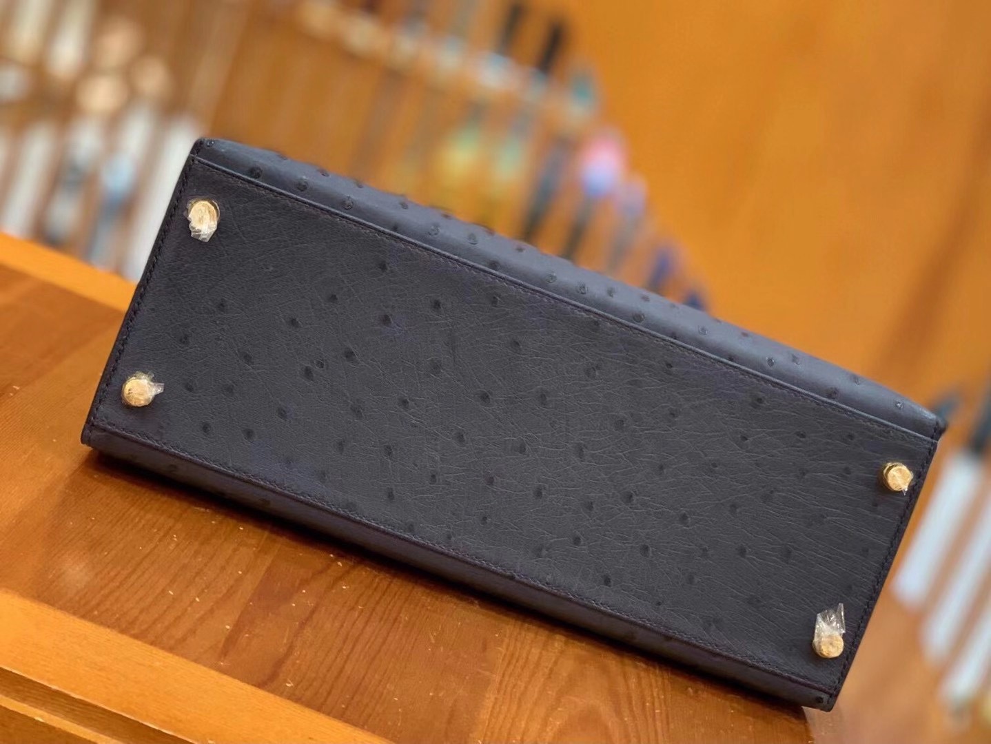 Kelly 28cm Maltese Blue Gold Buckle Imported South African KK grade ostrich leather. Hand-sewn