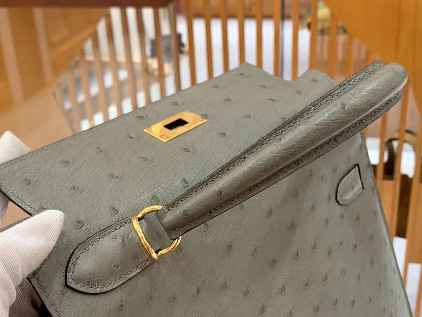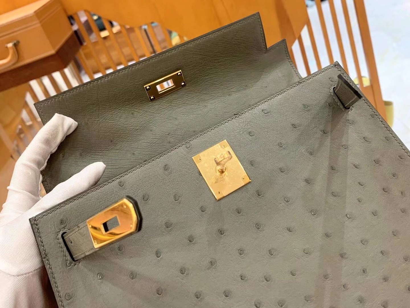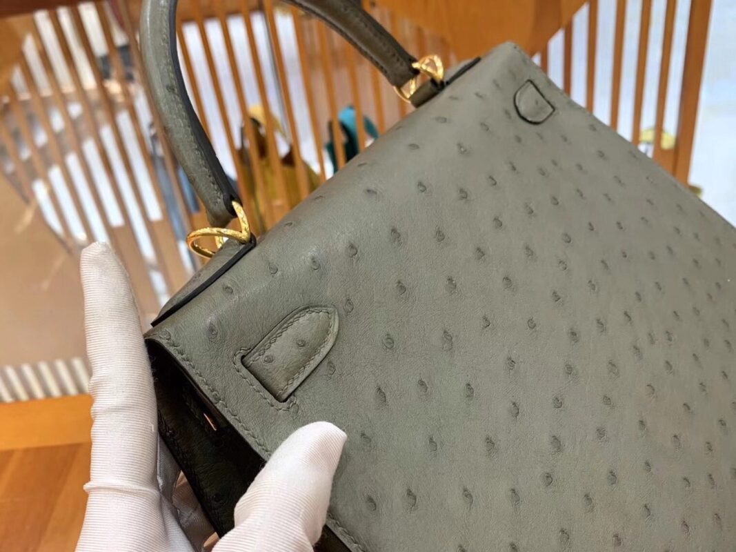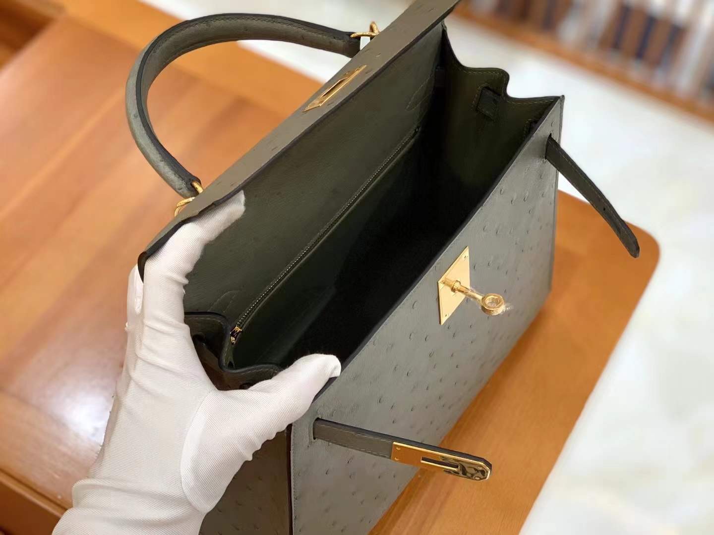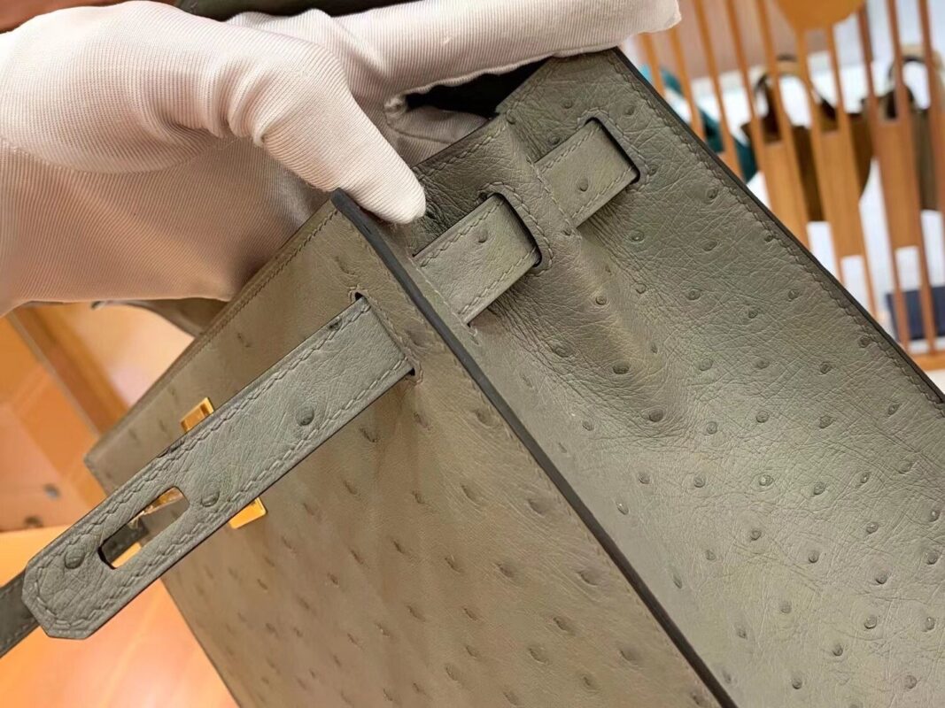 Kelly 28cm Sage Green Gold Buckle Imported South African KK grade ostrich leather. Hand-sewn