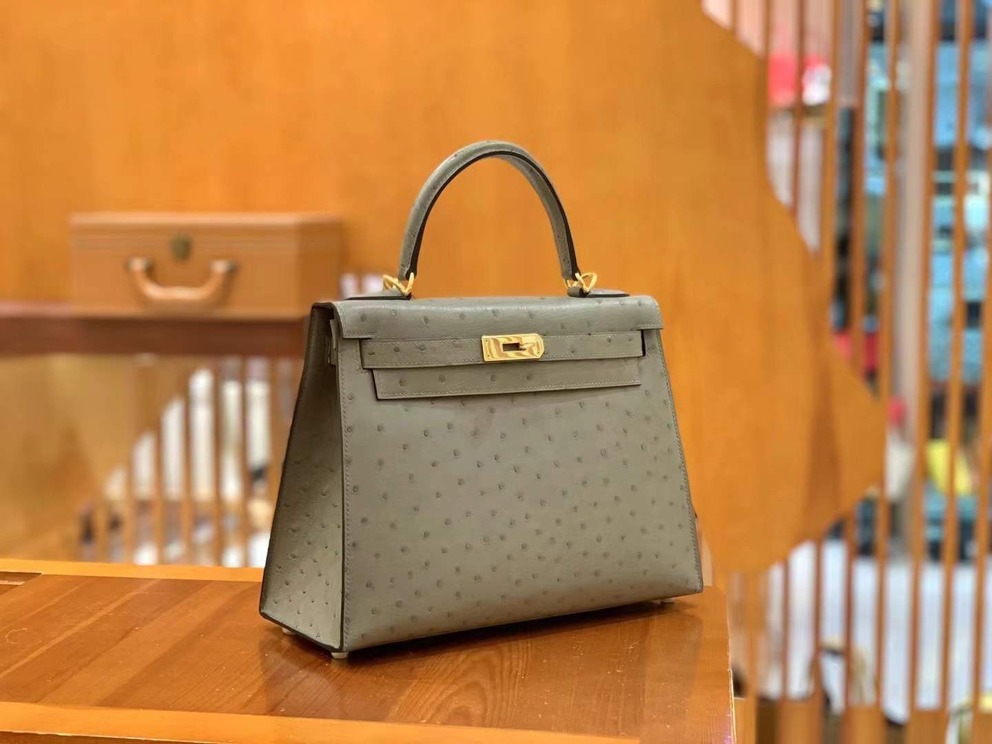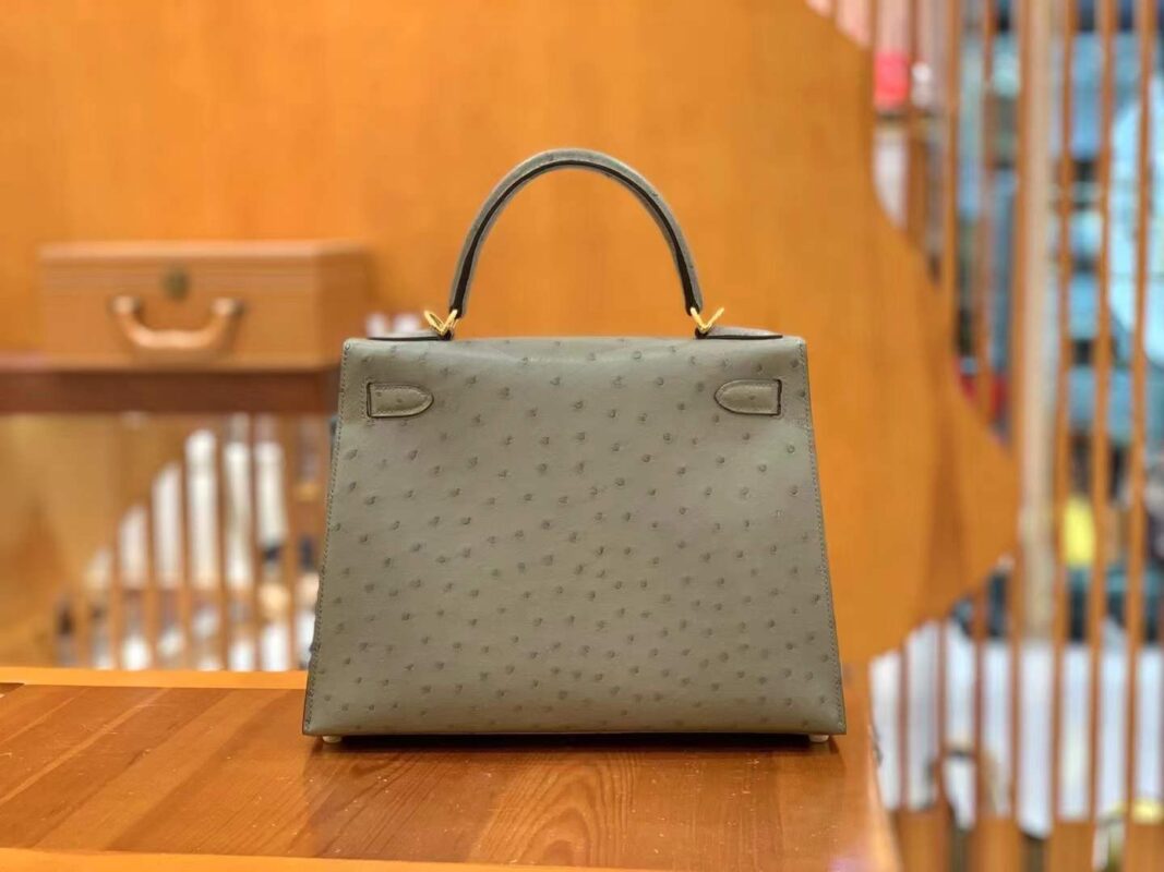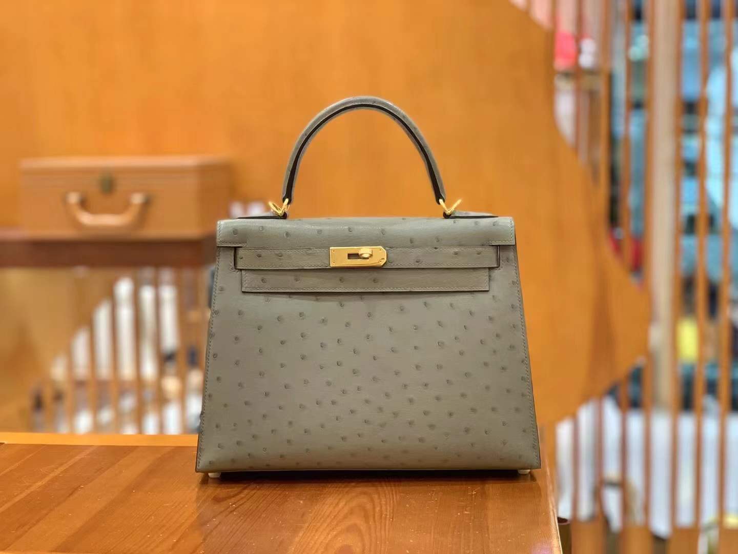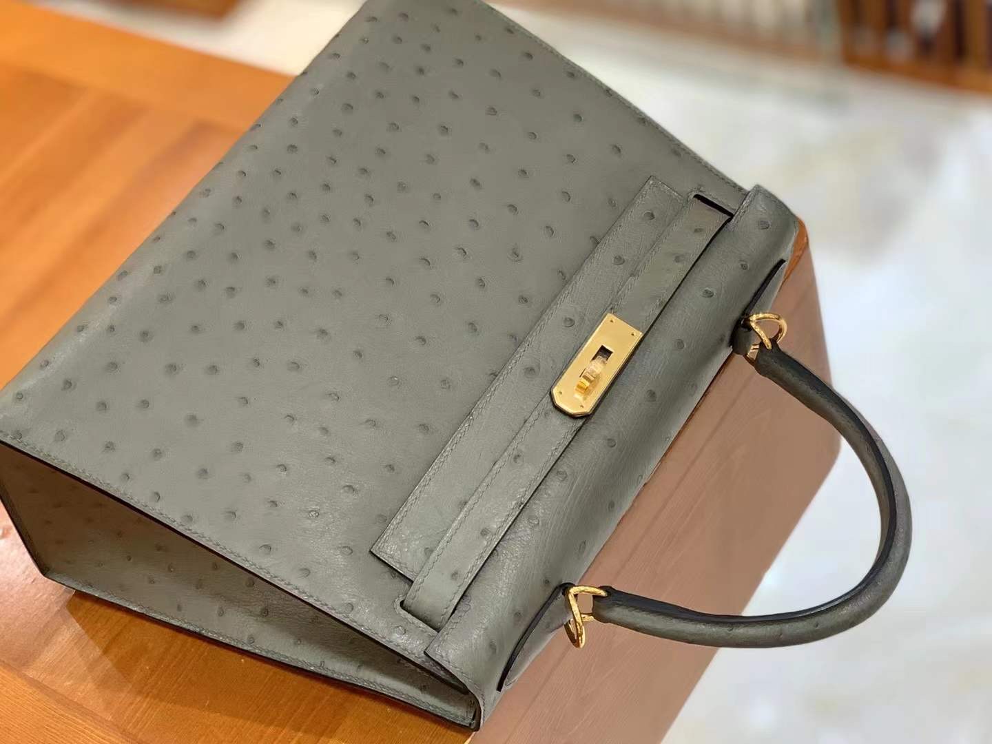 Kelly 28cm Sage Green Gold Buckle Imported South African KK grade ostrich leather. Hand-sewn