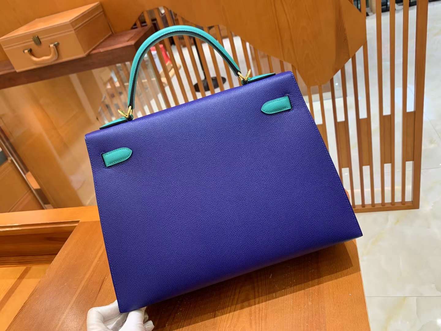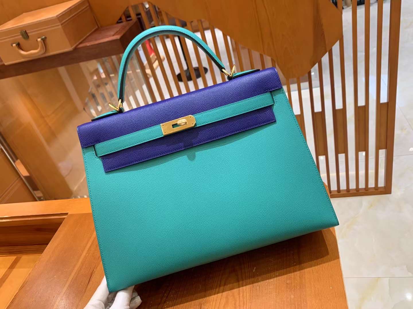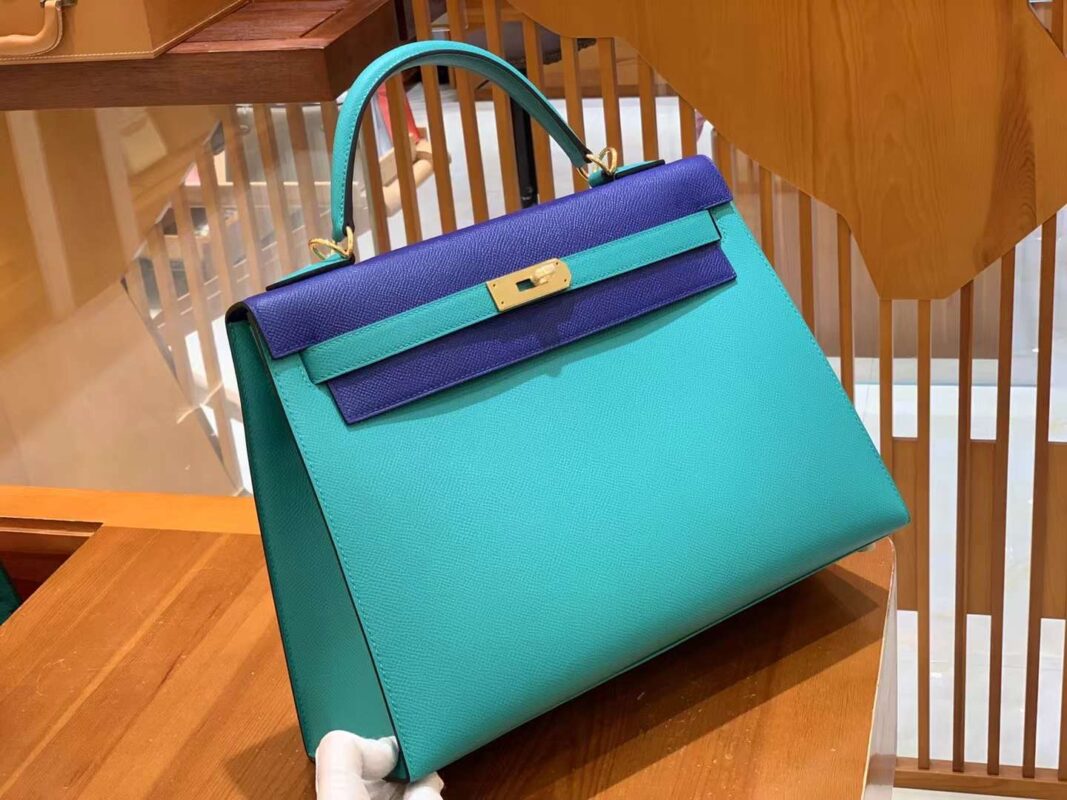 Kelly 32cm Epsom Verona Green and Electric Blue. Gold Buckle