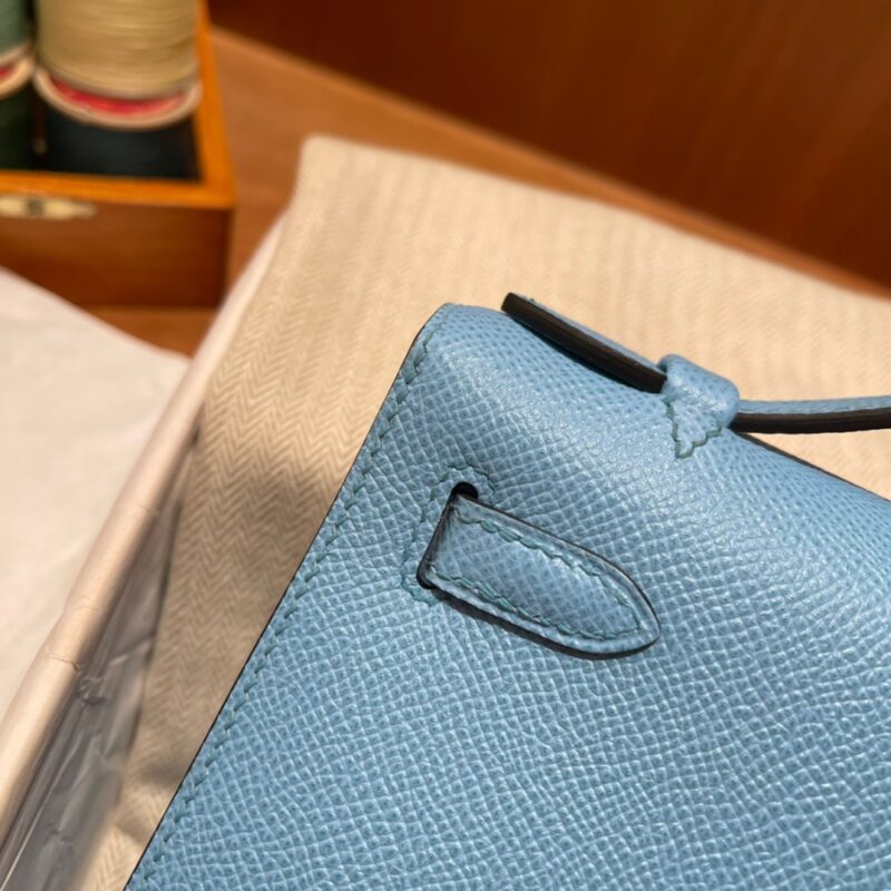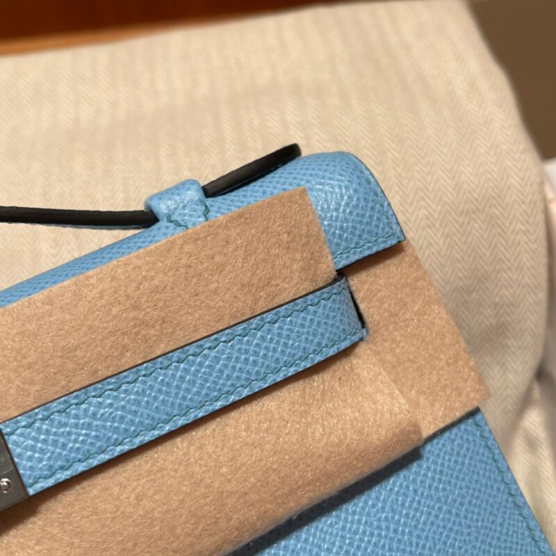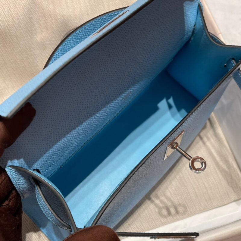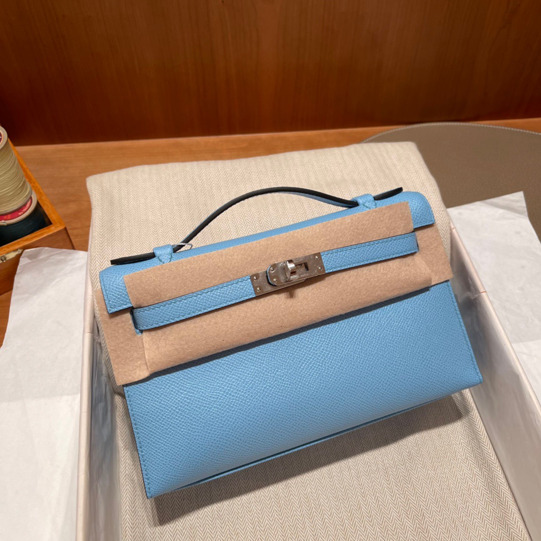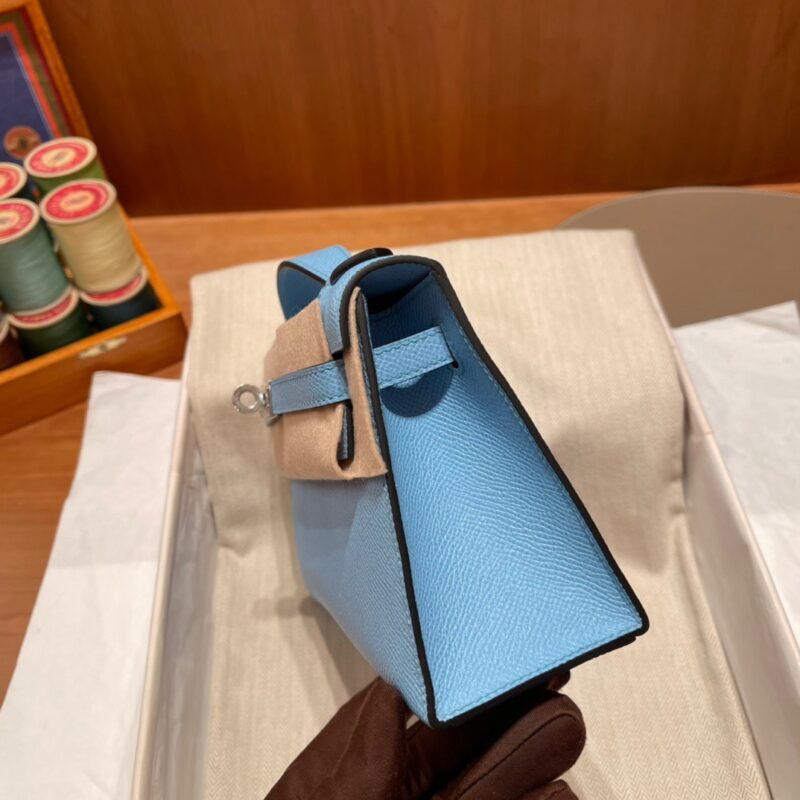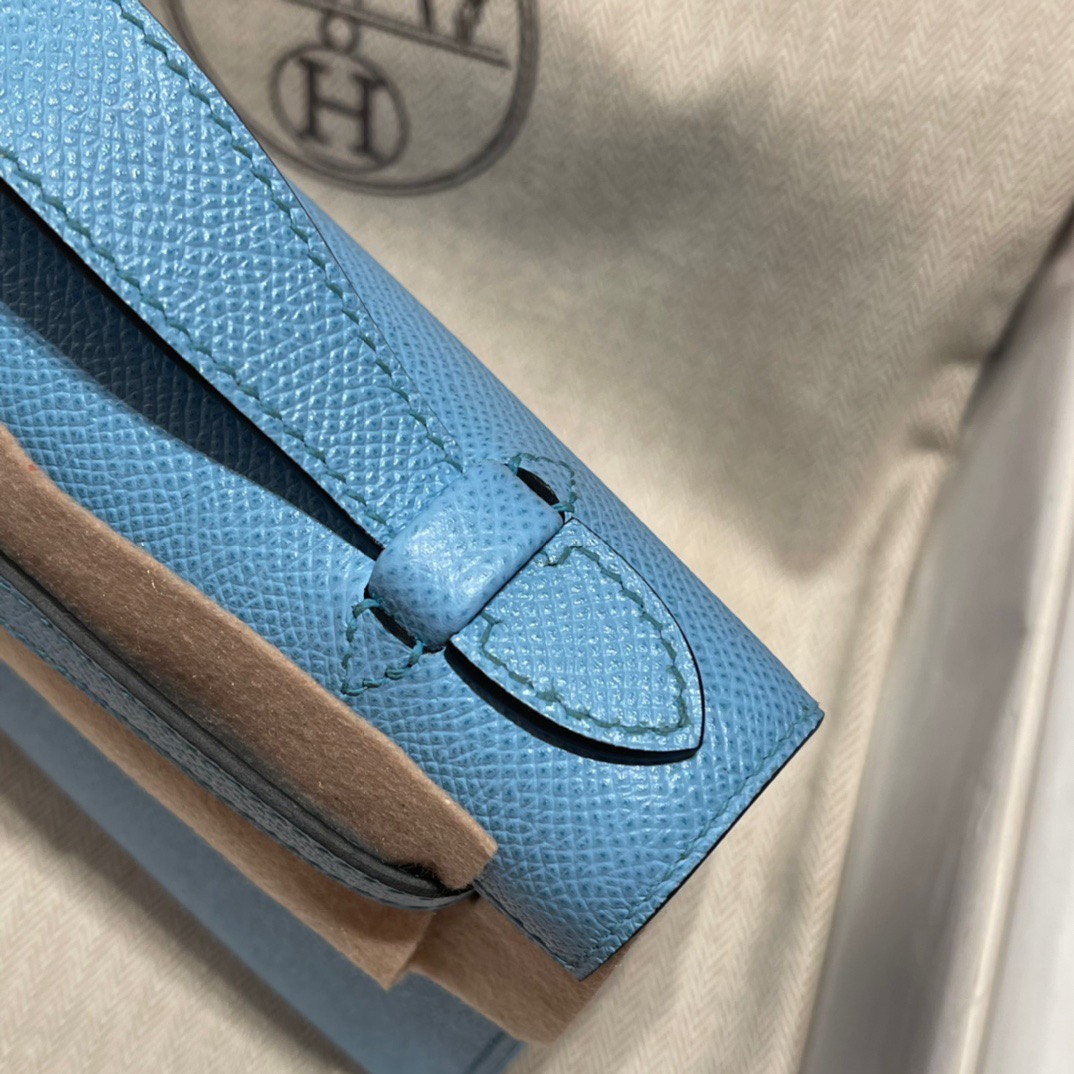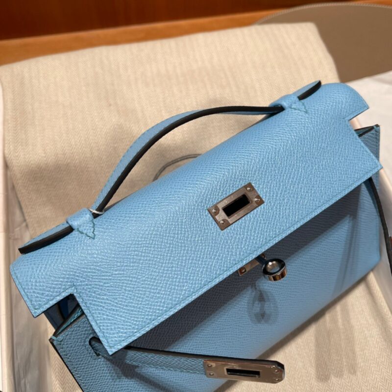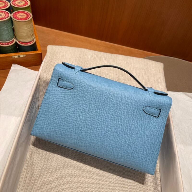 Kelly Pochette First Generation. Epsom leather. 110 Carrie. Silver Buckle. 7N Candy Blue. Silver Buckle.