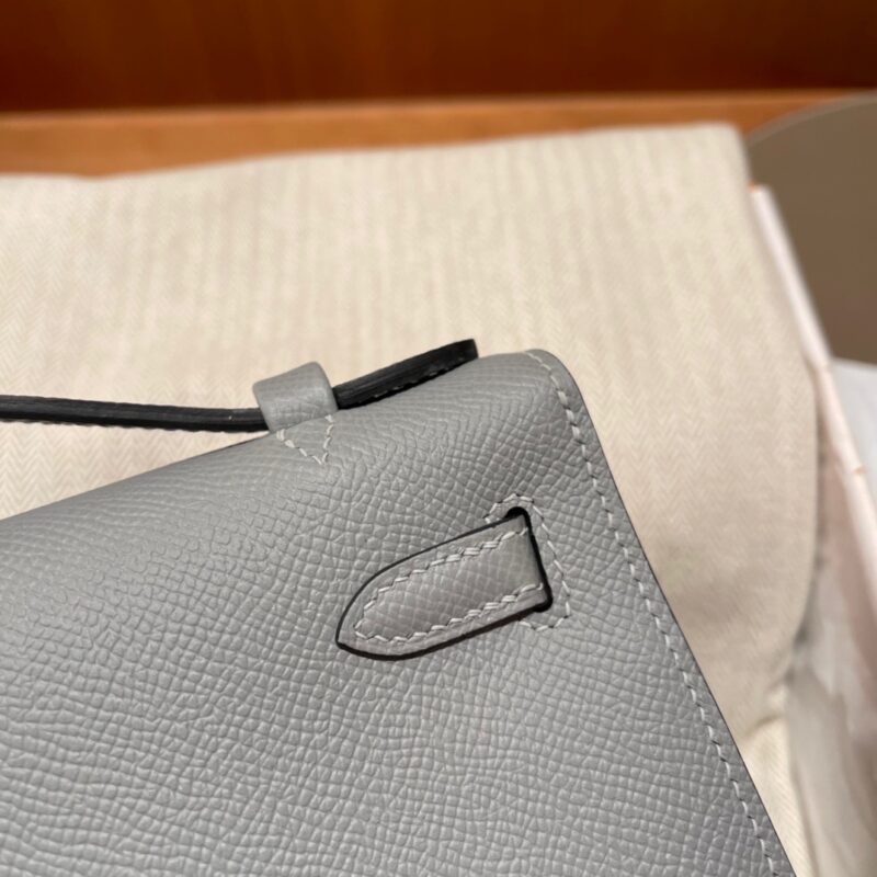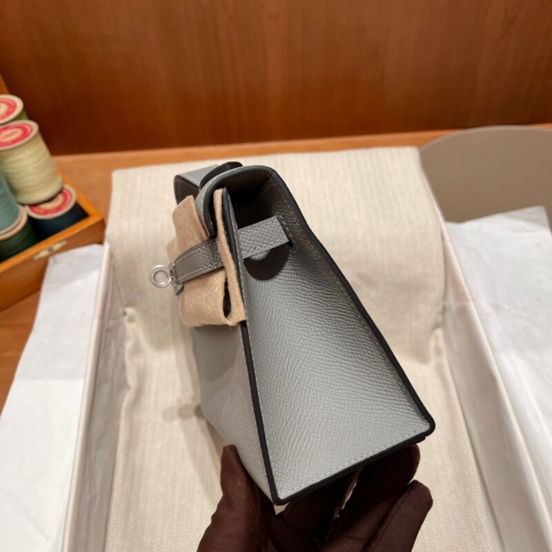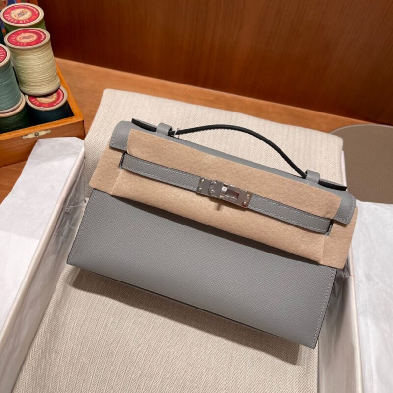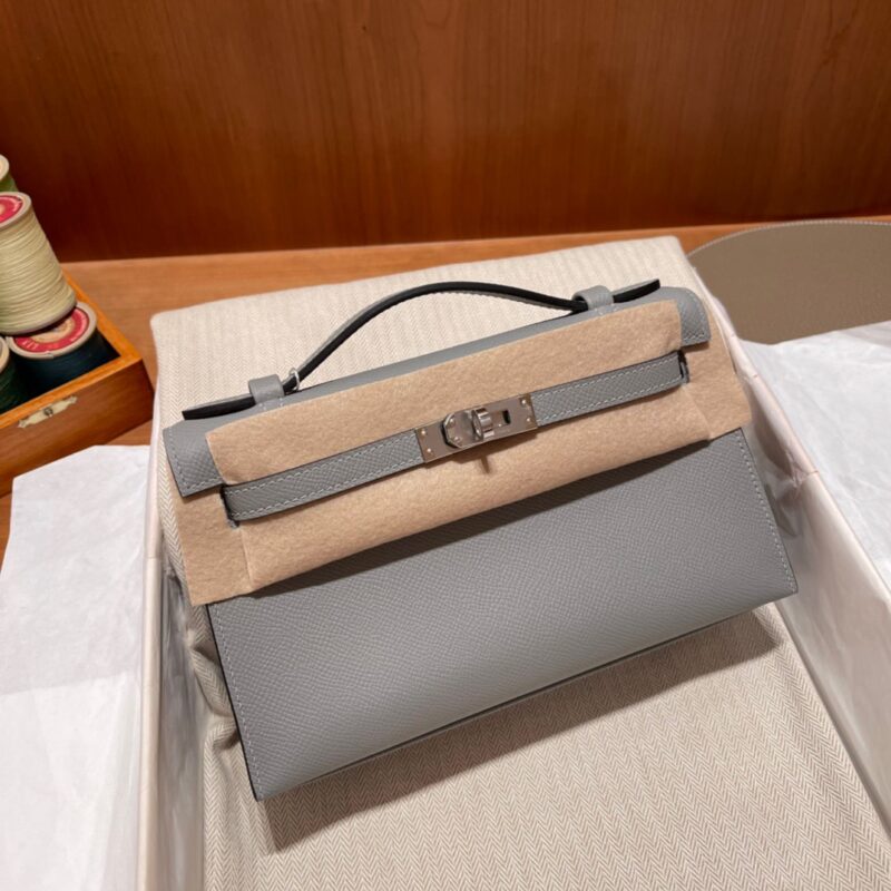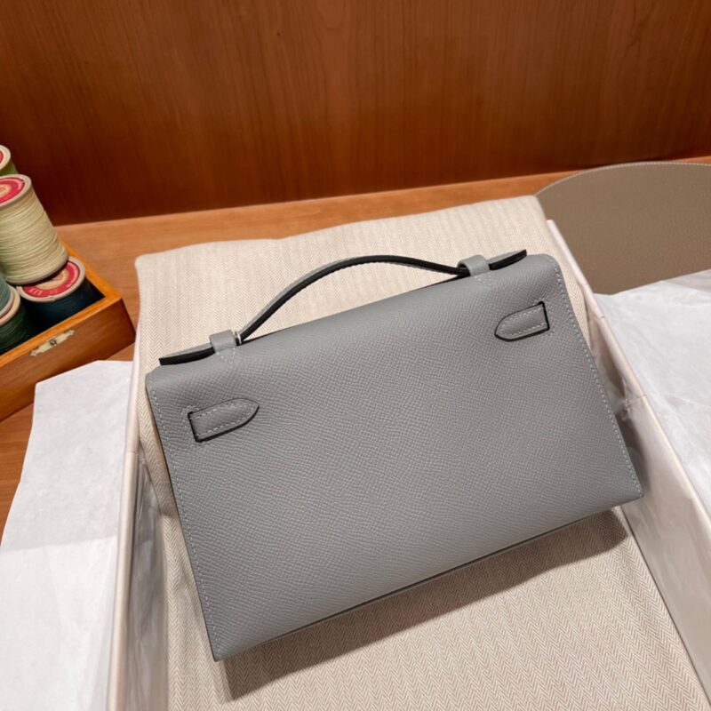 Kelly Pochette First Generation. Epsom leather. 4Z Gris Mouette. Silver Buckle.