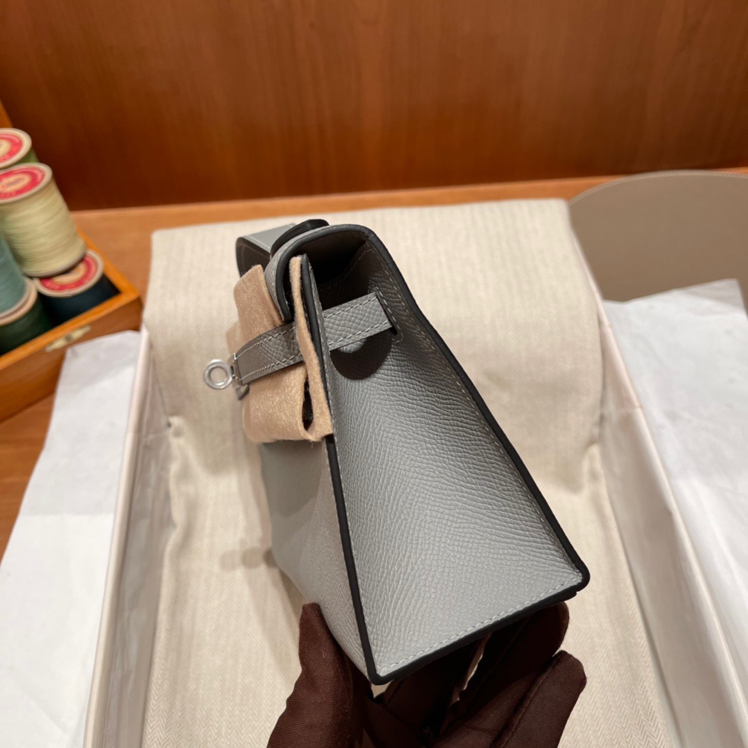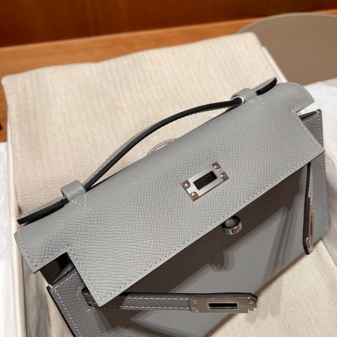 Kelly Pochette First Generation. Epsom leather. 4Z Gris Mouette. Silver Buckle.