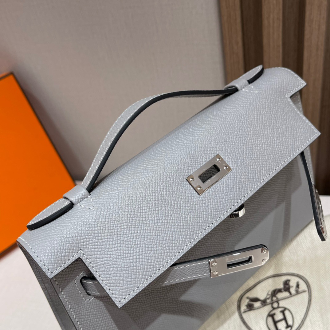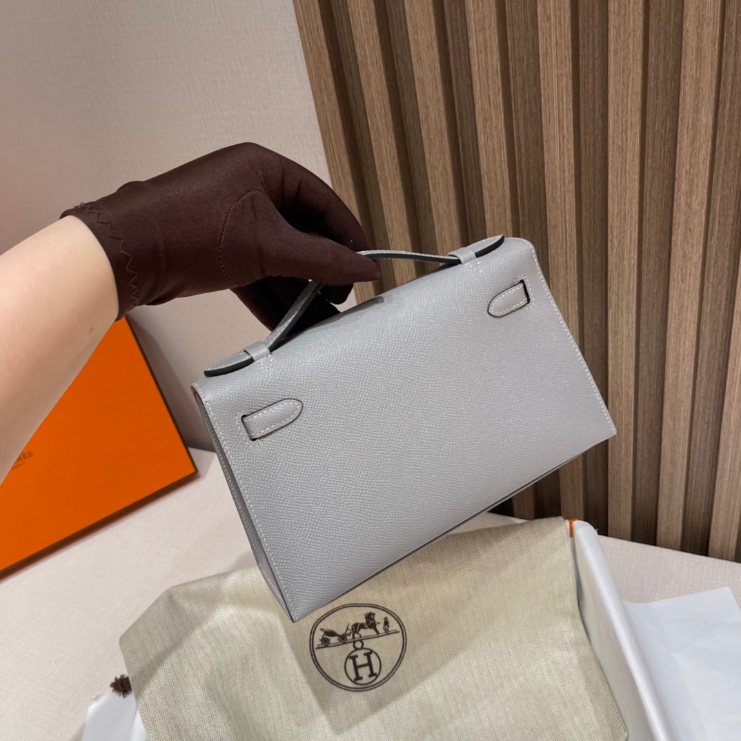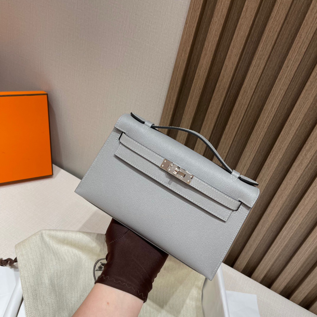 Kelly Pochette Generation 22cm. Epsom leather 4Z Seagull Gray (Gris Mouette). Silver Buckle.