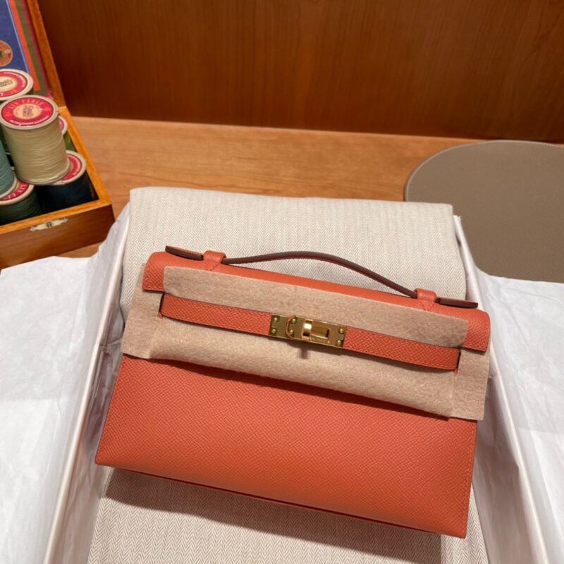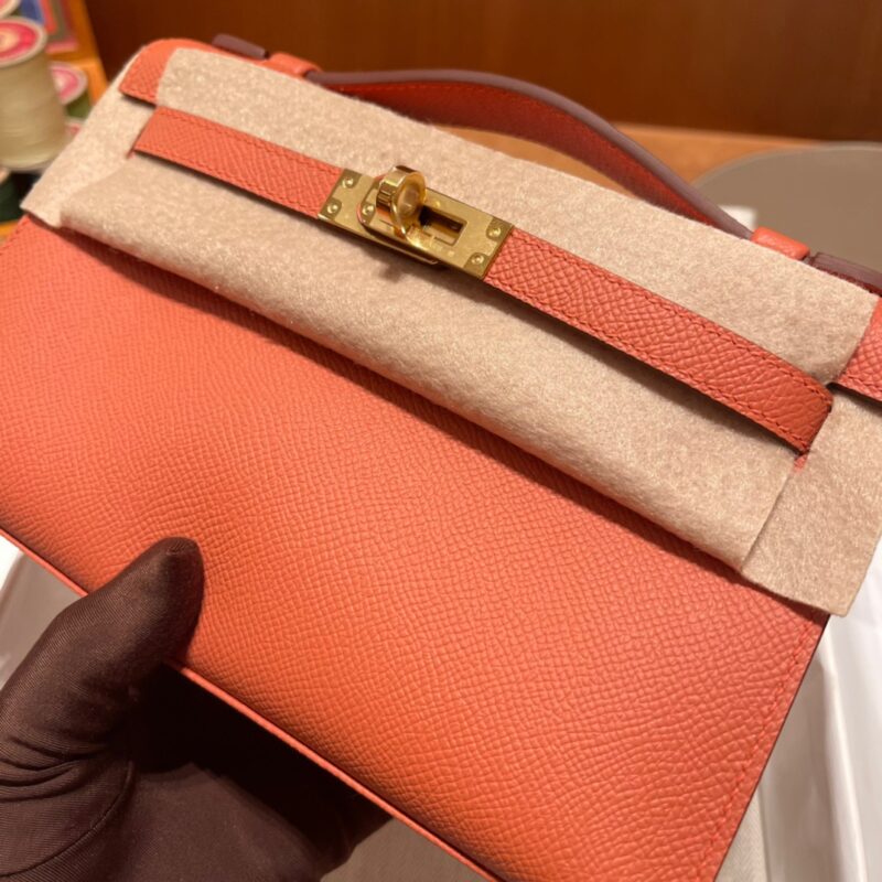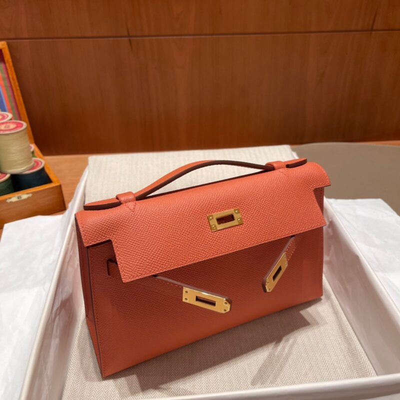 Kelly Pochette First Generation. Epsom leather. 3L Rose Tea Pink. Gold Buckle.