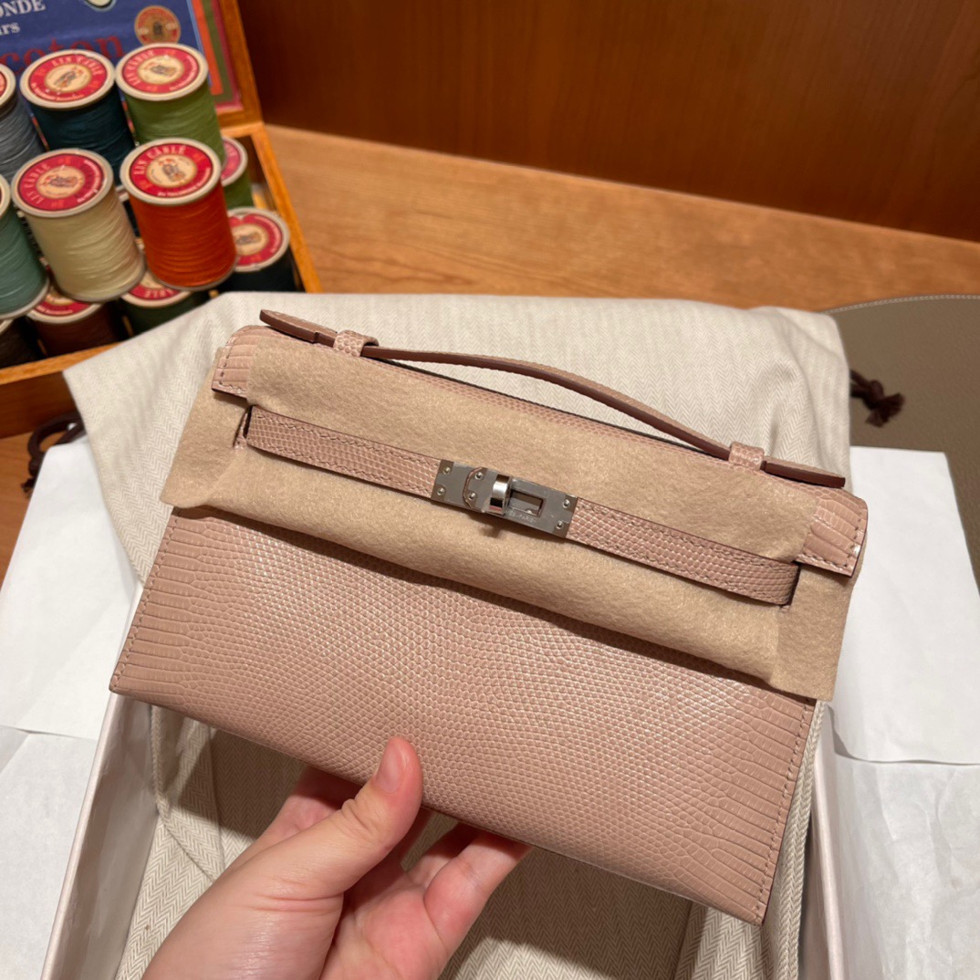 Kelly Pochette Lizard leather. 1P Rose Eglantine. Silver Buckle.