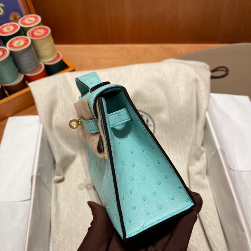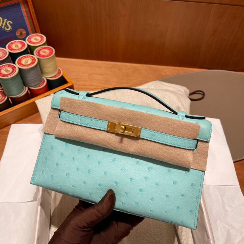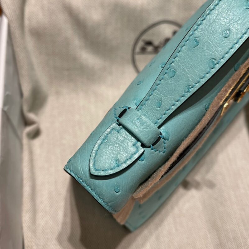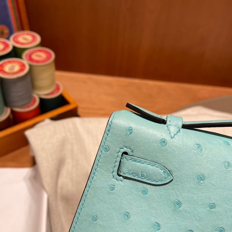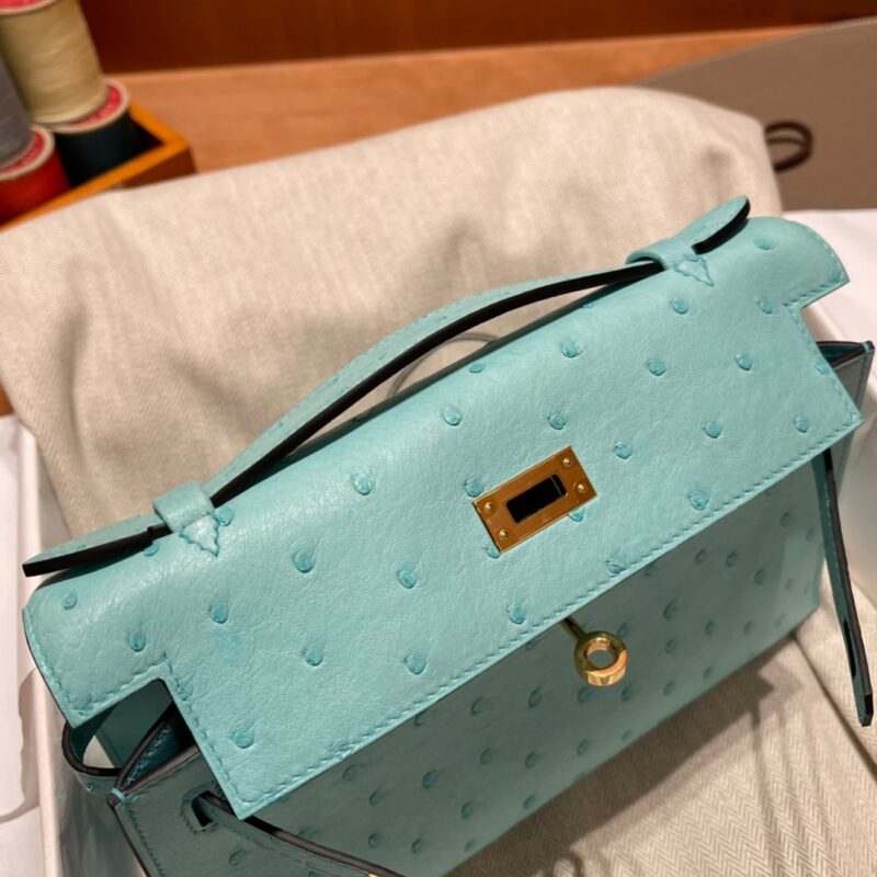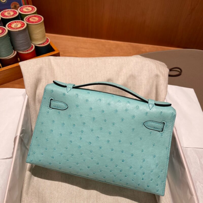 Kelly Pochette Generation South African Ostrich kk leather. 3P Macaron Blue (Blue Atoll). Silver Buckle.
