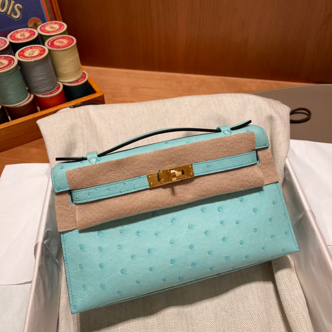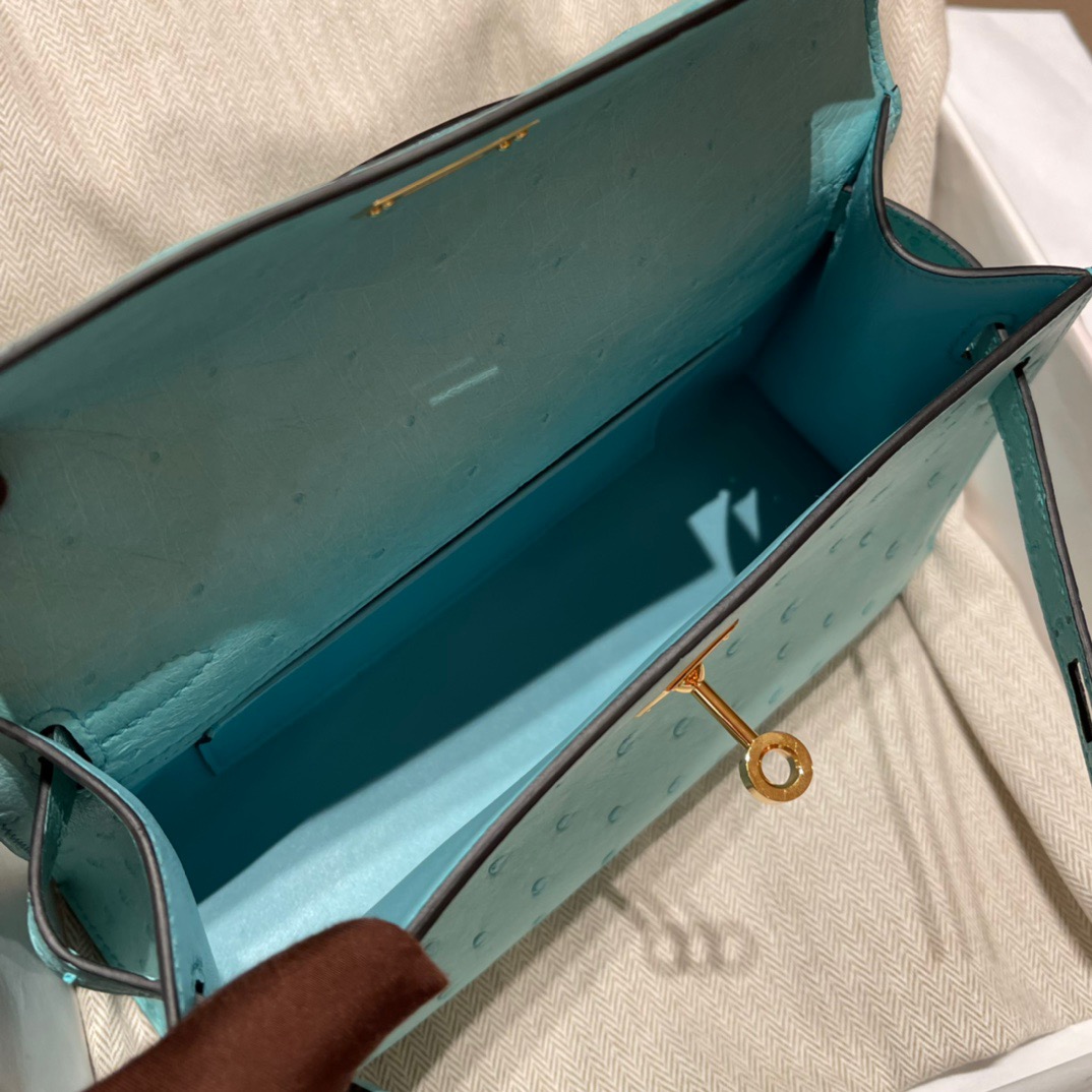 Kelly Pochette Generation South African Ostrich kk leather. 3P Macaron Blue (Blue Atoll). Silver Buckle.