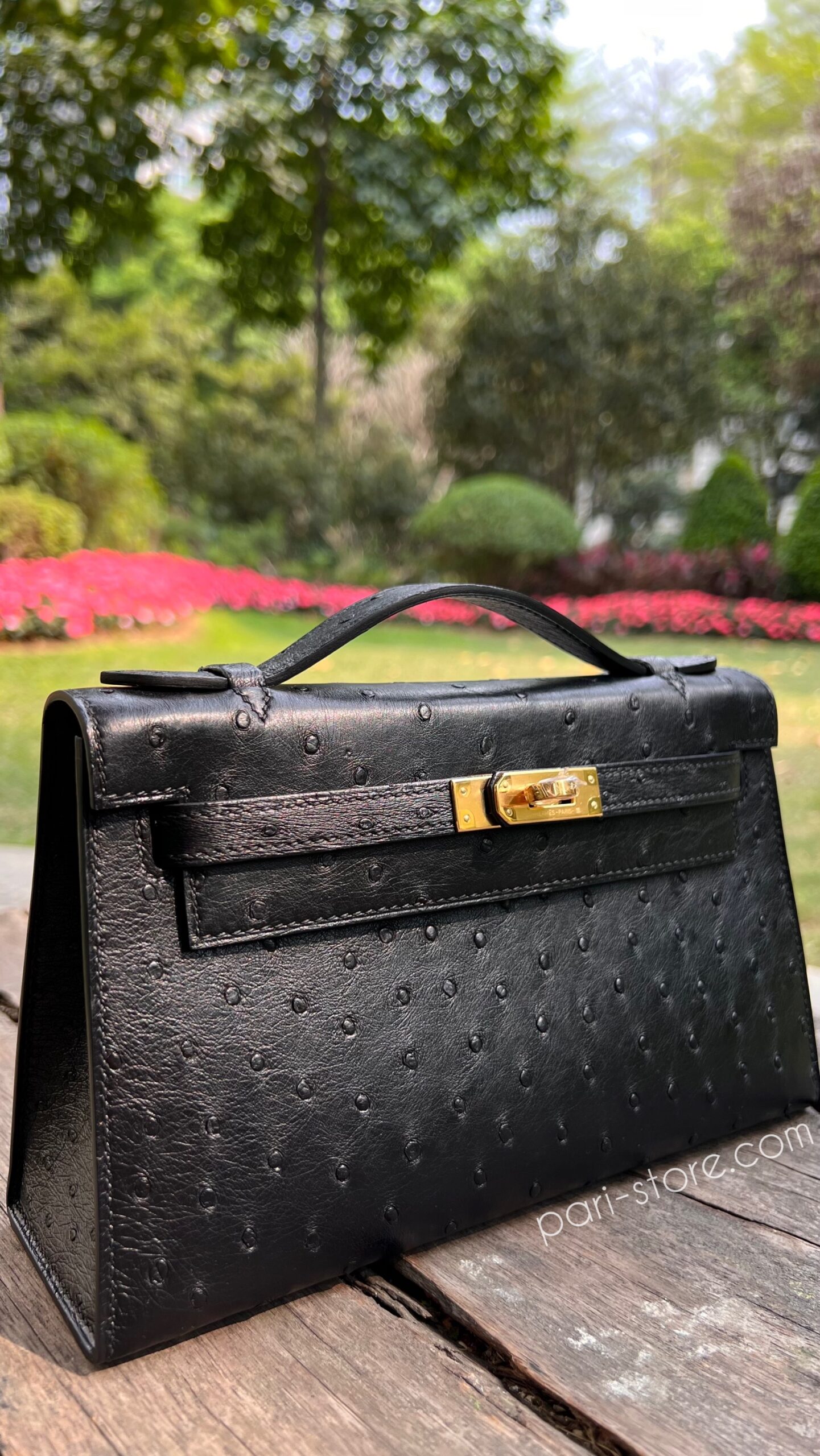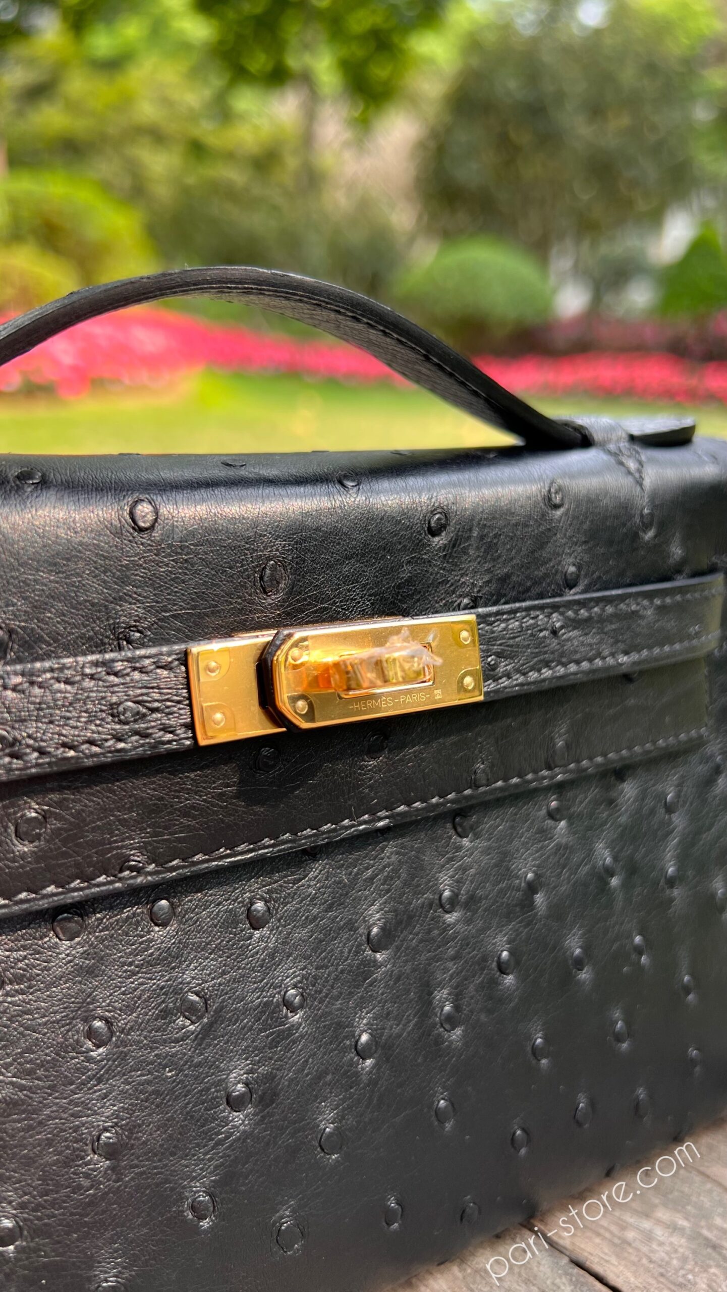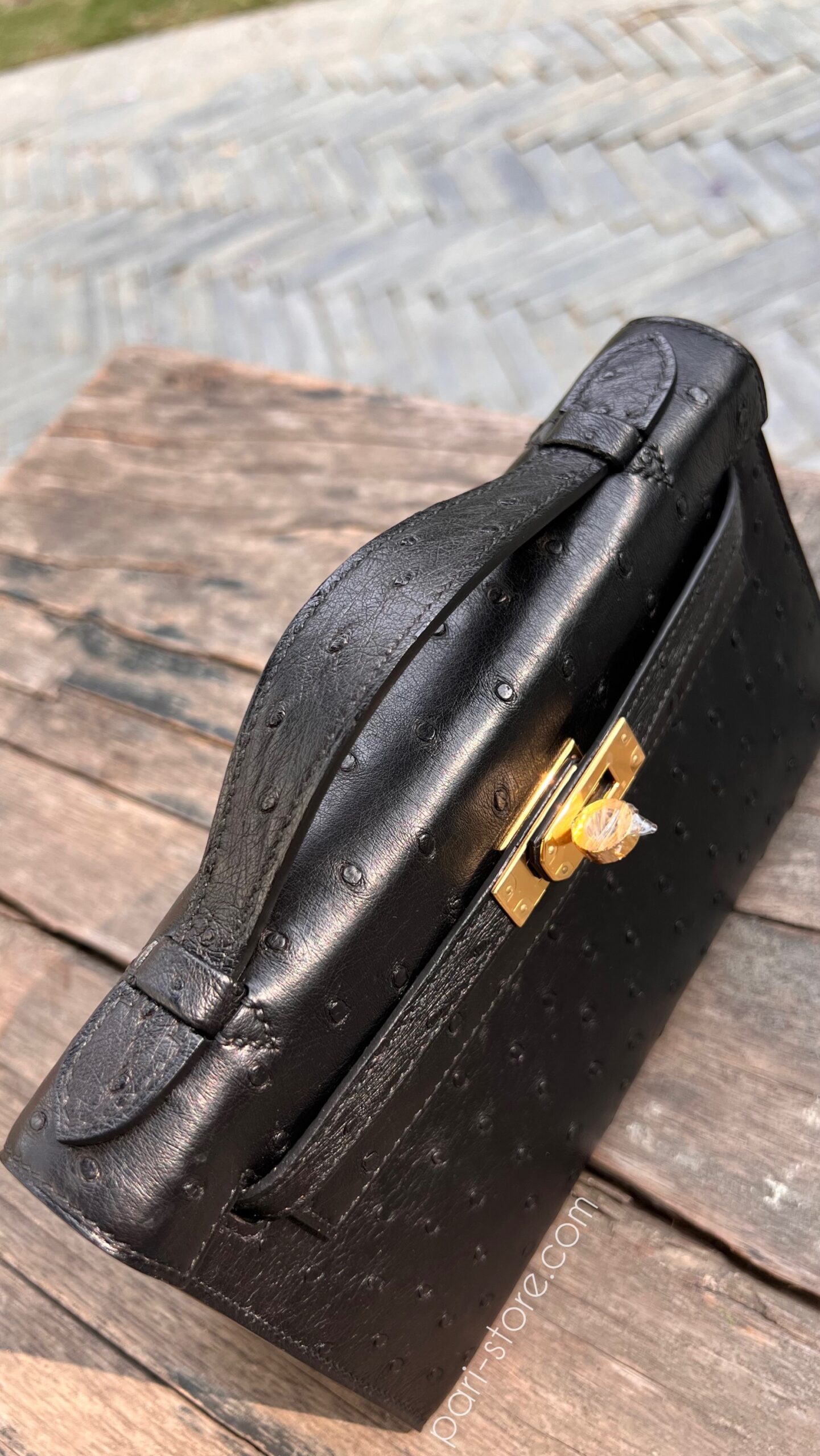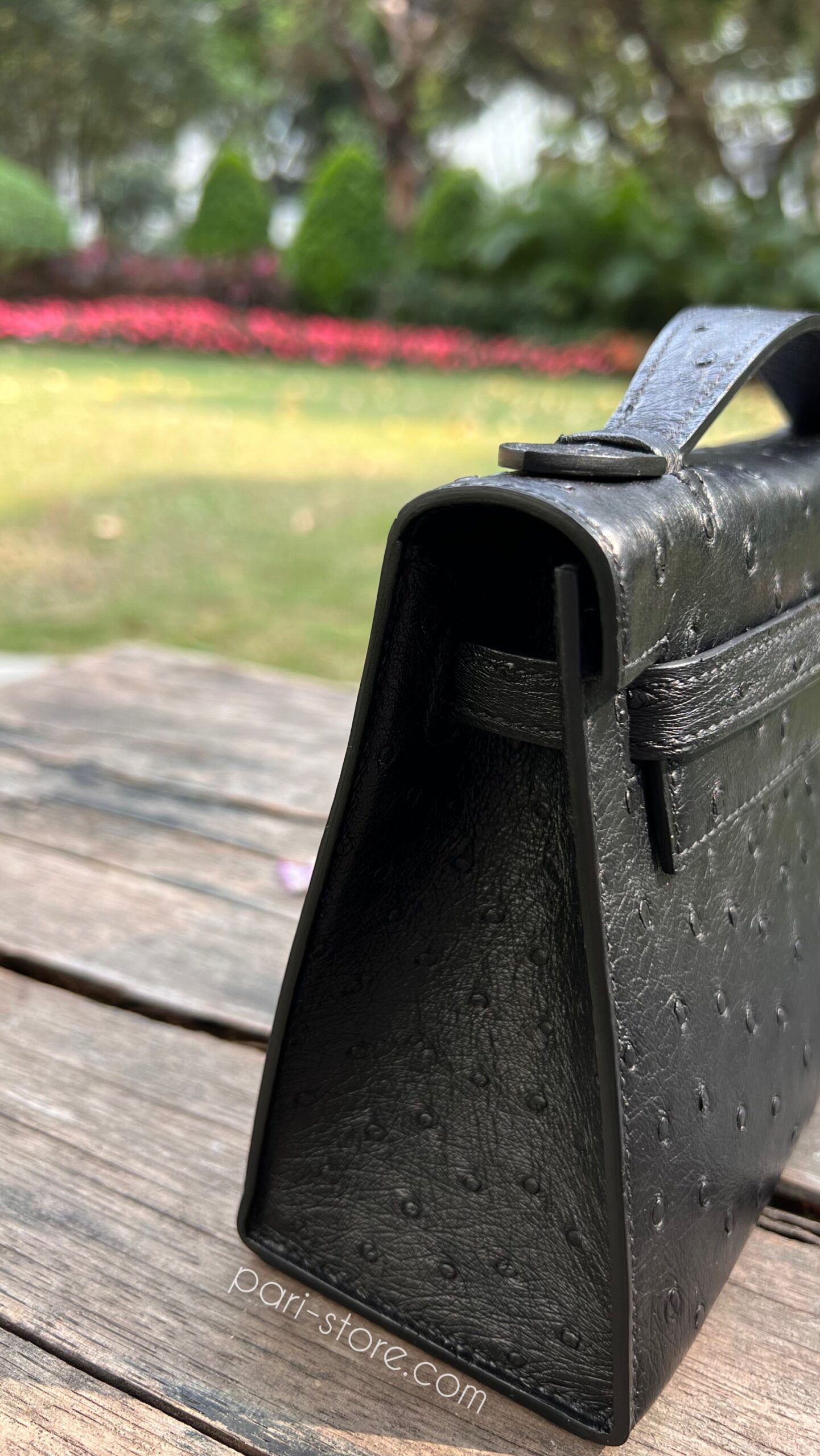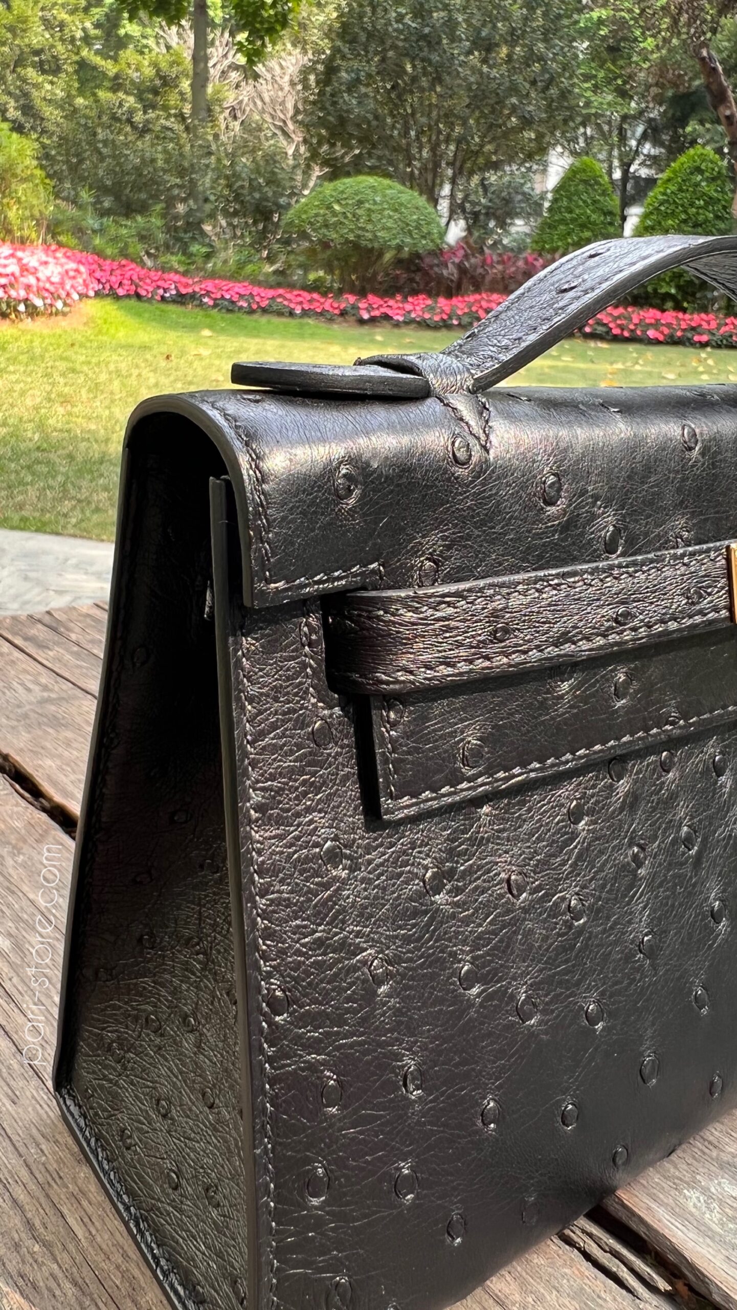 Kelly 22 in ostrich leather in black colour. Fully hand-sewn with beeswax thread. Gold hardware.