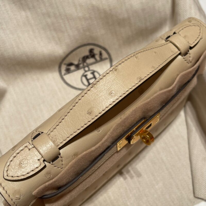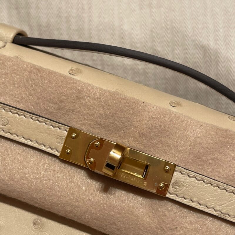 Kelly Pochette Generation South African Ostrich kk leather. 3C Wool White (Parchemin). Gold Buckle.