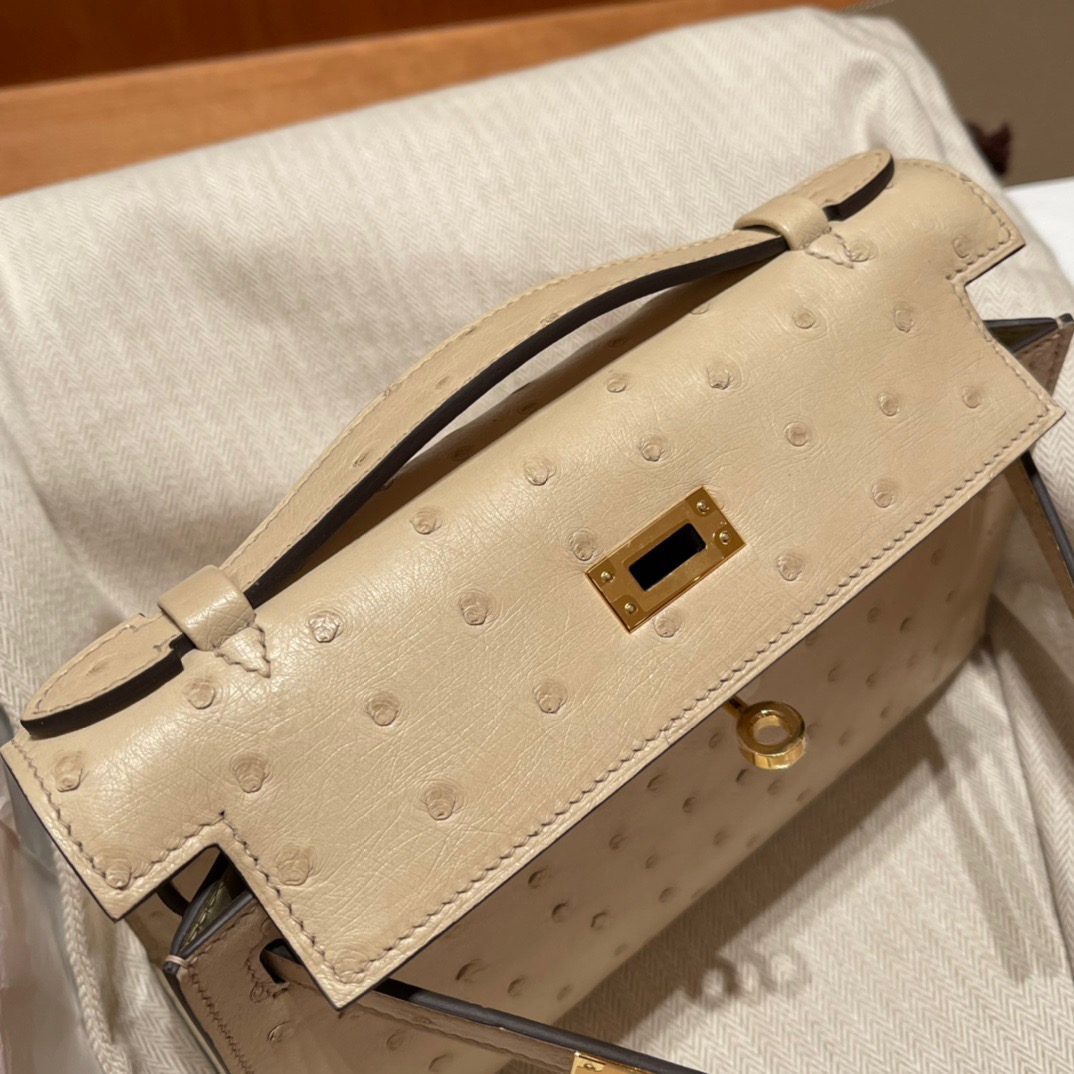 Kelly Pochette Generation South African Ostrich kk leather. 3C Wool White (Parchemin). Gold Buckle.