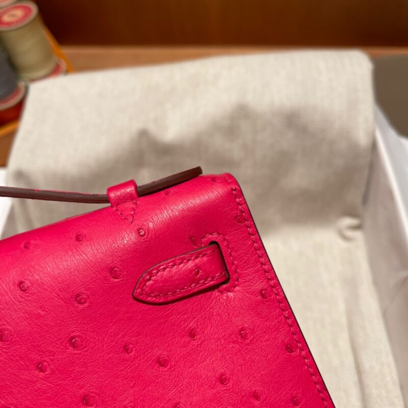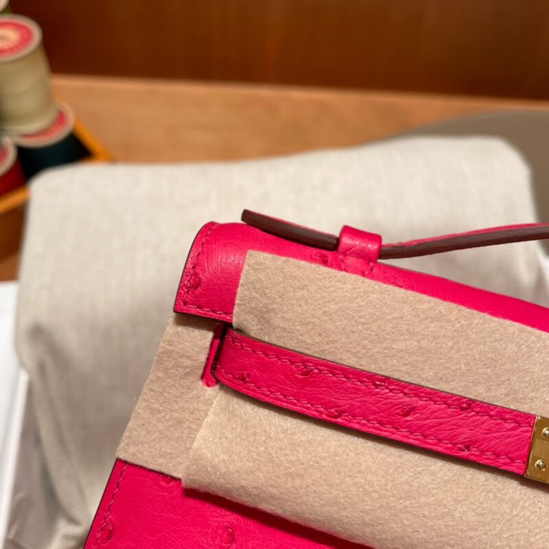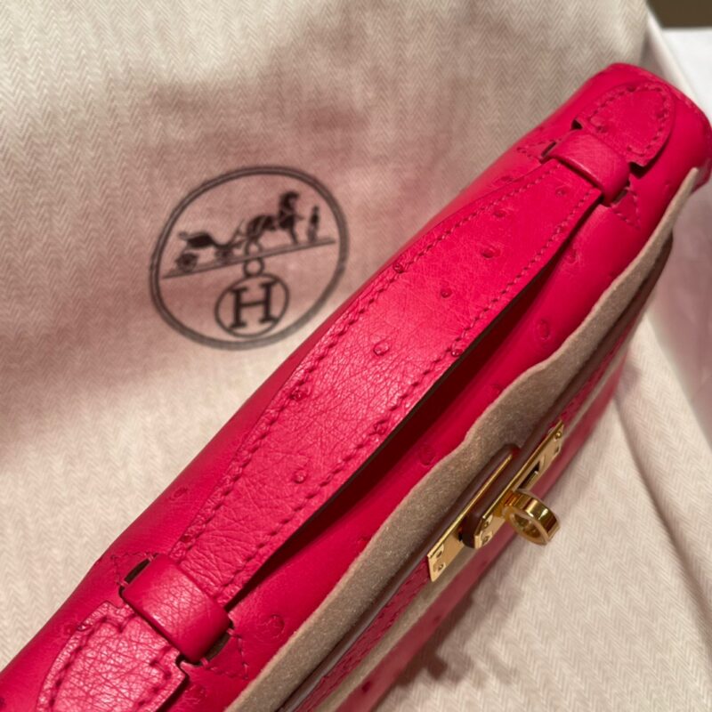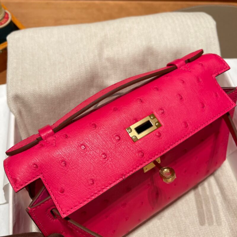 Kelly Pochette Generation South African Ostrich kk leather. E5 Candy Pink (Rose Tyrien). Gold Buckle.