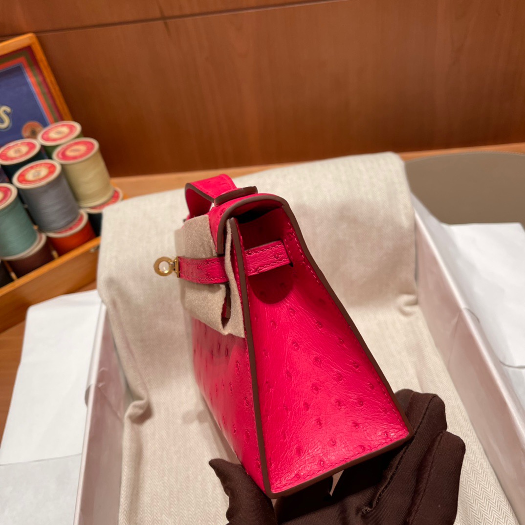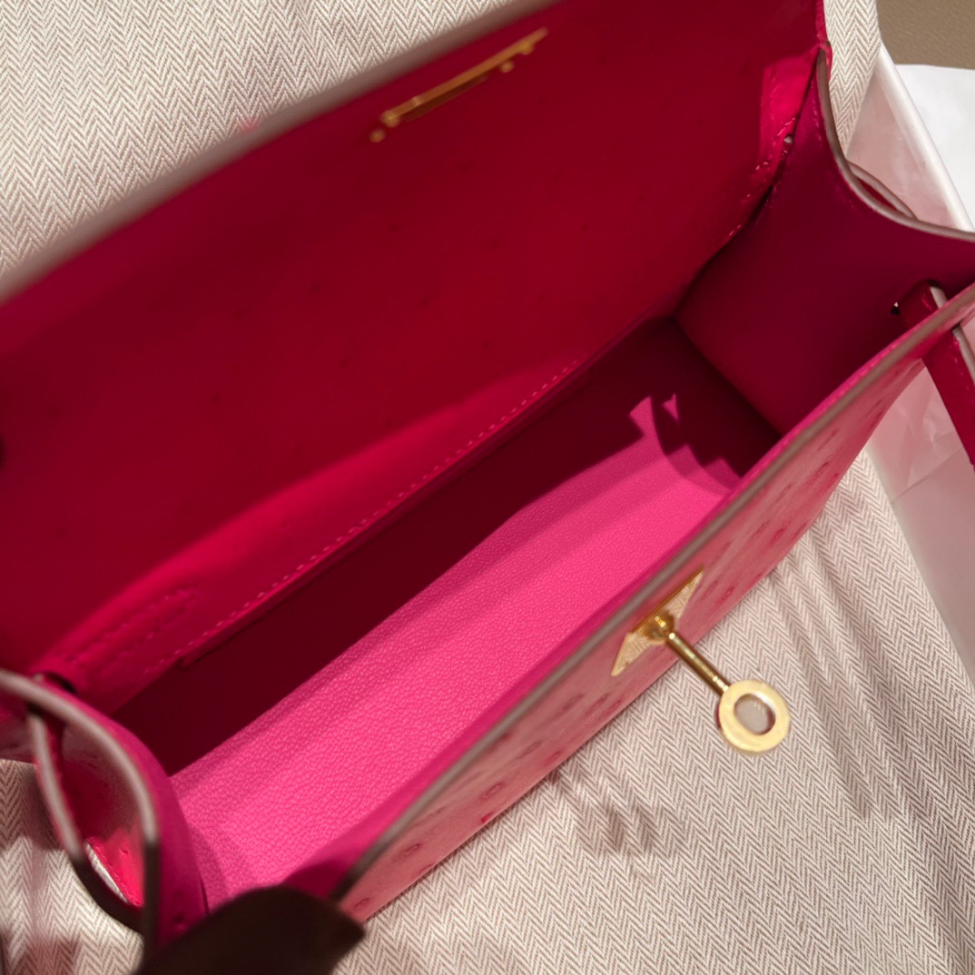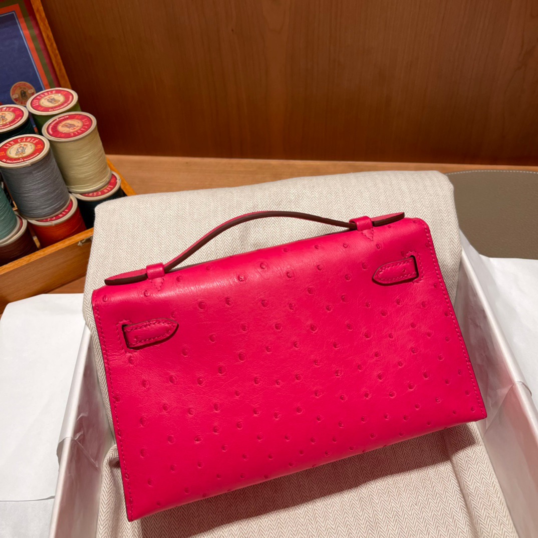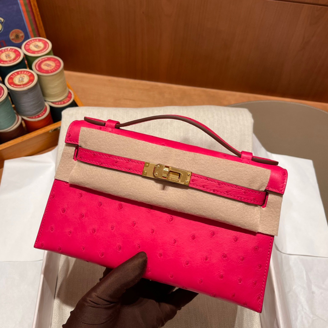 Kelly Pochette Generation South African Ostrich kk leather. E5 Candy Pink (Rose Tyrien). Gold Buckle.
